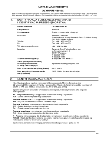KARTA CHARAKTERYSTYKI OLYMPUS 480 SC Karta charakterystyki zgodna z wymogami Rozporządzenia (WE) nr 1907/2006 Parlamentu Europejskiego i Rady z dnia 18 grudnia 2006 w sprawie REACH (Dziennik Urzędowy Unii Europejskiej L 396 ze zmianami w Dzienniku Urzędowym UE z 2007 r. nr L 136) 1. IDENTYFIKACJA SUBSTANCJI /PREPARATU I IDENTYFIKACJA PRZEDSIĘBIORSTWA Nazwa handlowa OLYMPUS 480 SC Kod produktu A14111B Zastosowanie Środek ochrony roślin - fungicyd Producent Telefon Fax SYNGENTA Limited Priestley Road, Surrey Research Park, Guildford Surrey GU2 7YH, Wielka Brytania. Tel.: +44 1 483 260 000 Fax: +44 1 483 260 001 Tel. alarmowy producenta +44 1 484 538 444 Importer Syngenta Crop Protection Sp. z o.o. ul. Powązkowska 44 C 01-797 Warszawa (0-22) 326 06 01 (0-22) 326 06 99 (0-22) 3260 777, 3416 777 Telefon alarmowy (24 h): 2. Adres poczty elektronicznej osoby odpowiedzialnej za kartę charakterystyki [email protected] Data opracowania wersji oryginalnej 03.12.2007 r. Data aktualizacji i sporządzenia wersji polskiej 29.07.2009 r. (lokalna aktualizacja) IDENTYFIKACJA ZAGROŻEŃ Klasyfikacja produktu zgodnie z przepisami Rozporządzenia Ministra Zdrowia z dnia 02 września 2003r w sprawie kryteriów i sposobu klasyfikacji substancji i preparatów chemicznych (Dz.U. nr 171, poz. 1666 ze zmianami w Dz. U. Nr 243, poz. 2440) Zgodnie z kryteriami przepisów w/w rozporządzenia produkt zaklasyfikowano jako preparat niebezpieczny Xn – Preparat szkodliwy z przypisanym określeniem rodzaju zagrożenia: R20 - Działa szkodliwie przez drogi oddechowe Preparat Rakotw. Kat. 3 z przypisanym określeniem rodzaju zagrożenia: R40 - Ograniczone dowody działania rakotwórczego Preparat drażniący z przypisanym określeniem rodzaju zagrożenia: R37 - Działa drażniąco na drogi oddechowe R41 - Ryzyko poważnego uszkodzenia oczu Preparat uczulający z przypisanym określeniem rodzaju zagrożenia: R43 - Może powodować uczulenie w kontakcie ze skórą N - Preparat niebezpieczny dla środowiska z przypisanym określeniem rodzaju zagrożenia: R50/53 - Działa bardzo toksycznie na organizmy wodne; może powodować długo utrzymujące się niekorzystne zmiany w środowisku wodnym Opakowania jednostkowe wymagają oznakowania ostrzegawczego - patrz pkt 15. 1/9 KARTA CHARAKTERYSTYKI OLYMPUS 480 SC 3. SKŁAD I INFORMACJA O SKŁADNIKACH azoksystrobina; (E)-2-{2-[6-(2-cyjanofenoksy)pirymidyn-4-yloksy]fenylo}-3-metoksyakrylan metylu Zawartość: Nr CAS: Nr WE: Nr indeksowy: Klasyfikacja: 6,6% 131860-33-8 607-256-00-8 T; R23 N; R50/53 chlorotalonil; tetrachloroizoftalonitryl Zawartość: Nr CAS: Nr WE: Nr indeksowy: Klasyfikacja: 32,8 % 1897-45-6 217-588-1 608-014-00-4 Rakotw. Kat. 3; R40 T+; R26 Xi; R37, R41 R43 N; R50/53 Glikol propylenowy Zawartość: Nr CAS: Nr WE: Nr indeksowy: Klasyfikacja: 1-5% 57-55-6 200-338-0 - Etoksylowany alkohol tłuszczowy Zawartość: Nr CAS: Nr WE: Nr indeksowy: Klasyfikacja: 1-5% Xn; R22 R41 Alkohol alkoksylowany; alfa-undecyl-omega-hydroksy-poli(oksy-1,2-etanodiyl), łańcuch rozgałęziony i prosty Zawartość: Nr CAS: Nr WE: Nr indeksowy: Klasyfikacja: 4. 1-5% 127036-24-2 Xn; R22 R41 PIERWSZA POMOC Uwagi ogólne W przypadku kontaktu z numerem alarmowym firmy Syngenta lub centrum ostrych zatruć należy mieć przy sobie pojemnik produktu, etykietę lub niniejszą kartę charakterystyki. Wdychanie Wyprowadzić osobę poszkodowaną na świeże powietrze. W przypadku zatrzymania lub nieregularnego oddechu zastosować sztuczne oddychanie. Zapewnić poszkodowanemu ciepło i warunki do odpoczynku. Natychmiast wezwać lekarza lub skontaktować się centrum ostrych zatruć i uzyskać poradę dotyczącą 2/9 KARTA CHARAKTERYSTYKI OLYMPUS 480 SC 4. PIERWSZA POMOC postępowania leczniczego. Skóra Natychmiast zdjąć zanieczyszczoną odzież. Zanieczyszczone miejsca dokładnie przemyć dużą ilością wody. W przypadku wystąpienia podrażnień wezwać pomoc medyczną. Wyprać odzież roboczą przed ponownym użyciem. Oczy Upewnić się, że poszkodowany nie nosi szkieł kontaktowych. Natychmiast przemywać oczy, przytrzymując odchylone powieki, przez kilkanaście minut (co najmniej 15 minut) czystą bieżącą wodą i natychmiast wezwać pomoc medyczną. Połknięcie NIE POWODOWAĆ wymiotów. Natychmiast wezwać pomoc medyczną – pokazać lekarzowi niniejszą kartę charakterystyki lub etykietę produktu. Informacje dla lekarza Odtrutka specyficzna nie jest znana. Stosować leczenie objawowe. 5. POSTĘPOWANIE W PRZYPADKU POŻARU Zalecane środki gaśnicze: Mniejsze pożary gasić za pomocą: rozpylonej wody, piany odpornej na działanie alkoholi, proszków gaśniczych lub dwutlenku węgla. Większe pożary gasić za pomocą: rozpylonej wody lub piany odpornej na działanie alkoholi. Nieodpowiednie środki gaśnicze: Zwarte prądy wodne (mogą rozprzestrzeniać pożar). Szczególne zagrożenie ze strony produktów spalania i wydzielających się gazów: Produkt zawiera składniki będące związkami organicznymi. Podczas pożaru może wydzielać się gęsty, czarny dym. Narażenie na działanie produktów spalania może być niebezpieczne dla zdrowia. Specjalne wyposażenie ochronne strażaków: Nosić aparaty oddechowe z niezależnym źródłem powietrza i kombinezony ochronne. Informacje dodatkowe: Zagrożone pojemniki chłodzić rozpyloną wodą. Ograniczyć przy pomocy obwałowania z ziemi możliwość rozprzestrzeniania się zużytych środków gaśniczych do kanalizacji i wód. 6. POSTĘPOWANIE W PRZYPADKU NIEZAMIERZONEGO UWOLNIENIA DO ŚRODOWISKA Indywidualne środki ostrożności: Nosić środki ochrony osobistej (patrz pkt 7 i 8). Środki ostrożności w zakresie ochrony środowiska: Zapobiegać powstawaniu dalszych wycieków (jeżeli to możliwe, bez ponoszenia ryzyka). Nie spłukiwać do wód powierzchniowych i kanalizacji. Metody oczyszczania /usuwania: Uwolniony produkt pochłaniać w niepalnym materiale pochłaniającym (piasek, ziemia, ziemia okrzemkowa, itp.) i zebrać do
