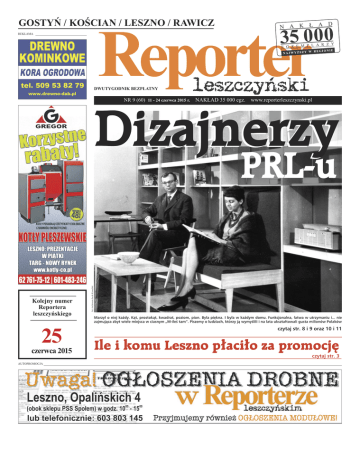 GOSTYŃ / KOŚCIAN / LESZNO / RAWICZ REKLAMA DWUTYGODNIK BEZPŁATNY NR 9 (60) 11 - 24 czerwca 2015 r. NAKŁAD 35 000 egz. www.reporterleszczynski.pl Dizajnerzy Kolejny numer Reportera leszczyńskiego 25 czerwca 2015 AUTOPROMOCJA fot. Archiwum Jacek Kowalski PRL-u Marzył o niej każdy. Kąt, prostokąt, kwadrat, poziom, pion. Była piękna. I była w każdym domu. Funkcjonalna, łatwa w utrzymaniu i... nie zajmująca zbyt wiele miejsca w ciasnym „M-ileś tam”. Piszemy o ludziach, którzy ją wymyślili i na lata ukształtowali gusta milionów Polaków czytaj str. 8 i 9 oraz 10 i 11 Ile i komu Leszno płaciło za promocję czytaj str. 3 2 Nr 9 (60) 11 - 24 czerwca 2015 r. 35 000 EGZEMPLARZY PROMOCJA Ratujmy wzrok naszym dzieciom Od 25 maja w salonie VISION OPTYK przy ul. Westerplatte w Lesznie trwa akcja „Ratujmy wzrok naszym dzieciom”, w ramach której małych pacjentów przyjmuje lekarz specjalista chorób oczu dzieci i noworodków. Z właścicielem salonu, mgr Dorotą Michalską-Wolniak, rozmawia Joanna Lubomirska Podczas akcji zgłosiło się wiele dzieci z podejrzeniem zeza. Zez jest formą zaburzeń widzenia obuocznego spowodowanych nieprawidłowym ustawieniem gałek ocznych. Jest on jednym z najczęstszych schorzeń narządu wzroku u dzieci. Ważne jest, by leczenie zeza rozpocząć jak najszybciej, aby u dziecka prawidłowo wykształciło się widzenie przestrzenne. Skąd bierze się ta wada? Oko porusza siedem mięśni gałki ocznej. Jeżeli mięśnie te pozostają w równowadze, obie gałki oczne REKLAMA zawsze ustawiają się równolegle, a w czasie ruchu poruszają się zgodnie w różnych kierunkach. Prawidłowe ustawienie obu gałek ocznych powoduje, że obraz przedmiotu pada równocześnie na odpowiednią część siatkówki w obu oczach. W zezie następuje rozkojarzenie tych funkcji i koordynacji widzenia. Przy patrzeniu na jakiś przedmiot tylko jedno oko ustawione jest prawidłowo, drugie odchyla się, gdyż jeden lub kilka mięśni wykazuje przewagę czynnościową. W wyniku odchylenia gałki ocznej od osi optycznej obraz powstaje na siatkówce zezującego oka w nie- prawidłowym miejscu, co powoduje, że jest on nieostry. Poza tym obraz odbierany przez ośrodki nerwowe z różnych części siatkówki obu oczu jest podwójny. Takie zaburzenia uniemożliwiają wykształcenie się u dziecka fuzji, czyli procesu umożliwiającego złączenie dwóch obrazów odbieranych przez oczy w jeden. Co może być konsekwencją zeza? Zez prowadzi do obniżonej ostrości widzenia i niedowidzenia jednoocznego. Jest to spowodowane tym, że obraz powstający w niewłaściwym miejscu siatkówki jest nieprawidłowy i jest on tłumiony w celu uniknięcia dwojenia. Zaburzenia widzenia obuocznego powodują niemożliwość wykształcenia widzenia przestrzennego. Zez niewyleczony w dzieciństwie w życiu dorosłym uniemożliwia podjęcie pracy w wielu zawodach. Poza tym stanowi poważny problem estetyczny. Jakie są przyczyny powstawania zeza u dzieci? Główne przyczyny to wady wzroku, w szczególności słaba ostrość widzenia jednego oka, a także choroby zakaźne, choroby ośrodkowego układu nerwowego, urazy lub zatrucia. Zezowi może towarzyszyć nadwzroczność, krótkowzroczność lub astygmatyzm. Kiedy rodzice po winni zgłosić się do okulisty? U noworodków czy niemowląt, u których zauważono odchylanie się oka od prawidłowej osi, należy bezwzględnie przeprowadzić badanie okulistyczne. Jest to konieczne do wykluczenia wady wrodzonej oka czy chorób nabytych jako przyczyny zeza. Jeżeli zez jest spowodowany zaburzeniami ostrości wzroku, czasem już u niemowląt konieczna jest korekcja wady wzroku. Nie wolno odkładać badań diagnozujących zeza na okres późniejszy, gdyż w niektórych postaciach tej choroby może szybko powstać niedowidzenie. O terminie leczenia zeza powinien zadecydować wyłącznie lekarz okulista: czy można jeszcze czekać, czy rozpocząć leczenie. Na jakie pytania ze strony specjalisty chorób oczu u dzieci powinni być przygotowani rodzice? Będą to pytania dotyczące czasu zezowania, czyli od kiedy dziecko zezuje; czy zez wystąpił nagle, czy stopniowo; czy „uciekanie oczka” obserwuje się okresowo, czy stale; które oko więcej i częściej zezuje. Lekarz zapyta również o przebieg porodu, a także o to, czy odchylanie się oczka pojawiło się po jakiejś chorobie (np. infekcji wirusowej), bądź po urazie. Istotne są również informacje o aktualnych i przebytych chorobach neurologicz- nych i laryngologicznych malca. Jak wygląda leczenie zeza u dzieci? Leczenie zeza powinno być przeprowadzone jak najwcześniej, ponieważ proces widzenia obuocznego wykształca się do szóstego roku życia. Wczesna terapia daje dużą szansę na przywrócenie prawidłowego ustawienia oczu i wykształcenie widzenia przestrzennego. Leczenie uzależnione jest od przyczyny wywołującej zeza. Przy wadach wzroku polega ono na zlikwidowaniu ewentualnego niedowidzenia poprzez stosowanie odpowiednio dobranych szkieł korekcyjnych. W celu wytworzenia widzenia obuocznego i przywrócenia prawidłowego ustawienia oczu, stosuje się wyłączanie zdrowego oka, najczęściej poprzez zasłanianie go. Leczenie takie wspomagane jest przez ćwiczenia ortoptyczne. W razie nieskuteczności takiej terapii czasami wykonuje się zabieg operacyjny przywracający równowagę mięśniową. Wyleczenie zeza po 10 roku życia jest bardzo trudne i sprowadza się zwykle do zabiegu operacyjnego przywracającego prawidłowe ustawienie gałek ocznych. Wówczas jednak przywrócenie widzenia obuocznego jest raczej rzadkie. W przypadku zeza porażennego leczeniem powinien zająć się również neurolog. Który moment, w przypadku niemowląt, powinien rodziców wyczulić na obserwację dziecka pod kątem zeza? Niemowlę w 2-3 miesiącu życia zaczyna wodzić oczami za przedmiotami i wykazywać zainteresowania przedmiotami w ruchu, a od czwartego miesiąca występuje prawidłowa fik