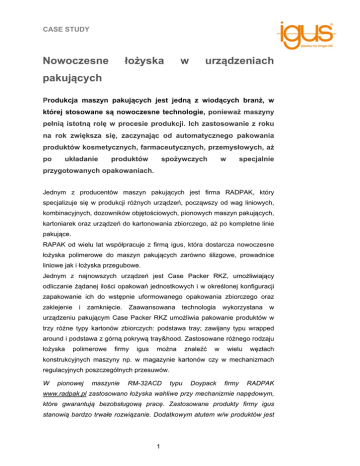 CASE STUDY Nowoczesne łożyska w urządzeniach pakujących Produkcja maszyn pakujących jest jedną z wiodących branż, w której stosowane są nowoczesne technologie, ponieważ maszyny pełnią istotną rolę w procesie produkcji. Ich zastosowanie z roku na rok zwiększa się, zaczynając od automatycznego pakowania produktów kosmetycznych, farmaceutycznych, przemysłowych, aż po układanie produktów spożywczych w specjalnie przygotowanych opakowaniach. Jednym z producentów maszyn pakujących jest firma RADPAK, który specjalizuje się w produkcji różnych urządzeń, począwszy od wag liniowych, kombinacyjnych, dozowników objętościowych, pionowych maszyn pakujących, kartoniarek oraz urządzeń do kartonowania zbiorczego, aż po kompletne linie pakujące. RAPAK od wielu lat współpracuje z firmą igus, która dostarcza nowoczesne łożyska polimerowe do maszyn pakujących zarówno ślizgowe, prowadnice liniowe jak i łożyska przegubowe. Jednym z najnowszych urządzeń jest Case Packer RKZ, umożliwiający odliczanie żądanej ilości opakowań jednostkowych i w określonej konfiguracji zapakowanie ich do wstępnie uformowanego opakowania zbiorczego oraz zaklejenie i zamknięcie. Zaawansowana technologia wykorzystana w urządzeniu pakującym Case Packer RKZ umożliwia pakowanie produktów w trzy różne typy kartonów zbiorczych: podstawa tray; zawijany typu wrapped around i podstawa z górną pokrywą tray&hood. Zastosowane różnego rodzaju łożyska polimerowe firmy igus można znaleźć w wielu węzłach konstrukcyjnych maszyny np. w magazynie kartonów czy w mechanizmach regulacyjnych poszczególnych przesuwów. W pionowej maszynie RM-32ACD typu Doypack firmy RADPAK www.radpak.pl zastosowano łożyska wahliwe przy mechanizmie napędowym, które gwarantują bezobsługową pracę. Zastosowane produkty firmy igus stanowią bardzo trwałe rozwiązanie. Dodatkowym atutem w/w produktów jest 1 CASE STUDY ich cicha praca oraz niskie współczynniki tarcia w pracy na sucho - twierdzi Dyrektor Techniczny firmy RADPAK Marcin Ligowski. Zastosowane aplikacje łożyskowe igubal firmy igus są bardzo lekkie, dlatego w znaczny sposób obniżają masę aplikacji, wymagają mało miejsca montażowego, dzięki swoim wymiarom. Wysokowydajne, polimerowe łożyska ślizgowe firmy igus są idealnym rozwiązaniem dla producentów maszyn pakujących, ponieważ nie wymagają smarowania i są odporne na korozję, co zwiększa wydajność i skraca czas obsługi urządzeń, a przy tym są bardzo ekonomiczne. Łożyska polimerowe są odporne na środki chemiczne stosowane przy myciu urządzeń pakujących, szczególnie w branży spożywczej, która musi spełniać normy czystości. Mają one doskonałe właściwości tłumiące wibracje, są niewrażliwe na brud, mogą pracować w cieczach, a nawet w agresywnych chemikaliach. Właściwości łożysk polimerowych idealnie sprawdzają się zarówno w aplikacjach pracujących na sucho jak i w środowisku wilgotnym. . KONTAKT PRASOWY: igus® Sp. z o.o. ul. Dzialkowa 121 C 02 -234 Warszawa Tel.: 22 863 57 70 Faks: 22 863 61 69 [email protected] www.igus.pl O firmie igus: Firma igus jest czołowym światowym producentem systemów prowadzenia przewodów i polimerowych łożysk ślizgowych. To rodzinne przedsiębiorstwo z siedzibą w Kolonii ma swoje oddziały w 35 krajach i zatrudnia około 2400 pracowników na całym świecie. W 2013 roku firma igus wygenerowała obroty rzędu 427 milionów euro. igus ma największe w swojej branży laboratoria badań i fabryki, dzięki czemu może w bardzo krótkim czasie zaoferować klientom innowacyjne i dostosowane do ich potrzeb produkty i rozwiązania. The terms ‘igus, e-ketten, e-kettensysteme, chainflex, readycable, easychain, e-chain, e-chainsystems, energy chain, energy chain system, flizz, readychain, robolink, pikchain, triflex, twisterchain, invis, drylin, iglidur, igubal, xiros, xirodur, plastics for longer life, CFRIP, dryspin, manus and vector’ are protected by trademark laws in the Federal Republic of Germany and internationally, where applicable. 2