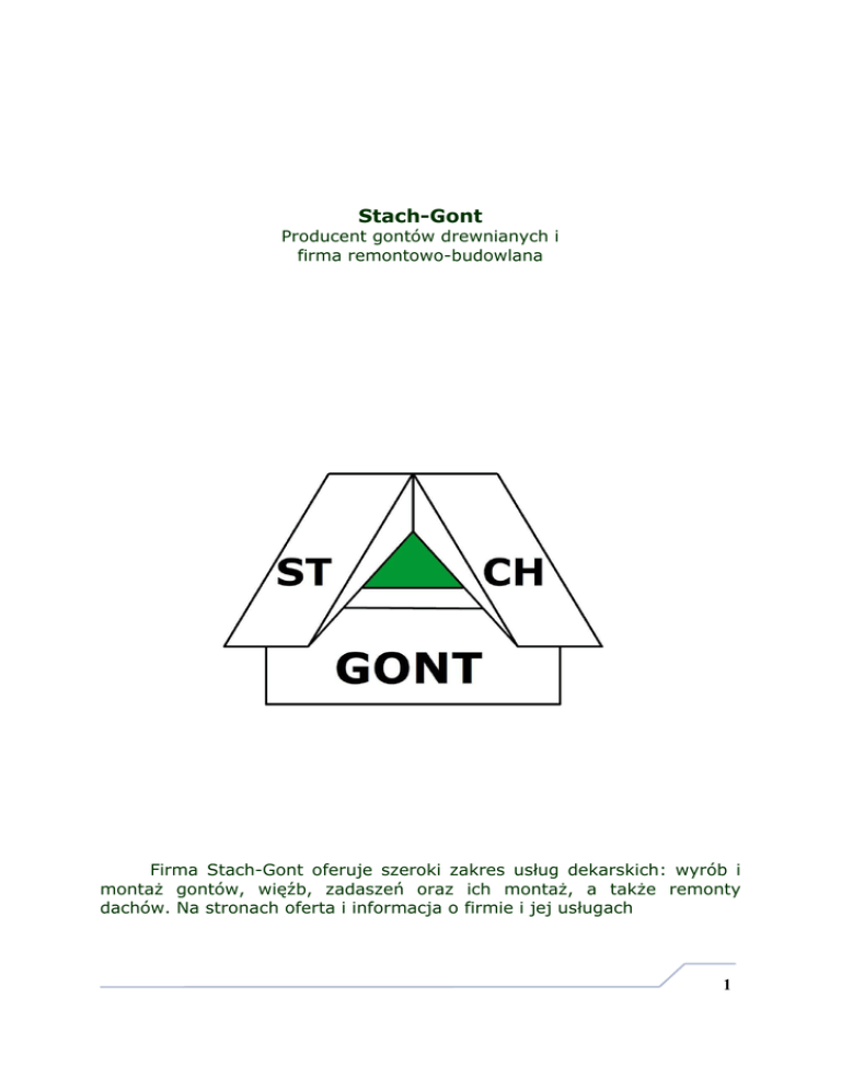 Stach-Gont Producent gontów drewnianych i firma remontowo-budowlana Firma Stach-Gont oferuje szeroki zakres usùug dekarskich: wyrób i monta¿ gontów, wiêêb, zadaszeñ oraz ich monta¿, a tak¿e remonty dachów. Na stronach oferta i informacja o firmie i jej usùugach 1 Historia i Tradycja firmy Firma "Stach-Gont" jest samodzieln¹ dziaùalnoœci¹ gospodarcz¹ prowadzon¹ przez osobê fizyczn¹. Firma ta dziaùa od 10 paêdziernika 1997 roku. Oferuje szeroki zakres usùug dekarskich: podstawow¹ dziaùalnoœci¹ jest wyrób i monta¿ gontów, drugorzêdn¹ wyrób wiêêb, zadaszeñ oraz ich monta¿, a tak¿e remonty dachów: malowanie, konserwacja, ocieplanie poddaszy. Rodzinna tradycja wykonywania gontów siêga ju¿ kilku pokoleñ i wraz z biegiem lat mo¿na zauwa¿yã coraz wiêksze zainteresowanie tego typu pokryciem dachowym, dziêki temu, ¿e we wspóùczesnym œwiecie zapanowaùa "moda na stare". Coraz bardziej zaczyna siê doceniaã dawny styl i ekologiczne pochodzenie produktu. Osi¹gniêcia "Stach-Gont" jest najwiêkszym producentem gontów w powiecie nowotarskim. Naturalny surowiec, czyli drewno najwy¿szej jakoœci (jodùa i œwierk) pochodzi z terenów maùopolski. Gwarantujemy solidnoœã, terminowe i fachowe wykonawstwo, pomoc techniczn¹, doradztwo oraz transport. Opinia Zdaniem dr in¿. Stanisùawa Karczmarczyka gonty mog¹ byã bezpieczne i niezawodnie eksploatowane nawet przez 50 lat. Jest to mo¿liwe dziêki odpowiedniej technologii oraz temu, i¿ w ostatnich latach miaù miejsce znaczny postêp w rozwoju œrodków do ochrony drewna. Okolice Krakowa, Poznania, Gdañska czy Warszawy szczególnie poddaùy siê modzie na metamorfozy starych domów. Zakup starych domów, dworków wi¹¿e siê czêsto z ich remontem oraz dokonaniem oryginalnych zmian, aby doprowadziã budynek do dawnej œwietnoœci. 2 Oferta produkcyjna Produkujemy gonty drewniane: -Surowiec: jodùa, œwierk, na ¿yczenie klienta tak¿e modrzew -Dùugoœã: standard 60 cm, na ¿yczenie klienta mog¹ byã krótsze b¹dê dùu¿sze (Rys.1) -Szerokoœã: 7-14 cm -Gruboœã: 2,5cm w najgrubszym miejscu (Rys.2) -Zu¿ycie: przy dubeltowym uùo¿eniu ok.60szt./1 m2 (Rys.3) -Pakowanie: po 60 szt. = tzw. kopa (Rys.4) -Rozmiary kopy: œrednica 34-37 cm, dùugoœã 60 cm -Ciê¿ar: 25- 30 kg Rys.1 Rys.2 Rys.3 Rys.4 3 Oferta remontowo-budowlana Firma "Stach-Gont" to nie tylko producent gontów, ale i firma budowlana ciesz¹ca siê ju¿ dùugoletnim zaufaniem. Wykonujemy: - monta¿ gontów wraz z peùn¹ obróbk¹ dachów monta¿ wiêêb - tak¿e na obiektach zabytkowych malowanie i konserwacje dachów kompleksowe wykoñczenie wnêtrz drewnie monta¿ okien i drzwi ocieplanie strychów podprzybitki, boazerie nietypowe (szerokie) stolarstwo ogólne wszelkie prace w drewnie ogrodzenia, bramy, altanki gùadzie gipsowe 4 Referencje ROK 1998 - Koœcióù Rzymsko-Katolicki w PACZÓ£TOWICACH (k. Racùawic i Olkusza) - Koœcióù Rzymsko-Katolicki w OKSIE (k. Jêdrzejowic) - Koœcióù Rzymsko-Katolicki w BUSKU ZDROJU - Koœcióù Rzymsko-Katolicki w ZAGOÚCIU (k. Buska Zdroju) ROK 1999 - Koœcióù p.w. Úw. Michaùa Archanioùa KOÑCZYCE WIELKIE ul. Koœcielna 20, 43-416, k. Cieszyna - Koœcióù p.w. Úw. Piotra i Pawùa w PANIOWACH ul. Staromiejska 91, 43-197 Mikoùów 5 Paniowy ROK 2000 - PTTK Zarz¹d Oddziaùu im. dr M. Osùowicza ul. Sanatoryjna 1, 57-514 MIÆDZYGÓRZE Ogród Bajek - Gmina D¥BROWA GÓRNICZA ul. Koœciuszki 25 - Kapliczka Úw. Katarzyny w Ujejscach - Koœcióù p.w. Úw. Trójcy RYPIN ul. Jana Pawùa II, 87-500 - Koœcióù p.w. Úw. Bartùomieja Apostoùa JERZMANOWICE 254, 32-048 ROK 2001 - Koœcióù p.w. Matki Koœcioùa PRZES£AWICE 83, 32-200 Miechów - „Ober¿a Biesisko” Przysùup, 38-608 Wetlina 5 ROK 2002 - Koœcióù p.w. Úw. Jana Chrzciciela ZAGOÚÃ, 28-407 Gacki - Koœcióù p.w. Narodzenia NMP WALISZEW k. Bielaw, 99-425 - Koœcióù p.w. Úw. Michaùa Archanioùa KOÑCZYCE WIELKIE ul. Koœcielna 20, 43-416 (k. Cieszyna) - Urz¹d Gminy TWORÓG ul. Zamkowa 16 ROK 2003 - Koœcióù p.w. NMP Bolesnej GIDLE ul. Kartuzka 97, 97-540 - Koœcióù p. w.Úw. Barbary i Úw. Józefa JASTRZÆBIE ZDRÓJ 44-335 ul.Ks.bpa H. Bednorza 1a - Baùtycka Galeria Sztuki Wspóùczesnej Baszta Czarownic S£UPSK ul. Fr. Nullo 8 - Parafia Rzymsko-Katolicka w MAZEWIE, 99-107 DASZYNA, Diecezja £owicka - Parafia Rzymsko-Katolicka p.w. Úw. Brata Alberta BUSKO ZDRÓJ, ul. Lipowa 1, 28-100 - Zabytkowy Koœcióù w Chotelku Zielonym - Przedsiêbiorstwo „Magnus” PABIANICE, ul. Warszawska 72, 95-200 ROK 2004 - Zabytkowy dwór i oficyna SANDOMIERZ ul. Zawichojska 2 - Koœcióù p.w. Wszystkich Úwiêtych JASTRZÆBIE ZDRÓJ SZEROKA ul. Powstañców Úl¹skich 109 - Parafia Rzymsko Katolicka p.w. Zwiast. NMP £¥CKO (k. Jarosùawca) - Koœcióù p.w. Úw. Maùgorzaty Gorzków, 28-500 Kazimierza Wielka - Koœcióù p.w. Úw. Onufrego Wisùok Wielki 66, 38-544 ROK 2005 - Restauracja „Ogniem i mieczem” BYDGOSZCZ ul. Ogiñskiego 22, 85- 092 6 Stanisùaw Mo¿d¿eñ „Stach-Gont” 34-722 Podwilk 254 woj.maùopolskie www.gonty.iap.pl [email protected] tel/fax (018) 28-529-12 REGON: 490 77 49 11 NIP: 735 195 20 89 Bank Spóùdzielczy Jabùonka 34 8798 0002 0000 0003 7862 0001 Created by Laboratory 7