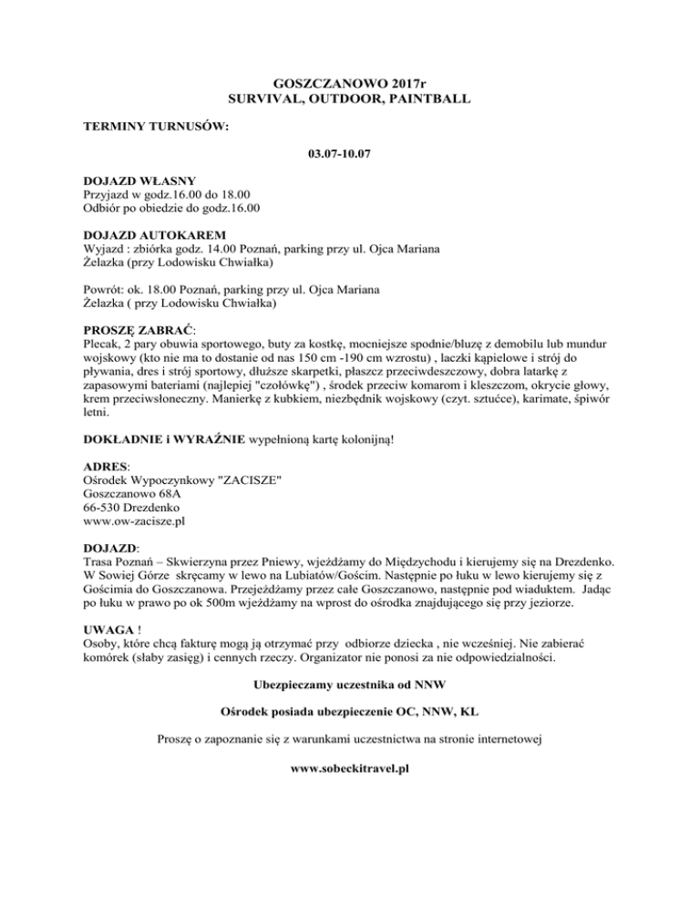 GOSZCZANOWO 2017r SURVIVAL, OUTDOOR, PAINTBALL TERMINY TURNUSÓW: 03.07-10.07 DOJAZD WŁASNY Przyjazd w godz.16.00 do 18.00 Odbiór po obiedzie do godz.16.00 DOJAZD AUTOKAREM Wyjazd : zbiórka godz. 14.00 Poznań, parking przy ul. Ojca Mariana Żelazka (przy Lodowisku Chwiałka) Powrót: ok. 18.00 Poznań, parking przy ul. Ojca Mariana Żelazka ( przy Lodowisku Chwiałka) PROSZĘ ZABRAĆ: Plecak, 2 pary obuwia sportowego, buty za kostkę, mocniejsze spodnie/bluzę z demobilu lub mundur wojskowy (kto nie ma to dostanie od nas 150 cm -190 cm wzrostu) , laczki kąpielowe i strój do pływania, dres i strój sportowy, dłuższe skarpetki, płaszcz przeciwdeszczowy, dobra latarkę z zapasowymi bateriami (najlepiej "czołówkę") , środek przeciw komarom i kleszczom, okrycie głowy, krem przeciwsłoneczny. Manierkę z kubkiem, niezbędnik wojskowy (czyt. sztućce), karimate, śpiwór letni. DOKŁADNIE i WYRAŹNIE wypełnioną kartę kolonijną! ADRES: Ośrodek Wypoczynkowy "ZACISZE" Goszczanowo 68A 66-530 Drezdenko www.ow-zacisze.pl DOJAZD: Trasa Poznań – Skwierzyna przez Pniewy, wjeżdżamy do Międzychodu i kierujemy się na Drezdenko. W Sowiej Górze skręcamy w lewo na Lubiatów/Gościm. Następnie po łuku w lewo kierujemy się z Gościmia do Goszczanowa. Przejeżdżamy przez całe Goszczanowo, następnie pod wiaduktem. Jadąc po łuku w prawo po ok 500m wjeżdżamy na wprost do ośrodka znajdującego się przy jeziorze. UWAGA ! Osoby, które chcą fakturę mogą ją otrzymać przy odbiorze dziecka , nie wcześniej. Nie zabierać komórek (słaby zasięg) i cennych rzeczy. Organizator nie ponosi za nie odpowiedzialności. Ubezpieczamy uczestnika od NNW Ośrodek posiada ubezpieczenie OC, NNW, KL Proszę o zapoznanie się z warunkami uczestnictwa na stronie internetowej www.sobeckitravel.pl