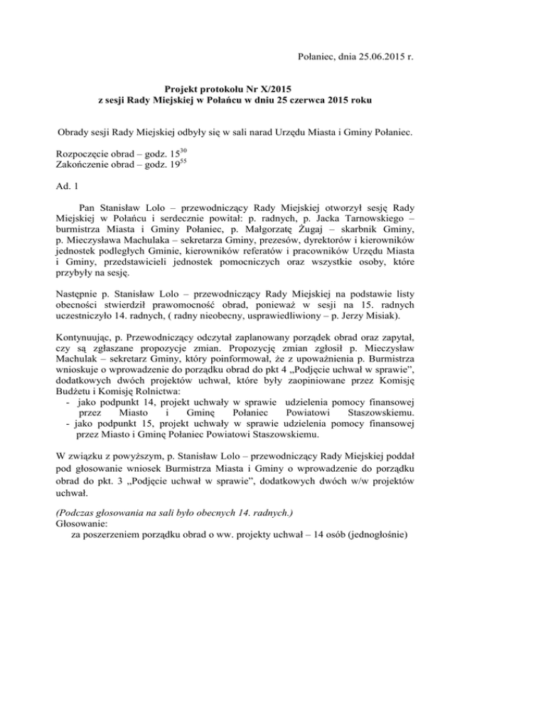 Połaniec, dnia 25.06.2015 r. Projekt protokołu Nr X/2015 z sesji