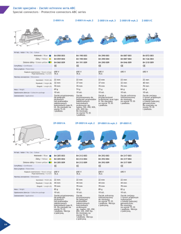 Zaciski specjalne · Zaciski ochronne seria ABC Special connectors · Protective connectors ABC series Z-0001/A Z-0001/Awyk.2 Z-0001/Awyk.3 Z-0001/Bwyk.2 Z-0001/C Nr kat.- kolor / No. Cat.- Colour Niebieski / Blue 84058003 84190003 84290003 84087003 84072003 Żółty / yellow 84059004 84190004 84290004 84087004 84126004 Zielono-żółty / Green-yellow 84060009 84191009 84290009 84046009 84210009 690 V 76 A 690 V 76 A 690 V 76 A 690 V 690 V Certyfikaty / Certificates Dane prądowe / Rated data Napięcie znamionowe / Rated voltage Prąd znamionowy / Current Wymiary zewnętrzne / Dimensions Szerokość / Width (A) 22 mm 22 mm 22 mm 22 mm 22 mm Wysokość / Height (B) 32 mm 37 mm 37 mm 32 mm 40 mm Długość / Lenght (C) 70 mm 70 mm 70 mm 70 mm 70 mm 69 g 74 g 72 g 66 g 65 g Masa / Weight Opakowanie zbiorcze / Collective package 10 szt. 10 szt. 10 szt. 10 szt. 10 szt. Zastosowanie / Application Zacisk przystosowany do połączeń drutowych lub przewodów zakończonych końcówkami typu H, Hi. Do montażu na szynie TS 35 i podłoża. Zacisk przystosowany do połączeń przewodów zakończonych końcówkami oczkowymi np. typów: kO, kW, kOi, LOi, kWi itp. Do montażu na szynie TS 35 i podłoża. Zacisk z przyłączeniami oczkowymi oraz typu H. Do montażu na szynie TS 35 i podłoża. Zacisk ochronny wielootworowy do montażu na szynie TS 35 i podłoża. Zacisk zwijany z torem prądowym wykonanym z miedzi pokrytej galwanicznie. Do montażu na szynie TS 35 i podłoża. ZP-0001/A ZP-0001/Awyk.2 ZP-0001/Awyk.3 ZP-0001/C Nr kat.- kolor / No. Cat.- Colour Niebieski / Blue 84205003 84212003 84292003 84217003 Żółty / yellow 84205004 84212004 84292004 84217004 Zielono-żółty / Green-yellow 84205009 84212009 84292009 84217009 690 V 76 A 690 V 76 A 690 V 76 A 690 V Certyfikaty / Certificates Dane prądowe / Rated data Napięcie znamionowe / Rated voltage Prąd znamionowy / Current Wymiary zewnętrzne / Dimensions Szerokość / Width (A) 22 mm 22 mm 22 mm 22 mm Wysokość / Height (B) 44 mm 44 mm 44 mm 44 mm Długość / Lenght (C) Masa / Weight 64 70 mm 70 mm 70 mm 70 mm 85 g 92 g 89 g 82 g Opakowanie zbiorcze / Collective package 10 szt. 10 szt. 10 szt. 10 szt. Zastosowanie / Application Zacisk przystosowany do połączeń drutowych lub przewodów zakończonych końcówkami typu H, Hi. Do montażu na szynie TS 35 i podłoża. Wersja z pokrywą. Zacisk przystosowany do połączeń przewodów zakończonych końcówkami oczkowymi np. typów: kO, kW, kOi, LOi, kWi itp. Do montażu na szynie TS 35 i podłoża. Wersja z pokrywą Zacisk ochronny wielootworowy do montażu na szynie TS 35 i podłoża. Wersja z pokrywą. Zacisk zwijany z torem prądowym wykonanym z miedzi pokrytej galwanicznie. Do montażu na szynie TS 35 i podłoża. Wersja z pokrywą.