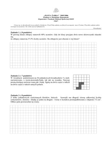 „ZŁOTA ŻABKA” 2005/2006 Konkurs w Dziedzinie Matematyki Organizator: Fundacja Edukacji Społecznej EKOS etap I Cieszę się, że zdecydowałeś się na udział w Konkursie. Przed Tobą zadania, na których rozwiązanie masz 45 minut. Wszystkie zadania należy rozwiązać na tej kartce. Nie wolno używać kalkulatorów. Powodzenia! Zadanie 1. ( 8 punktów) W pewnej klasie chłopcy stanowili 40% uczniów. Gdy do klasy przyjęto dwie nowe dziewczynki okazało się, że chłopcy stanowią 37,5% liczby uczniów. Ilu chłopców jest obecnie w tej klasie? Zadanie 2. ( 7 punktów) W kwadracie podzielonym na 36 jednakowych kwadracików 5 z nich zacieniowano, a reszta pozostała biała, tak jak na rysunku. Narysuj prostą dzielącą zarówno szarą jak i białą figurę na dwie części o takich na dwie części o takich samych polach. Zadanie 3. ( 8 punktów) Z kilku jednakowych sześciennych klocków, których krawędź ma długość równą całkowitej liczbie centymetrów, ułożono - kładąc je jeden na drugim - wieżę w kształcie prostopadłościanu o objętości 72 cm3. Oblicz pole powierzchni tej wieży. Zadanie 4. ( 8 punktów) Na prostej zaznaczono pewną liczbę punktów. Następnie pomiędzy każdymi dwoma sąsiednimi punktami zaznaczono punkt. Operację wstawiania punktów pomiędzy dwa sąsiednie powtórzono jeszcze dwa razy. Na prostej zaznaczonych jest 97 punktów. Ile punktów zaznaczono na prostej na początku? Zadanie 5. ( 6 punktów) Masz do dyspozycji dziesięć cyfr od 0 do 9 oraz cztery podstawowe działania arytmetyczne. Używając każdej z cyfr, zbuduj wyrażenie arytmetyczne, które ma wartość 100. Zadanie 6. ( 8 punktów) Kwadrat o boku 12 cm podzielono na mniejszy kwadrat i 4 jednakowe prostokąty, tak jak na rysunku. Każda z 5 części ma jednakowy obwód. Oblicz pole małego kwadratu. Zadanie 7. ( 6 punktów) Przełóż dwie zapałki tak, aby ułamek 1 1 zamienić na ułamek . Rozwiązanie przedstaw na rysunku. 8 2