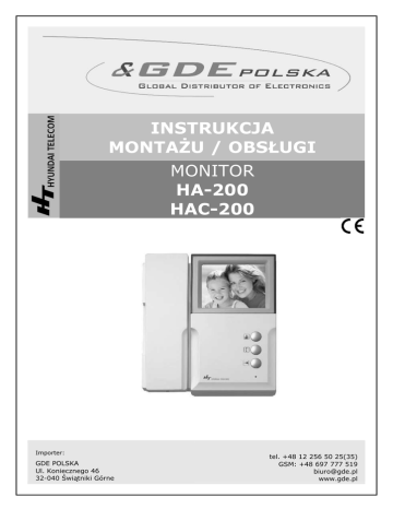 INSTRUKCJA MONTAśU / OBSŁUGI MONITOR HA-200 HAC-200 Importer: GDE POLSKA Ul. Koniecznego 46 32-040 Świątniki Górne tel. +48 12 256 50 25(35) GSM: +48 697 777 519 [email protected] www.gde.pl HA-200, HAC-200 ZANIM ROZPOCZNIESZ MONTAś! Nie montuj monitora i kamery w miejscu naraŜonym na kurz, bezpośrednie promieniowanie słoneczne (lub inne oświetlenie), wysokie temperatury (powyŜej 40 stopni) lub duŜą wilgotność. Nie uszczelniaj silikonem kamery, zaleca się wyłoŜyć wnękę pod kamerę warstwą cienkiego styropianu (tył i ścianki boczne). W miejscach zacieków i duŜej wilgotności zaleca się stosować obudowę z daszkiem typu OHCB. Nie lokuj urządzenia w miejscach naraŜonych na wibracje lub wstrząsy. Monitor powinien być ulokowany w pobliŜu gniazda 220 V. Urządzenia naleŜy czyścić wilgotną szmatką. Podczas montaŜu naleŜy ściśle stosować się do odpowiedniego ze schematów. Przy projektowaniu instalacji naleŜy dobrać odpowiednią średnicę przewodu w zaleŜności od przewidywanych odległości i warunków środowiska. Nie naleŜy mieszać Ŝył innych instalacji (telefonicznych, alarmowych itp.) z instalacją videodomofonu. Zaleca się prowadzenie obwodu elektrozaczepu osobnym przewodem. Wygląd zewnętrzny - przód -2- HA-200, HAC-200 Wygląd zewnętrzny - tył Dostępne kamery wideodomofonowe HCB / HCC 300 - Kamera metalowa - Podtynkowa - Pełna regulacja kąta widzenia HCB / HCC 500 - Kamera metalowa, wandaloodporna - Podtynkowa - Ukryty obiektyw typu PINHOLE -3- HA-200, HAC-200 MontaŜ !!! Przed przystąpieniem do instalacji zaleca się sprawdzenie i podłączenie skonfigurowanego sprzętu w warunkach warsztatowych !!! Schematy podłączenia – przykłady monitor + kamera UWAGA!! JeŜeli NIE uŜywasz modułu pamięci połącz łącza #3 i #4 odpowiednim konektorem znajdującym się w zestawie. Dla zapewnienia optymalnej jakości pracy systemu maksymalny dystans pomiędzy monitorem, a kamerą powinien wynosić 50m (przewód 0.65 mm). Przy wideodomofonie kolorowym zalecane jest przesyłanie sygnału VIDEO przewodem koncentrycznym. -4- HA-200, HAC-200 2 x monitor + kamera monitor + kamera + moduł pamięci 2 x monitor + kamera + moduł pamięci * Zamek elektromagnetyczny i jego zasilanie nie wchodzą w skład zestawu -5- HA-200, HAC-200 (VO) – VIDEO (V-) – MASA (V+) - +ZAS. (DP) - AUDIO Opis kolorów: WHITE BLACK RED GREEN - BIAŁY CZARNY CZERWONY ZIELONY OPIS PRZYCISKÓW PRZYCISK OPIS Monitor Wł. / Wył. obrazu Interkom Wywołanie dodatkowej stacji - interkom Zamek Otwieranie zamka - przekaźnik Ustawianie czasu Ręczne nagrywanie obrazów Przeglądanie nagranych obrazów Wł. / Wył. trybu „opuszczenia lokalu”, przeglądania OPIS Dostrajanie jaskrawości obrazu. Przy HVM200B/C Time Record Review Away DOSTRAJANIE zakończenie podniesionej słuchawce naciskając przycisk zmieniamy jaskrawość wyświetlanego obrazu (tryb: Normalny/Jasny) Dostrajanie głośności dzwonka. Przy połoŜonej słuchawce naciskając przycisk Normalny/Głośny) zmieniamy głośność dzwonka (tryb: Obsługa videodomofonu • Ustaw przełącznik POWER w pozycji "ON". 1. Odwiedzający naciska przycisk CALL na zewnętrznej kamerze. Przez głośnik monitora rozlega się sygnał - znak czyjejś obecności przed wejściem. 2. Po ujrzeniu obrazu na ekranie monitora moŜesz: • odpowiedzieć - podnieść słuchawkę i rozpocznij rozmowę obraz na monitorze będzie wyświetlany przez około 180 sekund lub do momentu odłoŜenia słuchawki. • nie odpowiadać - nie podnoś słuchawki, obraz na monitorze zgaśnie po około 30 sekundach. 3. Po rozmowie z odwiedzającym, jeŜeli masz zainstalowany zamek elektromagnetyczny, moŜesz nacisnąć przycisk aby otworzyć drzwi (przy wyświetlanym obrazie i poniesionej słuchawce). 4. Naciśnij przycisk aby porozumieć się z dodatkowym monitorem interkom. 5. JeŜeli chcesz na monitorze podglądnąć obraz z przed wejścia naciśnij przycisk -6- HA-200, HAC-200 HA / HAC-200 (Monitor) Zasilanie Pobór mocy CZ / B Kolor Ekran Okablowanie MAX. Komunikacja audio Rozbudowa Temperatura Środowisko Wilgotność Wymiary Wymiary Waga Instalacja OPIS 90~250V AC, 50/60 Hz (Smps) Max. 30VA, czuwanie 5VA Max. 28VA, czuwanie 5VA CZ/B 4” płaski / Kolor 4” TFT-LCD 50m (0.65mm 4 przewody) Duplex - słuchawka Monitor, moduł pamięci -10°C ~ +40°C PoniŜej 90% (względna) 188 x 208 x 60 (szer./wys./gł.) mm 1.4 kg / 1.2 kg MontaŜ natynkowy HCB / HCC-300 (Kamera metalowa) Zasilanie Pobór mocy Video Min. oświetlenie Reg. kąta widzenia Temperatura Środowisko Wilgotność Wymiary panela Waga Instalacja OPIS DC 13V (zasilanie od monitora) DC 13V, 0.25A 1Vp-p/75 0.1 Lux (CZ/B) / 3 Lux (Kolor) Pełna regulacja kąta widzenia -10°C ~ +40°C PoniŜej 90% (względna) 121 x 185 x 16 (szer./wys./gł.) mm 0.54 kg MontaŜ podtynkowy HCB / HCC-500 (Kamera pinhole) Zasilanie Pobór mocy Video Min. oświetlenie Temperatura Środowisko Wilgotność Wymiary panela Waga Instalacja OPIS DC 13V (zasilanie od monitora) DC 13V, 0.17A 1Vp-p/75 0.1 Lux (CZ/B) / 3 Lux (Kolor) -10°C ~ +40°C PoniŜej 90% (względna) 91.5 x 132.5 x 18 (szer./wys./gł.) mm 0.54 kg MontaŜ podtynkowy Pozbywanie się starych urządzeń elektrycznych Europejska Dyrektywa 2002/96/EC dotycząca ZuŜytych Elektrycznych i Elektronicznych Urządzeń (WEEE) zakłada zakaz pozbywania się starych urządzeń domowego uŜytku jako nieposortowanych śmieci komunalnych. ZuŜyte urządzenia muszą być osobno zbierane i sortowane w celu zoptymalizowania odzyskiwania oraz ponownego przetworzenia pewnych komponentów i materiałów. Konsumenci powinni kontaktować się z władzami lokalnymi lub sprzedawcą w celu uzyskania informacji dotyczących postępowania z ich zuŜytymi urządzeniami elektrycznymi i elektronicznymi. -7- HA-200, HAC-200 (TŁUMACZENIE DEKLARACJI ZGODNOŚCI) DEKLARACJA ZGODNOŚCI My Hyundai Telecommunication Co., Ltd. 143-1, Sangdaewon-1Dong, Joongwon-Ku, Seongnam-City, Kyounggi