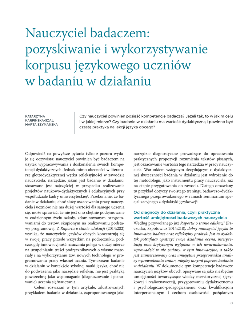 Nauczyciel badaczem: pozyskiwanie i wykorzystywanie korpusu językowego uczniów w badaniu w działaniu Katarzyna Karpińska-Szaj, Marta Szymańska Czy nauczyciel powinien posiąść kompetencje badacza? Jeżeli tak, to w jakim celu i w jakiej mierze? Czy badanie w działaniu ma wartość dydaktyczną i powinno być częstą praktyką na lekcji języka obcego? Odpowiedź na powyższe pytania tylko z pozoru wydaje się oczywista: nauczyciel powinien być badaczem na użytek wypracowywania i doskonalenia swoich kompetencji dydaktycznych. Jednak mimo obecności w literaturze glottodydaktycznej wątku refleksyjności w zawodzie nauczyciela, narzędzie, jakim jest badanie w działaniu, stosowane jest najczęściej w przypadku realizowania projektów naukowo-dydaktycznych i edukacyjnych przy współudziale kadry uniwersyteckiej1. Przekonanie, że badanie w działaniu, choć służy oszacowaniu pracy nauczyciela i uczniów, nie ma dużej wartości dla samego uczenia się, może sprawiać, że nie jest ono chętnie podejmowane w codziennym życiu szkoły, zdominowanym przygotowaniami do testów, skupionym na realizowaniu podstawy programowej. Z Raportu o stanie edukacji (2014:202) wynika, że nauczyciele języków obcych koncentrują się w swojej pracy przede wszystkim na podręczniku, podczas gdy innowacyjność nauczania polega w dużej mierze na uzupełnianiu treści podręcznikowych o własne materiały i na wykorzystaniu tzw. nowych technologii w programowaniu pracy własnej ucznia. Tymczasem badanie w działaniu w kontekście szkolnej nauki języka, choć nie do podważenia jako narzędzie refleksji, nie jest praktyką powszechną jako wspomaganie (diagnozowanie i planowanie) uczenia się/nauczania. Celem rozważań w tym artykule, zilustrowanych przykładem badania w działaniu, zaproponowanego jako narzędzie diagnostyczne prowadzące do opracowania praktycznych propozycji rozumienia tekstów pisanych, jest oszacowanie wartości tego narzędzia w pracy nauczyciela. Warunkiem wstępnym decydującym o dydaktycznej skuteczności badania w działaniu jest wdrożenie do tej metodologii, jako instrumentu pracy nauczyciela, już na etapie przygotowania do zawodu. Dlatego omawiany tu przykład dotyczy swoistego treningu badawczo-dydaktycznego przeprowadzonego w ramach seminarium specjalizacyjnego z dydaktyki językowej2. Od diagnozy do działania, czyli praktyczna wartość umiejętności badawczych nauczyciela Według przywołanego już Raportu o stanie edukacji (Paczuska, Szpotowicz 2014:218), dobry nauczyciel języka to innowator, badacz oraz refleksyjny praktyk. Jest to dydaktyk potrafiący opatrzyć swoje działania oceną, interpretacją oraz krytycznym wglądem w ich uwarunkowania, wprowadzić w nie zmiany, w tym innowacyjne, a także jest zainteresowany oraz umiejętnie przeprowadza analizy wprowadzania zmian, między innymi poprzez badania w działaniu. W dokumencie tym kompetencje badawcze nauczycieli języków obcych opisywane są jako niezbędne umiejętności towarzyszące wiedzy merytorycznej (językowej i realioznawczej), przygotowaniu dydaktycznemu i psychologiczno-pedagogicznemu oraz kwalifikacjom interpersonalnym i cechom osobowości pożądanym 47 KOMPETENCJE NAUCZYCIELI JĘZYKÓW OBCYCH w pracy z uczniami w różnych grupach wiekowych i o indywidualnych potrzebach edukacyjnych (tamże, zob. także przegląd badań na temat kompetencji nauczycieli języków obcych w: Pawlak i in. 2009). Umiejętności badawcze nie są tylko komponentem kwalifikacji nauczycielskich, świadczącym o przygotowaniu do zawodu nauczyciela jako refleksyjnego obserwatora własnego sposobu nauczania. Prowadzenie badań w działaniu w praktyce nauczycielskiej ma realny wymiar edukacyjny, przekładający się na planowanie działań dydaktycznych zakrojonych na miarę potrzeb konkretnego ucznia lub/i konkretnej grupy uczniów. Badanie w działaniu umożliwia bowiem diagnozę potencjału uczniów w perspektywie kształcenia na kolejnych etapach edukacyjnych i w perspektywie badania postępów ucznia na konkretnym etapie kształcenia językowego. Zgodnie z metodologią badania w działaniu, nauczyciel-badacz jest uczestnikiem badania, wraz ze swoimi uczniami opracowuje i przechodzi przez jego etapy, wspólnie wyciąga wnioski i gromadzi dane do kolejnych działań na lekcji języka obcego, zmierzając do pomocy w pokonywaniu zaobserwowanych trudności i rozwijania mocnych stron. Skupione na konkretnym zadaniu językowo-komunikacyjnym, badanie w działaniu jest więc narzędziem samopoznania dla uczących się, rozwija postawę odpowiedzialności i skłania do monitorowania przebiegu uczenia się. Może zatem stać się elementem oceniania kształtującego, przynosząc wymierne informacje o użyciu języka, strategiach uczenia się, własnym funkcjonowaniu w dyskursie w języku obcym w danej sytuacji komunikacyjnej. W ten sposób badanie w działaniu może wkomponować się w uczenie się/nauczanie języka, a nie stanowić tylko test na skuteczność pracy nauczyciela-badacza. Warunkiem jest jednak takie zaplanowanie badania, aby było ono jednocześnie zadaniem (ćwiczeniem) językowo-komunikacyjnym dla uczniów. Warunek ten spełnia użycie przeformułowania, które – jako działanie językowe – może się też stać strategią uczenia się. Przeformułowanie jako strategia uczenia się w badaniu w działaniu Przeformułowanie (fr. reformulation) definiowane jest jako proces odtworzenia wypowiedzi, w której elementy zachowane z wypowiedzi źródłowej łączą się z elementami zmodyfikowanymi w stosunku do tej wypowiedzi. Modyfikacja może dotyczyć poziomu leksykalnego, składniowego lub semantycznego (Martinot 2012:65). W przeformułowywanych wypowiedziach uczniów można zaobserwować nie tylko użyte konstrukcje złożone (środki językowe), ale także oszacować ich dobór w zależności od typu tekstu i rodzaju dyskursu. Istotne są także sposoby kompensowania niedoborów kompetencji gramat