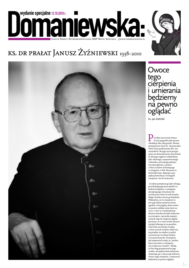 wydanie specjalne 12.10.2010 r. Gazeta Parafii Rzymskokatolickiej NMP Matki KoÊcio∏a //www.domaniewska.pl ks. dr pra∏at Janusz ˚yêniewski 1938–2010 Owoce tego cierpienia i umierania będziemy na pewno oglądać ks. Jan Zieliński P an Bóg daje nam teraz te dni pogrzebu jako pewne rekolekcje dla całej parafii. Można przypominać życie ks. Janusza jako słowo Pana podarowane dla nas wszystkich. Bo jego życie przypomina mi doświadczenie Jana Pawła II, którego najpierw widzieliśmy jako zdrowego, wysportowanego człowieka, mówiącego pełnym, mocnym głosem, a potem z dnia na dzień wchodzącego w zmaganie, w ból. Ale przez te doświadczenie, dającego nam piękną katechezę o ewangelii cierpienia. Aż do umierania. Ja także pamiętam go jako silnego, przeskakującego przez płotki na budowie kapłana, a następnie akceptującego otrzymane doświadczenie, które trwało bardzo długo i bardzo mocno go dotykało. Widziałem, że to cierpienie to jest jego dalsze pasterzowanie, zgodnie z Ewangelią, która mówi, że pasterz oddaje swoje życie za owce. I choć to w późniejszym okresie choroby nie było widoczne na zewnątrz, z powodu amputowanych nóg nie mógł się nigdzie poruszać, to w tym swoim ukryciu cierpiał ofiarując je za parafian. Choć było mu bardzo trudno, w dniu swoich urodzin udało mu się przybyć na wózku i w pełni uczestniczyć we Mszy Świętej w naszym kościele. Pamiętam, jak wspomniał wtedy, że „bardzo łatwo się mówi o cierpieniu, ale trudno jest cierpieć”. Myślę, że Pan Bóg przyjmował to jego trudne, ale piękne doświadczenie, obejmując go z całą swoją miłością. Owoce tego cierpienia i umierania będziemy na pewno oglądać. Rozmowa z ksi´dzem Stanis∏awem Guzkiem Dla mnie był ojcem, bratem i przyjacielem Ksiądz był od początku historii naszej parafii związany z księdzem Januszem. Jak Ksiądz wspomina księdza Janusza? Z Januszem zacząłem pracę od 1970 r. Już pierwsze spotkanie z nim zrobiło na mnie wielkie wrażenie: dotarłem tam rok po święceniach, jako bardzo młody ksiądz, i on od razu mi kazał mówić do siebie po imieniu; czułem że Janusz to człowiek bardzo bezpośredni i otwarty na ludzi. Przez trzy lata pracowaliśmy we dwóch: było sześć mszy, w maleńkiej kaplicy, która właściwie była pogrzebową kaplicą takiego szpitalika sióstr franciszkanek od cierpiących, który został zniszczony w czasie powstania. W tej Królikarni pracowaliśmy do 1981 r., gdy zaczęliśmy budowę kościoła przy ulicy Domaniewskiej. Ks. Janusz był człowiekiem o silnym charakterze i jednocześnie człowiekiem modlitwy i wielkiej duchowości… Tak, Janusz był człowiekiem mocnym, ale przede wszystkim bardzo mu zależało na duszpasterstwie. Ponieważ my byliśmy ośrodkiem, na terenie którego znajdowała się komenda główna Milicji Obywatelskiej oraz Ministerstwa Spraw Wewnętrznych; nasi parafianie to byli praktycznie ludzie z resortu: Sztab Generalny Wojska Polskiego, pracownicy Ministerstwa Spraw Wewnętrznych oraz większość pracowników Milicji Obywatelskiej… Czyli praktycznie trzy czwarte parafii stanowili ludzie z tzw. resortu i do nich było bardzo trudno trafić! Z ks. Januszem od samego początku zastanawialiśmy się, jak dotrzeć do tych ludzi, jak im głosić dobrą nowinę o Jezusie Chrystusie. Widzieliśmy, że te tradycyjne metody duszpasterskie, którymi dysponujemy, miały na nich niewielki wpływ. Dlatego, kiedy pojawiła Droga Neokatekumenalna w diecezji, zobaczyliśmy w niej wielką szansę. Od razu w 1978 r., w roku wyboru Papieża, rozpoczęły się pierwsze katechezy Drogi Neokatechumenalnej, które zgromadziły tak wielką liczbę ludzi, że nie zmieścili się oni w kaplicy. Około 300 osób chodziło na te katechezy. Po nich do tej pierwszej wspólnoty weszło wiele kobiet, których mężami byli pułkownicy, pracownicy Ministerstwa Spraw Wewnętrznych itd. To one zanosiły ewangelię do swoich domów. I powoli niektórzy z tych mężów zaczęli wchodzić do wspólnoty. Z Januszem zdaliśmy od razu sobie sprawę, że Duch Święty wzbudził w Kościele taki charyzmat, jakim jest Droga Neokatechumenalna, żeby zanieść ewangelię najbardziej oddalonym od Kościoła. I my byliśmy właśnie w takiej sytuacji: większość parafian albo była bardzo daleka od Kościoła, albo przeżywała swoje chrześcijaństwo w sposób powierzchowny. Droga Neokatekumenalna nam bardzo pomagała przede wszystkim w naszej posłudze jako prezbiterom. Ksiądz wspomniał, że ks. Janusz miał dobry kontakt z ludźmi… Janusz z wykształcenia był prawnikiem, ale miał bardzo dobre relacje z ludźmi, ludzie go bardzo cenili i kochali… Miał również niesamowitą siłę przebicia, jeśli chodzi o walkę z władzami komunistycznymi: nie było wcale łatwo wtedy zbudować kaplicę i później się starać o budowę kościoła. Bardzo trudno było zdobyć pozwolenie na budowę i znaleźć na nią materiały. Wiele razy był ściągany na milicę. Miał naprawdę wiele odwagi. W tym wszystkim bardzo nam pomagali ludzie z parafii: na pewno bez wsparcia tylu ludzi dobrej woli, którzy się włączyli w pracę i pomagali nam w różny sposób w załatwianiu wielu rzeczy, ten kościół nigdy by nie powstał. Jednocześnie Janusz świetnie rozumiał, że nie można się koncentrować na samej budowie materialnej świątyni, że jednocześnie trzeba budować wspólnotę chrześcijańską. I właściwie budowa wspólnoty chrześcijańskiej, ewangelizacja, wyprzedziła budowę tej materialnej świątyni. Rzeczywiście w tym Betlejem, jakim była kaplica w Królikarni, bardzo szybko powstała wspaniała rzeczywistość ewangelizacyjna, eksplozja Ducha Świętego (w tych trudnych warunkach w ciągu kilku lat powstało 11 wspólnot). Ta świątynia materialna została więc zbudowana dla konkretnych ludzi. Janusz, jako mądry pasterz, świetnie to rozumiał i zbudował przepiękną świątynię z 