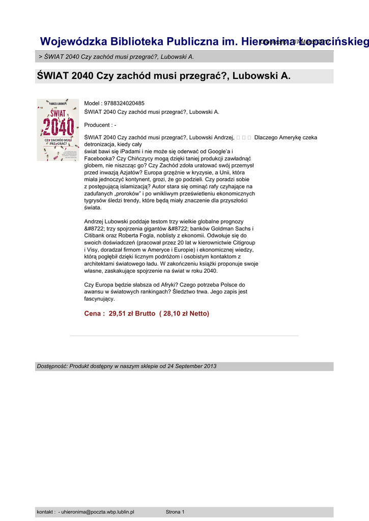 Utworzono : 07Łopacińskieg March 2017 Wojewódzka Biblioteka Publiczna im. Hieronima > ŚWIAT 2040 Czy zachód musi przegrać?, Lubowski A. ŚWIAT 2040 Czy zachód musi przegrać?, Lubowski A. Model : 9788324020485 ŚWIAT 2040 Czy zachód musi przegrać?, Lubowski A. Producent : ŚWIAT 2040 Czy zachód musi przegrać?, Lubowski Andrzej, ��� Dlaczego Amerykę czeka detronizacja, kiedy cały świat bawi się iPadami i nie może się oderwać od Google’a i Facebooka? Czy Chińczycy mogą dzięki taniej produkcji zawładnąć globem, nie niszcząc go? Czy Zachód zdoła uratować swój przemysł przed inwazją Azjatów? Europa grzęźnie w kryzysie, a Unii, która miała jednoczyć kontynent, grozi, że go podzieli. Czy poradzi sobie z postępującą islamizacją? Autor stara się ominąć rafy czyhające na zadufanych „proroków” i po wnikliwym prześwietleniu ekonomicznych tygrysów śledzi trendy, które będą miały znaczenie dla przyszłości świata. Andrzej Lubowski poddaje testom trzy wielkie globalne prognozy − trzy spojrzenia gigantów − banków Goldman Sachs i Citibank oraz Roberta Fogla, noblisty z ekonomii. Odwołuje się do swoich doświadczeń (pracował przez 20 lat w kierownictwie Citigroup i Visy, doradzał firmom w Ameryce i Europie) i ekonomicznej wiedzy, którą pogłębił dzięki licznym podróżom i osobistym kontaktom z architektami światowego ładu. W zakończeniu książki proponuje swoje własne, zaskakujące spojrzenie na świat w roku 2040. Czy Europa będzie słabsza od Afryki? Czego potrzeba Polsce do awansu w światowych rankingach? Śledztwo trwa. Jego zapis jest fascynujący. Cena : 29,51 zł Brutto ( 28,10 zł Netto) Dostępność: Produkt dostępny w naszym sklepie od 24 September 2013 kontakt : - [email protected] Strona 1