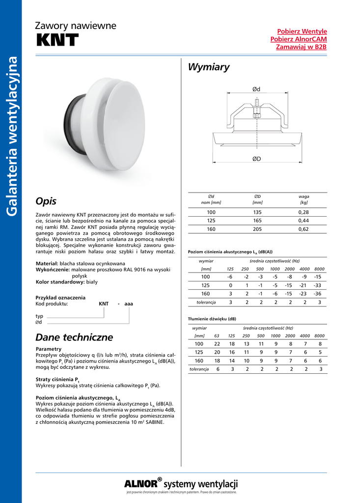 Zawory nawiewne Pobierz Wentyle Pobierz AlnorCAM Zamawiaj w B2B Galanteria wentylacyjna KNT Wymiary Ød ØD Opis Zawór nawiewny KNT przeznaczony jest do montażu w suficie, ścianie lub bezpośrednio na kanale za pomoca specjalnej ramki RM. Zawór KNT posiada płynną regulację wyciąganego powietrza za pomocą obrotowego środkowego dysku. Wybrana szczelina jest ustalana za pomocą nakrętki blokującej. Specjalne wykonanie konstrukcji zaworu gwarantuje niski poziom hałasu oraz szybki i łatwy montaż. Materiał: blacha stalowa ocynkowana Wykończenie: malowane proszkowo RAL 9016 na wysoki połysk Kolor standardowy: biały Przykład oznaczenia Kod produktu: KNT - aaa typ d d nom [mm] D [mm] waga [kg] 100 135 0,28 125 165 0,44 160 205 0,62 Poziom ciśnienia akustycznego L A (dB(A)) wymiar średnia częstotliwość (Hz) [mm] 125 100 -6 250 500 1000 2000 4000 -2 -3 -5 -8 -9 8000 -15 125 0 1 -1 -5 -15 -21 -33 160 3 2 -1 -6 -15 -23 -36 tolerancja 3 2 2 2 2 2 3 Tłumienie dźwięku (dB) wymiar Dane techniczne Parametry Przepływ objętościowy q (l/s lub m3/h), strata ciśnienia całkowitego P t (Pa) i poziomu ciśnienia akustycznego L A (dB(A)), mogą być odczytane z wykresu. średnia częstotliwość (Hz) [mm] 63 125 250 500 1000 2000 4000 8000 100 22 18 13 11 9 8 7 8 125 20 16 11 9 9 7 6 5 160 18 14 10 9 9 7 6 6 tolerancja 6 3 2 2 2 2 2 3 Straty ciśnienia P t Wykresy pokazują stratę ciśnienia całkowitego P t (Pa). Poziom ciśnienia akustycznego, L A Wykres pokazuje poziom ciśnienia akustycznego L A (dB(A)). Wielkość hałasu podano dla tłumienia w pomieszczeniu 4dB, co odpowiada tłumieniu w strefie pogłosu pomieszczenia z chłonnością akustyczną pomieszczenia 10 m2 SABINE. ALNOR® systemy wentylacji jest prawnie chronionym znakiem i technicznym patentem. Prawo do zmian zastrzeżone. Zawory nawiewne Pobierz Wentyle Pobierz AlnorCAM Zamawiaj w B2B KNT Galanteria wentylacyjna Dane techniczne Wykresy doboru dla zaworów bez talerzyka pozycja [mm] Ø 100 2 200 4 2,0 Ø 125 a [mm] 6 9 2,5 strata ciśnienia P t [Pa] 100 ∆ pt [Pa] 40 35 L WA [dB(A)] 30 20 10 5 3,5 3,0 12 1,5 1,0 50 a [mm] 9 12 6 4 200 20 10 20 30 50 ∆ pt [Pa] l0,2 [m] 100 strata ciśnienia P t [Pa] pozycja [mm] 180 [m3/h] 40 2,0 50 l0,2 [m] 35 1,5 L WA [dB(A)] 30 20 10 50 [l/s] 40 100 15 2,5 5 20 10 20 30 50 q 80 [l/s] 50 40 [m3 /h] 200 100 q przepływ przepływ Wykresy doboru dla zaworów z talerzykiem pozycja [mm] pozycja [mm] a [mm] Ø 160 4 200 6 L WA [dB(A)] 20 20 15 40 30 40 100 130 [l/s] 100 50 300 200 400 2 35 1,5 50 1,0 20 10 5 20 10 20 [m3/h] 3 40 35 2 30 L WA [dB(A)] a [mm] Ø 160 4 100 20 50 30 100 40 50 200 80 [l/s] [m3 /h] 5 3 40 50 35 2 30 L WA [dB(A)] 20 10 15 20 l0,2 [m] 1,5 20 10 6 4 200 ∆ pt [Pa] 6 strata ciśnienia P t [Pa] a [mm] 9 12 15 4 100 ∆ pt [Pa] strata ciśnienia P t [Pa] pozycja [mm] 4 200 5 180 [m3/h] q Ø 125 10 50 [l/s] 40 100 przepływ pozycja [mm] 20 30 50 q l0,2 [m] L WA [dB(A)] 30 przepływ 50 9 12 6 5 40 ∆ pt [Pa] 35 30 strata ciśnienia P t [Pa] ∆ pt [Pa] strata ciśnienia P t [Pa] 1,5 10 l0,2 [m] 100 40 4 4 3 20 2,0 50 a [mm] 2 200 l0,2 [m] 10 Ø 100 15 3,0 2,5 100 10 10 1,5 10 15 40 q 20 40 30 100 200 q przepływ przepływ ALNOR® systemy wentylacji jest prawnie chronionym znakiem i technicznym patentem. Prawo do zmian zastrzeżone. 100 50 300 400 130 [l/s] [m3 /h]