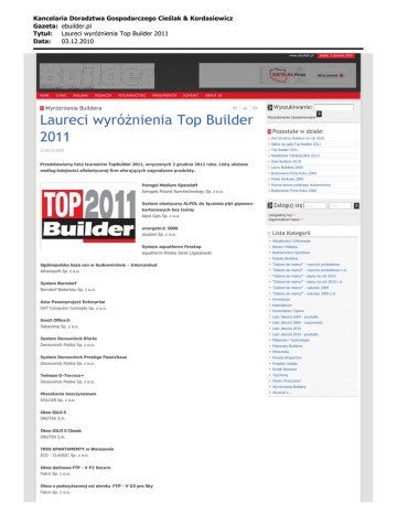 Kancelaria Doradztwa Gospodarczego Cielak & Kordasiewicz Gazeta: ebuilder.pl Tytu³: Laureci wyró¿nienia Top Builder 2011 Data: 03.12.2010 www.ebuilder.pl HOME O NAS REKLAMA REDAKCJA WYDAWNICTWO PRENUMERATA KONTAKT piątek, 3 grudnia 2010 ABOUT US Wyszukiwanie: Wyróżnienia Buildera Laureci wyróżnienia Top Builder 2011 Wyszukiwanie zaawansowane Pozostałe w dziale: Wyróżnienia Buildera za rok 2010 Zbliża się gala Top Builder 2011 Top Builder 2011 03.12.2010 NAGRODA TOPBUILDER 2011! Przedstawiamy listę laureatów TopBuilder 2011, wręczonych 2 grudnia 2011 roku. Listę ułożono według kolejności alfabetycznej firm oferujących nagrodzone produkty. Gala Buildera 2010 Laury Buildera 2009 Budowlana Firma Roku 2009 Polski Herkules 2009 Porogel Medium Spaceloft Mocna strona polskiego budownictwa Aerogels Poland Nanotechnology Sp. z o.o. Budowlana Firma Roku 2008 System elastyczny ALPOL do łączenia płyt gipsowo- Zaloguj się: kartonowych bez taśmy Alpol Gips Sp. z o.o. Zarejestruj się Zapomniałem hasła energeto® 5000 aluplast Sp. z o.o. Lista Kategorii Aktualności i Informacje System aquatherm firestop Biznes i Polityka aquatherm-Polska Jacek Ligaszewski Budownictwo Sportowe Debaty Buildera Ogólnopolska baza cen w budownictwie - Intercenbud "Dobrze sie mamy!" - nowości produktowe Athenasoft Sp. z o.o. "Dobrze sie mamy!" - nowości produktowe c.d. "Dobrze sie mamy!" - plany na rok 2010 System Berndorf "Dobrze sie mamy!" - plany na rok 2010 c.d. Berndorf Baderbau Sp. z o.o. "Dobrze sie mamy!" - sukcesy 2009 Asta Powerproject Enterprise DAT Computer Concepts Sp. z o.o. Koszt Office® Datacomp Sp. z o.o. "Dobrze sie mamy!" - sukcesy 2009 c.d. Inwestycje Kalendarium Komentarze i Opinie Lato Jakości 2009 - produkty Lato Jakości 2009 - wypowiedzi Lato Jakości 2010 Lato Jakości 2010 - produkty System Deceuninck Eforte Materiały i Technologie Deceuninck Polska Sp. z o.o. Patronaty Buildera Personalia System Deceuninck Prestige Passivhaus Porady Ekspertów Deceuninck Polska Sp. z o.o. Projekty świata Rynek Nowości Twinson O-Terrace+ Top Firmy Deceuninck Polska Sp. z o.o. Warto Przeczytać Wyróżnienia Buildera Mieszkania bezczynszowe Wywiad z... DOLCAN Sp. z o.o Okno IGLO 5 DRUTEX S.A. Okno IGLO 5 Classic DRUTEX S.A. TRIO APARTAMENTY w Warszawie ECO - CLASSIC Sp. z o.o. Okno dachowe FTP - V P2 Secure Fakro Sp. z o.o. Okno o podwyższonej osi obrotu FYP - V U3 pro Sky Fakro Sp. z o.o. Prolatex Farby KABE Polska Sp. z o.o. TRIO APARTAMENTY w Warszawie ECO - CLASSIC Sp. z o.o. Okno dachowe FTP - V P2 Secure Kancelaria Doradztwa Gospodarczego Cielak & Kordasiewicz Fakro Sp. zebuilder.pl o.o. Gazeta: Tytu³: Laureci wyró¿nienia Top Builder 2011 Okno o podwyższonej osi obrotu FYP - V U3 pro Sky Data: Fakro Sp. z03.12.2010 o.o. Prolatex Farby KABE Polska Sp. z o.o. Granulat gumowy EPDM Virgin kolorowy Geyer & Hosaja Sp. z o.o. TioCem® Górażdże Cement S.A. Masa izolacyjna CP 1 Henkel Polska Sp. z o.o. Centrum Biurowo-Szkoleniowe i Dystrybucyjne firmy Robert Bosch Sp. z o.o. Kajima Poland Sp. z o.o. Pakiet PPP Kancelaria Doradztwa Gospodarczego Cieślak & Kordasiewicz Sp. J. Odkurzacz uniwersalny NT 65/2 Tact² Kärcher Sp. z o.o. Knauf ADDI S "Baranek" Knauf Bauprodukte Polska Sp. z o.o. Knauf cover - in slow Knauf Bauprodukte Polska Sp. z o.o. Knauf Goldband gładź szpachlowa Knauf Bauprodukte Polska Sp. z o.o. Knauf Goldband UNI Knauf Bauprodukte Polska Sp. z o.o. MATY CLASSIC w systemie izolacji dachu skośnego DACH PREMIUM Knauf Insulation Sp. z o.o. MATY UNIFIT w systemie izolacji dachu skośnego DACH PREMIUM PLUS Knauf Insulation Sp. z o.o. Okno Platinium Evolution² Oknoplast Sp. z o.o. Urządzenie formujące PERI BCC Peri Polska Sp. z o.o. Płyta budowlana MFP Pfleiderer Grajewo S.A. Generalne Wykonawstwo budynku sortowni owoców z chłodniami oraz zapleczem sanitarnohigienicznym i biurowym w Białej Rawskiej P.U.B BUD-REM Jerzy Krawczyk Blacha dachówkowa Finnera TM Ruukki Polska Sp. z o.o. Pokrycie dachowe Ruukki Classic TM Premium Ruukki Polska Sp. z o.o. weber.therm LAMBDA SAINT-GOBAIN Construction Products Polska Sp. z o.o. Leca® KERAMZYT podsypkowy SAINT-GOBAIN Construction Products Polska Sp. z o.o. weber.floor DESIGN SAINT-GOBAIN Construction Products Polska Sp. z o.o. Schöck Isokorb XT Schöck Sp. z o.o. System izolacji przeciwwodnej Tytan Professional SELENA S. A. Izolacja przeciwwodna tarasów i basenów Tytan Hydro 2K SELENA S. A. SAINT-GOBAIN Construction Products Polska Sp. z o.o. Schöck Isokorb XT Kancelaria Doradztwa Gospodarczego Cielak & Kordasiewicz Schöck Sp. z o.o. Gazeta: ebuilder.pl System izolacji przeciwwodnej Tytan Professional Tytu³: Laureci wyró¿nienia Top Builder 2011 SELENA S. A. Data: 03.12.2010 Izolacja przeciwwodna tarasów i basenów Tytan Hydro 2K SELENA S. A. Dyspersyjna masa asfaltowo-kauczukowa Abizol ST Tytan Professional SELENA S. A. SIMPLE.BUD Simple S. A. Koncepcja i realizacja ekspozycyjnej części wystawy „Śladem europejskiej tożsamości Krakowa" w podziemiach Rynku Głównego TRIAS S. A. ArtMe TRIMO Polska Sp. z o.o. Program CoMoTel Rental Ulisses s.c. System deskowań uniwersalnych MK Ulma Construccion Polska S. A. ZWCAD Standard i Professional Usługi Informatyczne "SZANSA" Gabriela Ciszyńska-Matuszek Vitodens 300-W Viessmann Sp. z o.o. Ruchome dno VARIOPOOL VARIOPOOL Polska Sp. z o.o. Fasada FA 50N Yawal S.A. JR Home O Nas Reklama Redakcja Wydawnictwo Prenumerata Kontakt Wydawca: PWB MEDIA 02 -729 Warszawa, ul. Rolna 155, tel.: 022 853 06 87, fax: 022 853 06 86, redakcja serwisu: [email protected] , redakcja wydania papierowego: [email protected] © Copyrights 2008 by Poland Zobacz też: