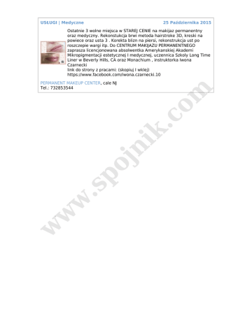 USŁUGI | Medyczne 25 Października 2015 Ostatnie 3 wolne miejsca w STAREJ CENIE na makijaz permanentny oraz medyczny. Rekonstukcja brwi metoda hairstroke 3D, kreski na powiece oraz usta 3 . Korekta blizn na piersi, rekonstrukcja ust po roszczepie wargi itp. Do CENTRUM MAKIJAZU PERMANENTNEGO zaprasza licencjonowana absolwentka Amerykanskiej Akademi Mikropigmentacji estetycznej I medycznej, uczennica Szkoly Long Time Liner w Beverly Hills, CA oraz Monachium , instruktorka Iwona Czarnecki link do strony z pracami: (skopiuj I wklej) https://www.facebook.com/iwona.czarnecki.10 w w w .s po jn ik .c o m PERMANENT MAKEUP CENTER, cale NJ Tel.: 732853544