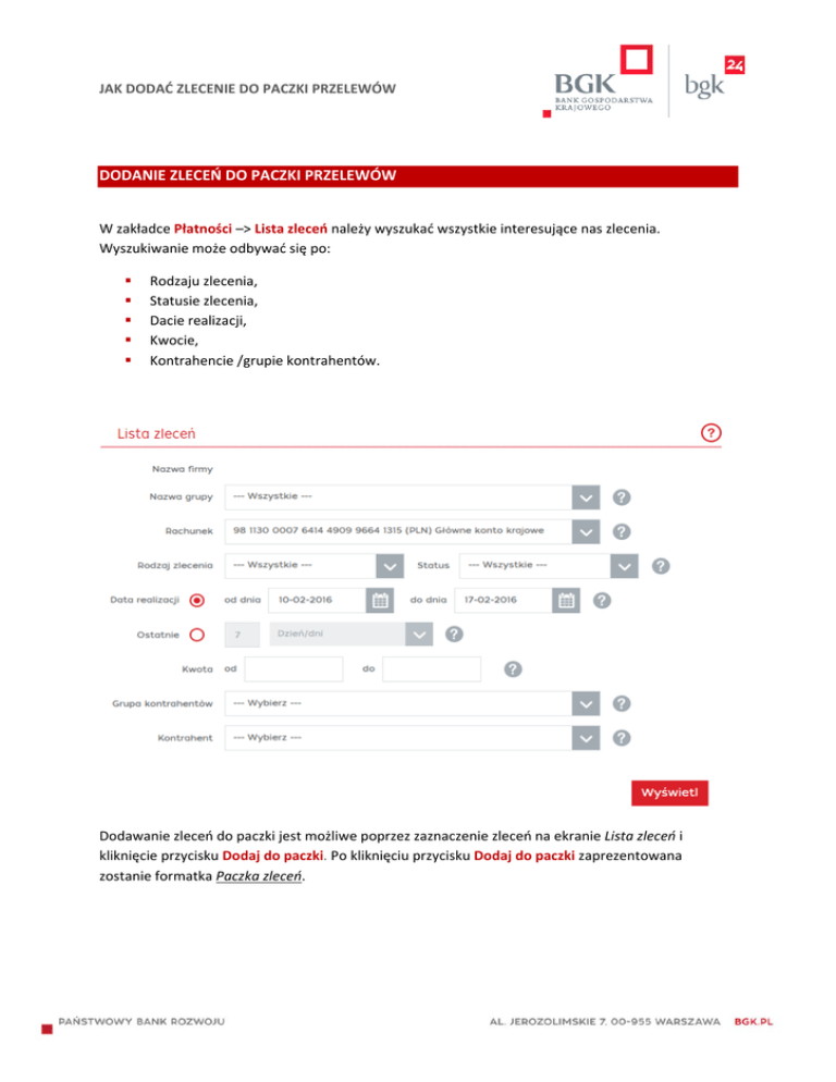 JAK DODAĆ ZLECENIE DO PACZKI PRZELEWÓW DODANIE ZLECEŃ DO PACZKI PRZELEWÓW W zakładce Płatności –> Lista zleceń należy wyszukać wszystkie interesujące nas zlecenia. Wyszukiwanie może odbywać się po: Rodzaju zlecenia, Statusie zlecenia, Dacie realizacji, Kwocie, Kontrahencie /grupie kontrahentów. Dodawanie zleceń do paczki jest możliwe poprzez zaznaczenie zleceń na ekranie Lista zleceń i kliknięcie przycisku Dodaj do paczki. Po kliknięciu przycisku Dodaj do paczki zaprezentowana zostanie formatka Paczka zleceń. JAK DODAĆ ZLECENIE DO PACZKI PRZELEWÓW Paczka zostanie utworzona po uzupełnieniu pola Nazwa paczki i zatwierdzeniu przyciskiem JAK DODAĆ ZLECENIE DO PACZKI PRZELEWÓW MODYFIKACJA ZLECEŃ W PACZCE PRZELEWÓW Utworzona w systemie bgk24 paczka może być modyfikowana. Należy wejść w Szczegóły paczki, gdzie dla poszczególnych zleceń z paczki dostępne są poniższe funkcje: Usuń z paczki – akcja skutkuje usunięciem zlecenia z paczki, Usuń z paczki zaznaczone – akcja skutkuje usunięciem wszystkich zaznaczonych zleceń z listy zleceń zawartych w paczce. Na ekranie Szczegółów paczki zleceń dostępne są następujące przyciski: Rozgrupuj paczkę – akcja powoduje usunięcie wszystkich zleceń z paczki oraz usunięcie całej paczki, Usuń paczkę – akcja powoduje usunięcie paczki wraz ze wszystkimi znajdującymi się w niej zleceniami, Podpisz paczkę – akcja powoduje podpisanie paczki ze zleceniami, Powrót – akcja skutkuje przejściem do formatki Lista zleceń. WYSŁANIE PACZKI ZLECEŃ Wysłanie paczki odbywa się na formatce Szczegółów paczki zleceń poprzez wybranie przycisku