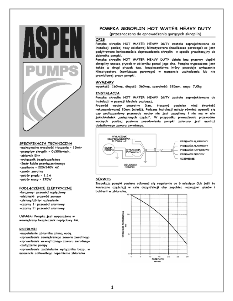POMPKA SKROPLIN HOT WATER HEAVY DUTY (przeznaczona do oprowadzania gorących skroplin) OPIS Pompka skroplin HOT WATER HEAVY DUTY została zaprojektowana do instalacji poniŜej tacy ociekowej klimatyzatora (nawilŜacza parowego) co jest podyktowane koniecznością doprowadzenia skroplin w sposób grawitacyjny do zbiornika pompki. Pompka skroplin HOT WATER HEAVY DUTY działa bez przerwy dopóki skropliny unoszą pływak w zbiorniku ponad jego dno. Pompka wyposaŜone jest takŜe w drugi pływak tzw. bezpieczeństwa który powoduje wyłączenie klimatyzatora (nawilŜacza parowego) w momencie uszkodzenia lub nie prawidłowej pracy pompki. WYMIARY wysokość: 160mm, długość: 360mm, szerokość: 325mm, waga: 7,0kg INSTALACJA Pompka skroplin HOT WATER HEAVY DUTY została zaprojektowana do instalacji w pozycji idealnie poziomej. Przewód wodny powrotny (tzn. tłoczny) powinien mieć (wartość rekomendowana) 15mm (miedź). Podczas instalacji naleŜy równieŜ upewnić się czy podłączeniowy przewody wodny nie jest zapętlony i nie ma w nim jakichkolwiek „uwięzionych części”. W przypadku prowadzenia przewodów wodnych poniŜej poziomu posadowienia pompki zalecany jest montaŜ dodatkowego zaworu zwrotnego. SPECYFIKACJA TECHNICZNA -maksymalna wysokość tłoczenia – 15mtr -przepływ skroplin – 0÷ ÷30ltr/min. -zbiornik 5ltr -wyłącznik bezpieczeństwa -2mtr kabla przyłączeniowego -zasilanie – 220/240V AC -zawór zwrotny -pobór prądu – 1,1A -pobór mocy – 275W PODŁĄCZENIE ELEKTRYCZNE -brązowy: przewód napięciowy -niebieski: przewód zerowy -zielony/Ŝółty: uziemienie -czarny 1: przewód alarmowy -czarny 2: przewód alarmowy SERWIS Inspekcja pompki powinna odbywać się regularnie co 6 miesięcy (lub jeśli to konieczne częściej) w celu dezynfekcji aby zapobiec rozwojowi glonów i bakterii w zbiorniku. UWAGA: Pompka jest wyposaŜona w wewnętrzny bezpiecznik napięciowy 4A. ROZRUCH -napełnienie zbiornika zimną wodą -sprawdzenie zewnętrznego zaworu zwrotnego -sprawdzenie wewnętrznego zaworu zwrotnego -załączenie pompy -sprawdzenie zadziałania wyłącznika bezp. w momencie całkowitego napełnienia zbiornika 1