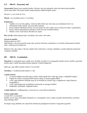CZ 300-54 Kouzelný míč Upozornění! Balení není součástí hračky. Prosíme, aby jste odstranili celou část balení ješte předtím, než ho dáte dítěti! Při použití hračky doporučujeme dohled dospělé osoby! Hra pro 1 a více osob od 2 let. Obsah: 1 ks textilního míče a 1 ks balóna Průběh hry: 1. Najděte otvor na boku plátna, vložte do něho balón tak, aby konec pro nafouknutí trčel ven. 2. Nafoukněte balón natolik, aby byla látka napnutá. 3. Konec balóna několikrát zatočte, ale neuvazujte do uzlu! (Takto jsou na konci hry lehce vypustitelné.) 4. Konec balóna jednoduchým pohybem vložte dovnitř textilního balóna. 5. Můžete s ním vesele házet, hlavičkovat, kopat. Hra rozvíjí vitální kapacitu plic, koordinaci oko-ruka a oko-noha. Návod na použití: Možnost praní na 30oC! Obal hračky a návod na použití uschovejte, protože informace nacházející se na těchto dokumentech můžete ještě v budoucnosti potřebovat! Přejeme Vám, aby radost z této hry splnila Vaše očekávání a všechny obohatila o mnoho dobrých zkušeností i krásných zážitků! HU 300-54 Csodalabda Figyelem! A csomagolás nem a játék része. Kérjük, távolítsa el a csomagolás minden részét, mielőtt a gyermek kezébe adja! A játék használata közben ajánlott a felnőtt felügyelet! Játék egy vagy több személy részére 2 éves kortól. Tartalma: 1 textilből készült labda és 1 lufi A játék menete: 1. A vászon oldalán keressük meg a nyílást, majd tegyük bele a lufit úgy, hogy a szájakifelé lógjon! 2. Fújjuk fel a lufit az anyagon belül annyira, hogy az anyag megfeszüljön! 3. A lufi végét többször tekerjük meg, de ne kössünk rá csomót! (Így a foglalkozás végén könnyen leengedhető.) 4. A lufi végét határozott mozdulattal csúsztassuk az anyagon belülre! 5. Dobhatjuk, fejelhetjük, rúghatjuk bátran. A játék fejleszti a vitálkapacitást, a szem-kéz és a szem-láb koordinációt. Fontos tudnivalók: A textil 30oC-on mosható! Kérjük, őrizze meg a használati útmutatót és a csomagolást, mert a rajtuk szereplő információkra a jövőben még szüksége lehet! Kívánjuk, hogy játékunk sok szép közös élménnyel gazdagítson kicsiket és nagyokat egyaránt! PL 300-54 Zaczarowana piłka Uwaga! Opakowanie nie wchodzi w skład zabawki. Prosimy o usunięcie całego opakowania z zabawki jeszcze przed tym jak ją dacie dziecku do zabawy! Zabawką wolno się bawić w obecności osoby dorosłej! Gra jest przeznaczona dla 1 i więcej osób powyżej 2 roku życia. Zawartość: 1 szt piłka z materiału oraz 1 szt balon Przebieg gry: 1. Znajdź otwór na boku materiału, włóż do niego balon, w taki sposób aby końcówka balonu znajdowała się na zewnątrz otworu. 2. Nadmuchaj balon znajdujący się wewnątrz balonu z materiału, dmuchaj aż będzie tkanina wystarczająco napięta. 3. Końcówkę balonu należy kilkakrotnie zakręćić, ale nie wiązać do węzła!(potem na końcu zabawy jest łatwo wypuśćić z niego powietrze.) 4. Końcówkę balonu po prostu wsuń do środka balonu z materiału. 5. Można go śmiało rzucać, główkować, kopać. Gra rozwija pojemność płuc, koordynację oczu-rąk oraz oczu-nóg. Instrukcja obsługi: Można prać w tamperaturze 30 stopni! Prosimy o zachowanie instrukcji oraz opakowania, ponieważ informacje w nich zawarte mogą być potrzebne! Życzymy udanej zabawy i wspaniałych wrażeń. Wierzymy, że gra spełni wasze oczekiwania i obogaci was o mnóstwo doświadczeń. RO 300-54 Mingea minune Atenţie! Ambalajul nu este parte a jocului. Îndepărtaţi orice ambalaj al produsului înainte de a da jucăria copilului! Acest produs poate fi folosit numai sub supravegherea unui adult! Joc pentru una sau mai multe persoane cu vârsta peste 2 ani. Conținut: 1 minge din textil și 1 balon Jocul: 1. 2. 3. 4. 5. Introduceţi balonul în orificiul de material lăsând gura balonului afară. Umfaţi în aşa fel încât materialul să se întindă. Capătul balonului trebuie răsucit de mai multe ori dar nu trebuie înnodat. (Aşa la sfârşitul jocului se poate dezumfla uşor.) Cu o mişcare energică capătul balonului trebuie introdus în interiorul materialului. Se poate arunca, lovi cu piciorul, pasa cu încredere. Jocul dezvoltă capacitatea vitală, coordonarea ochi-mâna și ochi-picioare. Important de știut: Textilul este lavabil la 30oC! Vă rugăm păstraţi ambalajul şi instrucţiunile de utilizare, deoarece vă pot fi utile pe viitor! Distracţie plăcută! SK 300-54 Čarovná lopta Upozornenie! Balenie nie je súčasťou hračky. Prosíme, aby ste odstránili celú časť balenia ešte predtým, ako ho dáte dieťaťu! Pri použití hračky odporúčame dohľad dospelej osoby! Hra pre 1 a viac osôb od 2 rokov. Obsah: 1 ks textilnej lopty a 1 ks balóna Priebeh hry: 1. Pohľadajme otvor na boku plátna, vložme do neho balón tak, aby koniec balóna trčal von. 2. Nafúkajme balón vo vnútri zázračného balóna natoľko, aby bola látka napnutá. 3. Koniec balóna niekoľkokrát zakrúťme, ale neuviažme do uzla! (Takto na konci hry sú ľahko spustiteľné.) 4. Koniec balóna jednoduchým pohybom vložme do vnútra zázračného balóna. 5. Môžeme ho smelo hádzať, hlavičkovať, kopať. Hra rozvíja vitálnu kapacitu pľúc, koordináciu očí-rúk a očí-nôh. Návod na použitie: Možnosť prania pri 30oC! Obal hračky a návod na použitie uschovajte, pretože informácie nachádzajúce sa na týchto dokumentoch môžete ešte v budúcnosti potrebovať! Prajeme Vám, aby radosť z tejto hry splnila Vaše očakávania a obohatila všetkých o veľa dobrých skúseností ako i krásnych zážitkov! SLO 300-54 Magična žoga Pozor! Embalaža ni del igrače. Prosimo vas, da odstranite vsak del embalaže. Prosimo, da je v času igranja s to igračo prisotna odrasla oseba! Igrača je primerna za eno ali več oseb. Priporočamo otrokom n