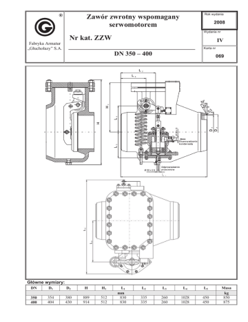 ® Rok wydania Zawór zwrotny wspomagany serwomotorem 2008 Wydanie nr Nr kat. ZZW IV Fabryka Armatur „Gáuchoáazy” S.A. Karta nr DN 350 – 400 069 Gáówne wymiary: DN D1 D2 H H1 350 400 354 404 380 430 889 914 512 512 L1 mm 830 830 L2 L3 L4 L5 335 335 260 260 1028 1028 450 450 Masa kg 850 875 Zastosowanie: Zawory zwrotne montuje siĊ na rurociągach doprowadzających parĊ grzewczą z upustów turbiny do podgrzewaczy regeneracyjnych. Zadaniem ich jest zabezpieczenie turbiny przed powrotnym przepáywem pary z ukáadu rurowego i podgrzewaczy. Zakres stosowania: PN [MPa] Tmax [qC] 2,5 300 2,5 300 ZZW H-5 DN 350 ZZW H-7 DN 350 ZZW H-5 DN 400 ZZW H-7 DN 400 Materiaáy: Nazwa czĊĞci Korpus zaworu Pokrywa zaworu Klapa powrotna Waá zaworu Táok zaworu Korpus serwomotoru Pokrywa serwomotoru Wrzeciono serwomotoru Tuleja serwomotoru Materiaá G17CrMo5-5 stal wĊglowa stal weglowa siedlisko napawane materiaáem typu 18-8 Cr-Ni stal weglowa stal wĊglowa 1.0619 stal weglowa 13 Cr Brąz Charakterystyka: Zawór zwrotny ZZW skáada siĊ z wáaĞciwego zaworu zwrotnego z klapą zwrotną i serwomotoru wyposaĪonego w áącznik kraĔcowy. WáaĞciwy zawór zwrotny skáada siĊ ze staliwnego korpusu ,umieszczonej w nim powrotnej sprzĊĪonej z mechanizmem sterującym klapĊ i strzaákĊ. Mechanizm sterujący klapą powrotną jest poáączony z serwomotorem. Na zewnĊtrznej stronie zaworu z jednej strony umieszczona jest skala a z przeciwnej serwomotor skáadający siĊ z korpusu, táoka, sprĊĪyny, wrzeciona i dĨwigni do áącznika kraĔcowego KW-211umocowanego na pokrywie zaworu. Zawór zwrotny ZZW umoĪliwia jednokierunkowy przepáyw pary i zabezpiecza przed zmianą kierunku przepáywu. Normalnie para przepáywa od turbiny do podgrzewacza. Otwarcie zaworu nastĊpuje przy braku ciĞnienia nad táokiem serwomotoru. SprĊĪyna serwomotoru siáą sprĊĪystoĞci cofa wrzeciono do górnego poáoĪenia. SprzĊĪona z nim dĨwignia poĞrednio przez mechanizm dĨwigniowy uwalnia klapĊ powrotną, a ta na skutek ciĞnienia przed zaworem otwiera zawór zwrotny. Spadek ciĞnienia przed zaworem nastĊpuje w wyniku zamkniĊcia automatycznego zaworu odcinającego turbiny. ZamkniĊcie zaworu automatycznego powoduje doprowadzenie przez zawór z elektromagnetycznym sterowaniem wody o ciĞnieniu minimalnym 0,7 MPa nad táok serwomotoru. W zaleĪnoĞci od ciĞnienia kondensatu zawór moĪe byü wyposaĪony w serwomotor SZZ-H5 lub SZZ-H7. UWAGA – W zapytaniu / zamówieniu prosimy o podanie norm i typu przyáącza oraz medium i parametry pracy. ® Producent i dostawca: Adres: Fabryka Armatur „Gáuchoáazy” S.A. 48-340 Gáuchoáazy ul. Wrocáawska 1A tel.: 077 / 439 19 44 fax: 077 / 439 19 46 e-mail: [email protected] http: www.fagsa.com.pl Producent zastrzega moĪliwoĞü wprowadzenia zmian w wyrobach bez powiadamiania.