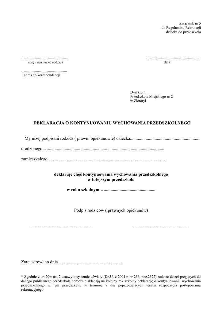 Załącznik nr 5 do Regulaminu Rekrutacji dziecka do przedszkola ….............................................. imię i nazwisko rodzica …..................................................... data …............................................. adres do korespondencji Dyrektor Przedszkola Miejskiego nr 2 w Złotoryi DEKLARACJA O KONTYNUOWANIU WYCHOWANIA PRZEDSZKOLNEGO My niżej podpisani rodzica ( prawni opiekunowie) dziecka............................................................... urodzonego …........................................................................................................ zamieszkałego ….................................................................................................... deklaruje chęć kontynuowania wychowania przedszkolnego w tutejszym przedszkolu w roku szkolnym …............................................. Podpis rodziców ( prawnych opiekunów) ….................................................... …............................................... Zarejestrowano dnia ….................................................... * Zgodnie z art.20w ust 2 ustawy o systemie oświaty (Dz.U. z 2004 r. nr 256, poz.2572) rodzice dzieci przyjętych do danego publicznego przedszkola corocznie składają na kolejny rok szkolny deklarację o kontynuowaniu wychowania przedszkolnego w tym przedszkolu, w terminie 7 dni poprzedzających termin rozpoczęcia postępowania rekrutacyjnego.