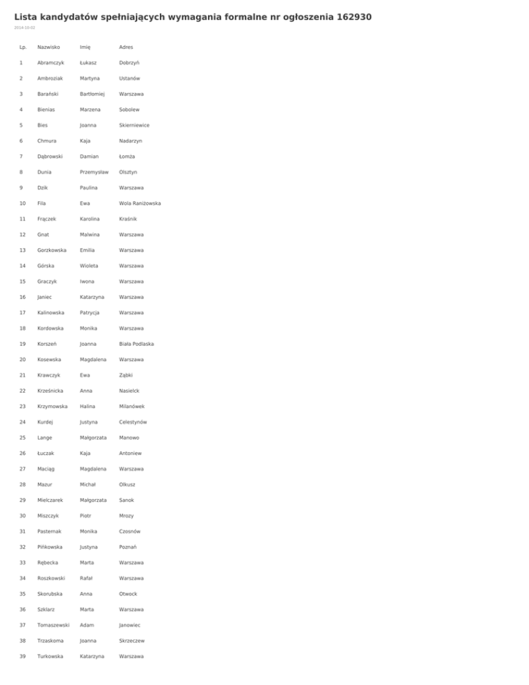 Lista kandydatów spełniających wymagania formalne nr ogłoszenia