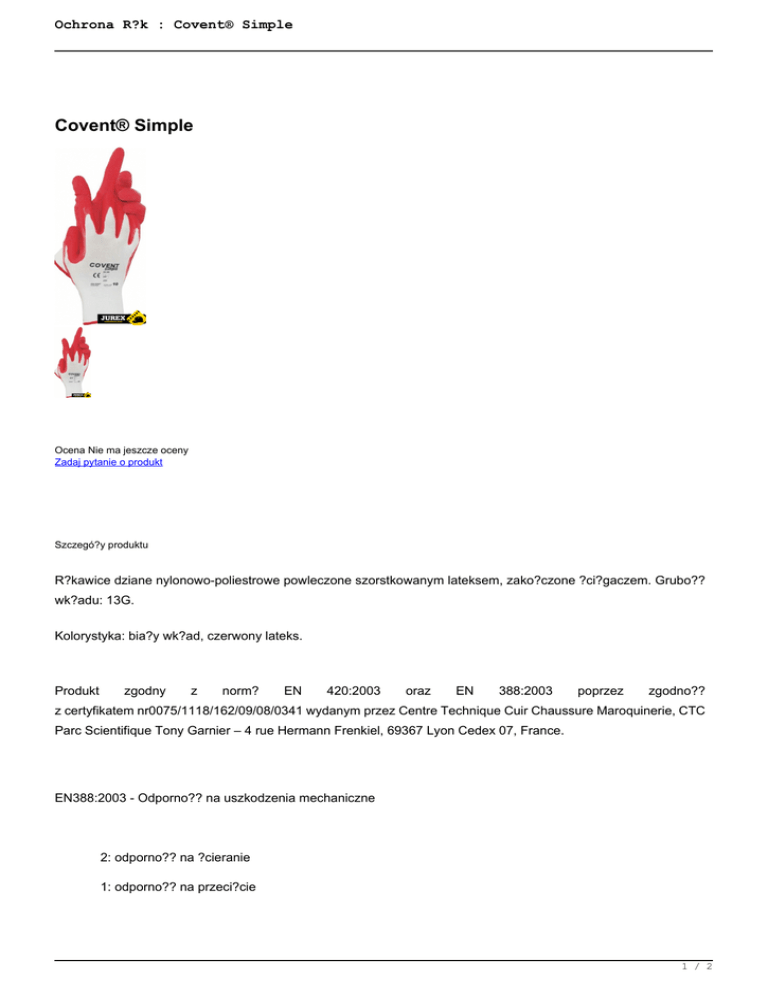 Ochrona R?k : Covent® Simple Covent® Simple Ocena Nie ma jeszcze oceny Zadaj pytanie o produkt Szczegó?y produktu R?kawice dziane nylonowo-poliestrowe powleczone szorstkowanym lateksem, zako?czone ?ci?gaczem. Grubo?? wk?adu: 13G. Kolorystyka: bia?y wk?ad, czerwony lateks. Produkt zgodny z norm? EN 420:2003 oraz EN 388:2003 poprzez zgodno?? z certyfikatem nr0075/1118/162/09/08/0341 wydanym przez Centre Technique Cuir Chaussure Maroquinerie, CTC Parc Scientifique Tony Garnier – 4 rue Hermann Frenkiel, 69367 Lyon Cedex 07, France. EN388:2003 - Odporno?? na uszkodzenia mechaniczne 2: odporno?? na ?cieranie 1: odporno?? na przeci?cie 1 / 2 Ochrona R?k : Covent® Simple 2: odporno?? na przedarcie 1: odporno?? na przebicie ZASTOSOWANIE - ochrona r?k przed mechanicznymi uszkodzeniami naskórka - poprawa chwytno?ci - przemys? maszynowy - prace budowlane - prace magazynowe - prace prze?adunkowe - transport - prace drogowe 2 / 2 Powered by TCPDF (www.tcpdf.org)