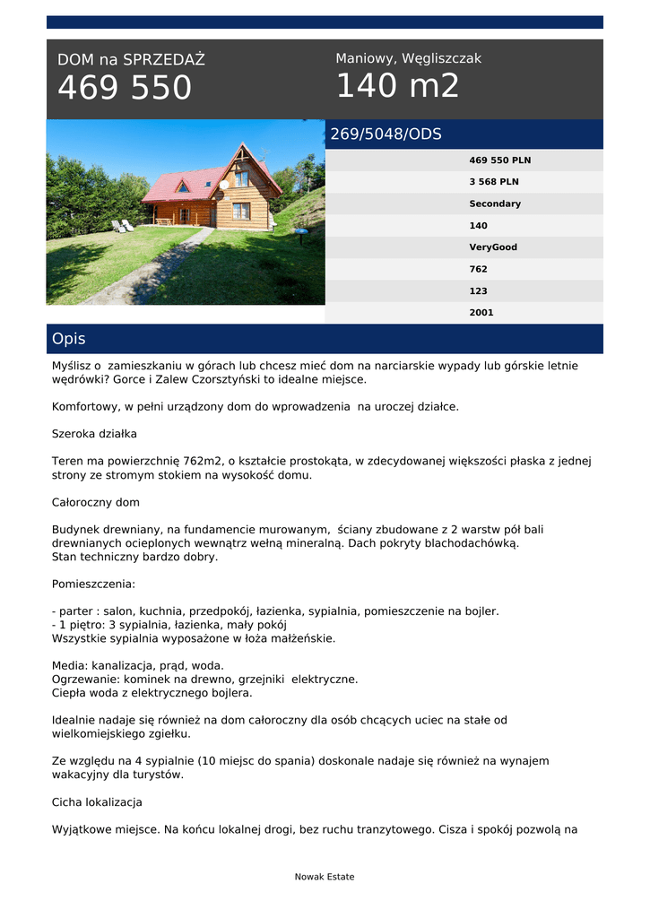 DOM na SPRZEDAŻ 469 550 Maniowy, Węgliszczak 140 m2 269/5048/ODS 469 550 PLN 3 568 PLN Secondary 140 VeryGood 762 123 2001 Opis Myślisz o zamieszkaniu w górach lub chcesz mieć dom na narciarskie wypady lub górskie letnie wędrówki? Gorce i Zalew Czorsztyński to idealne miejsce. Komfortowy, w pełni urządzony dom do wprowadzenia na uroczej działce. Szeroka działka Teren ma powierzchnię 762m2, o kształcie prostokąta, w zdecydowanej większości płaska z jednej strony ze stromym stokiem na wysokość domu. Całoroczny dom Budynek drewniany, na fundamencie murowanym, ściany zbudowane z 2 warstw pół bali drewnianych ocieplonych wewnątrz wełną mineralną. Dach pokryty blachodachówką. Stan techniczny bardzo dobry. Pomieszczenia: - parter : salon, kuchnia, przedpokój, łazienka, sypialnia, pomieszczenie na bojler. - 1 piętro: 3 sypialnia, łazienka, mały pokój Wszystkie sypialnia wyposażone w łoża małżeńskie. Media: kanalizacja, prąd, woda. Ogrzewanie: kominek na drewno, grzejniki elektryczne. Ciepła woda z elektrycznego bojlera. Idealnie nadaje się również na dom całoroczny dla osób chcących uciec na stałe od wielkomiejskiego zgiełku. Ze względu na 4 sypialnie (10 miejsc do spania) doskonale nadaje się również na wynajem wakacyjny dla turystów. Cicha lokalizacja Wyjątkowe miejsce. Na końcu lokalnej drogi, bez ruchu tranzytowego. Cisza i spokój pozwolą na Nowak Estate pełną i szybka regenerację zarówno przy wypadach weekendowych oraz dłuższych wakacjach. Położony ok. 150m od linii brzegowej. Rekreacja W odległości 5km znajduje się stok narciarski Kluszkowce z wyciągiem krzesełkowym. W lecie Zalew Czorsztyński umożliwia żeglugę statkami pasażerskimi. Jest możliwość uprawiania żeglarstwa. Na jego brzegiem znajdują się 2 słynne atrakcje turystyczne: zamek w Niedzicy oraz zamek w Czorsztynie. W odległości 14km zlokalizowana jest przystań flisacka, gdzie rozpoczynają się spływy Dunajcem jedna z najpiękniejszych atrakcji przyrodniczych w Polsce. Możliwość zamiany na mieszkanie w Krakowie. Zapraszam na prezentacje. Tomasz Nowak tel. 602 667 669 email: [email protected] Nowak Estate Powered by TCPDF (www.tcpdf.org)