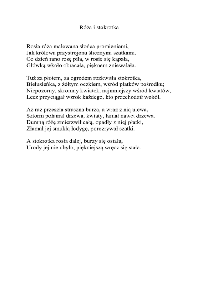 Róża i stokrotka Rosła róża malowana słońca promieniami, Jak królowa przystrojona ślicznymi szatkami. Co dzień rano rosę piła, w rosie się kąpała, Główką wkoło obracała, pięknem zniewalała. Tuż za płotem, za ogrodem rozkwitła stokrotka, Bielusieńka, z żółtym oczkiem, wśród płatków pośrodku; Niepozorny, skromny kwiatek, najmniejszy wśród kwiatów, Lecz przyciągał wzrok każdego, kto przechodził wokół. Aż raz przeszła straszna burza, a wraz z nią ulewa, Sztorm połamał drzewa, kwiaty, łamał nawet drzewa. Dumną różę zmierzwił całą, opadły z niej płatki, Złamał jej smukłą łodygę, porozrywał szatki. A stokrotka rosła dalej, burzy się ostała, Urody jej nie ubyło, piękniejszą wręcz się stała.