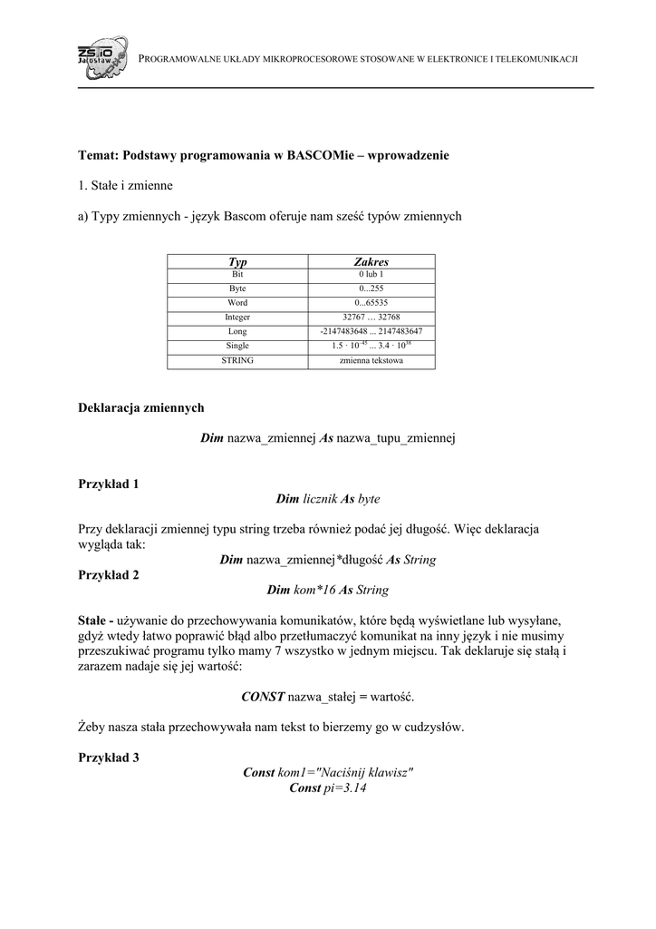 PROGRAMOWALNE UKŁADY MIKROPROCESOROWE STOSOWANE W ELEKTRONICE I TELEKOMUNIKACJI Temat: Podstawy programowania w BASCOMie – wprowadzenie 1. Stałe i zmienne a) Typy zmiennych - język Bascom oferuje nam sześć typów zmiennych Typ Zakres Bit 0 lub 1 Byte 0...255 Word 0...65535 Integer 32767 … 32768 Long -2147483648 ... 2147483647 Single 1.5 · 10–45 ... 3.4 · 1038 STRING zmienna tekstowa Deklaracja zmiennych Dim nazwa_zmiennej As nazwa_tupu_zmiennej Przykład 1 Dim licznik As byte Przy deklaracji zmiennej typu string trzeba również podać jej długość. Więc deklaracja wygląda tak: Dim nazwa_zmiennej*długość As String Przykład 2 Dim kom*16 As String Stałe - używanie do przechowywania komunikatów, które będą wyświetlane lub wysyłane, gdyż wtedy łatwo poprawić błąd albo przetłumaczyć komunikat na inny język i nie musimy przeszukiwać programu tylko mamy 7 wszystko w jednym miejscu. Tak deklaruje się stałą i zarazem nadaje się jej wartość: CONST nazwa_stałej = wartość. Żeby nasza stała przechowywała nam tekst to bierzemy go w cudzysłów. Przykład 3 Const kom1="Naciśnij klawisz" Const pi=3.14 PROGRAMOWALNE UKŁADY MIKROPROCESOROWE STOSOWANE W ELEKTRONICE I TELEKOMUNIKACJI Tablice – przed użyciem tablic należy je zadeklarować. Odbywa się to w podobny sposób, jak w przypadku zmiennych: Dim nazwa_tablicy (długość tablicy) As nazwa_typu_zmiennej Przykład 4 Dim tab (12) As byte Wpisywanie wartości do tablicy odbywa się tak samo jak w przypadku zmiennej, z tą różnicą, że wskazujemy, do którego elementu tablicy wpisujemy wartość. Przykład 5 Dim tab (12) As byte tab(10)="a" tab(3)=1 Działania – działania wykonujemy na zmiennych, mogą to być działania arytmetyczne. Podstawowe działania: Znak Działanie Znak Działanie + * / Dodawanie Odejmowanie Mnożenie Dzielenie Działania możemy wykonywać na zmiennych, stałych bądź podanych wprost liczbach. Przykład 6 Dim A As Byte Dim B As Byte Dim wynik As Byte wynik=A+B 'suma zmiennej A i B wynik=A/5 'zmienną A dzielimy przez 5 wynik=wynik-1 'zmniejszamy zmienną wynik o jeden W przykładzie pokazałem jak wykonywać działania arytmetyczne. Warto zwrócić uwagę na ostatnią operację, czyli dekrementację (zmniejszenie wartości o jeden) zmiennej wynik. Tą operacje powinniśmy zastąpić rozkazem DECR. To samo dotyczy się inkrementacji, czyli zwiększenia wartości zmiennej o jeden, zamiast działania używamy rozkazu INCR. PROGRAMOWALNE UKŁADY MIKROPROCESOROWE STOSOWANE W ELEKTRONICE I TELEKOMUNIKACJI Przykład 7 Dim A AS Byte Incr A 'stosujemy to zamiast A=A+1 Decr A 'stosujemy to zamiast A=A-1 Operatory Teraz zapoznajmy się z operatorami. Będą one nam bardzo przydatne w pętlach oraz rozkazach warunkowych. W tabelce przedstawiono wszystkie dostępne operatory w języku Bascom. Oczywiście nie wszystkich będziemy używać. Na co dzień używa się tylko paru z nich, lecz bywają sytuacje, że przydają się także nietypowe, więc podaję wszystkie. Operator Znaczenie Operator = > < <> <= >= Znaczenie równy większy mniejszy różny mniejsze lub równe większe lub równe Operacje na bitach Nauczyliśmy się już parę rzeczy. Teraz czas na zapoznanie się z operacjami na bitach, a dokładnie na portach procesora. Oczywiście zaczynamy od konfiguracji. Konfiguracja Portów Jak wiemy w procesorach z rodziny AVR musimy się zdecydować czy dany pin/port będzie wejściem czy wyjściem. A w przypadku jak będzie wejściem czy ma być podciągnięty do Vcc. Do konfigurowania portów służy polecenie o następującej składni Config Portx =output/input, gdzie zamiast x wstawiamy literkę portu. Jeśli po znaku „=” napiszemy output to port będzie wyjściowy, a jeśli input to będzie wejściowy. Jeśli potrzebujemy skonfigurować tylko jeden pin to prostu robimy to następująco: Config Pinx.y = output/input, gdzie zamiast x wstawiamy literkę portu, a zamiast y numer pinu. W przypadku kiedy pin/port jest wyjściowy to możemy go podciągnąć do Vcc. Postępujemy tak w przypadku, kiedy czekamy na sygnał niski. Czyli na przykład: do Portu 1 jest podpięty przycisk, który w PROGRAMOWALNE UKŁADY MIKROPROCESOROWE STOSOWANE W ELEKTRONICE I TELEKOMUNIKACJI momencie naciśnięcia daje sygnał niski(Gnd) na ten pin. Jak to zrobić pokazuje poniższy przykład. Przykład 8 Config Pind.1=Output 'Pind.1 jako wyjściowy Set Portd.1 'Podciągniecie Pind.1 do Vcc Jeśli byśmy nie podciągnęli tego pinu to przy sprawdzaniu jego stanu okazałoby się, że jest zero, a przecież przycisk jest naciśnięty. Operacje na bitach Gdy chcemy wysłać coś na port, to używamy nazwy Potrx.y, a jeśli pobieramy coś z portu to używamy nazwy Pinx.y. Teraz poznajmy polecenia, dzięki którym będziemy sterować stanami na portach. Aby wysłać coś na port to po prostu piszemy jego nazwę, znak = i wartość lub zmienną(koniecznie 8-bitową). Natomiast jeśli chcemy sterować pojedynczym bitem to robimy to przy pomocy poleceń: Set Portx.y - aby ustawić stan wysoki, Reset Portx.y – aby ustawić stan niski. Jest jaszcze jedno bardzo pożyteczne polecenie służące do sterowania bitami. Mianowicie toggle, które zmienia stan bitu na przeciwny. Przykład 9 Dim A As Byte Config Portb=Output Portb=A 'zawartość zmiennej 'A będzie wystawiona 'na Portb Set Portb.1 'ustawienie Portb.1 Reset Portb.7 'wyzerowanie Portb.7 Bascom posiada jeszcze jedną operacje na bitach, czyli przypisywanie aliasów. Alias to jakby nazwa (etykieta), którą przypisujemy pinowi. Jest to bardzo pożyteczne, bo łatwiej zapamiętać nazwę niż numer portu. Poza tym, gdy piszemy długi i skomplikowany program, używanie aliasów umożliwia szybką zmianę nazwy pinu w przypadku pomyłki. Na przykładzie pokażę jak się przypisuje Alias. Przykład 10 led Alias Portb.1 'przypisania aliasu Portb.1 napis Alias Portd.5 'przypisania aliasu Portb.1 Set napis Reset led