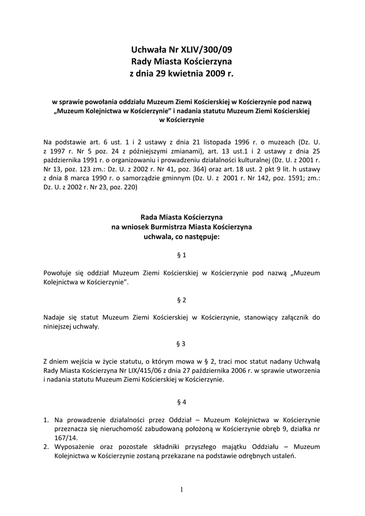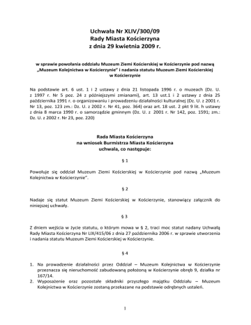 Uchwała Nr XLIV/300/09 Rady Miasta Kościerzyna z dnia 29 kwietnia 2009 r. w sprawie powołania oddziału Muzeum Ziemi Kościerskiej w Kościerzynie pod nazwą „Muzeum Kolejnictwa w Kościerzynie” i nadania statutu Muzeum Ziemi Kościerskiej w Kościerzynie Na podstawie art. 6 ust. 1 i 2 ustawy z dnia 21 listopada 1996 r. o muzeach (Dz. U. z 1997 r. Nr 5 poz. 24 z późniejszymi zmianami), art. 13 ust.1 i 2 ustawy z dnia 25 października 1991 r. o organizowaniu i prowadzeniu działalności kulturalnej (Dz. U. z 2001 r. Nr 13, poz. 123 zm.: Dz. U. z 2002 r. Nr 41, poz. 364) oraz art. 18 ust. 2 pkt 9 lit. h ustawy z dnia 8 marca 1990 r. o samorządzie gminnym (Dz. U. z 2001 r. Nr 142, poz. 1591; zm.: Dz. U. z 2002 r. Nr 23, poz. 220) Rada Miasta Kościerzyna na wniosek Burmistrza Miasta Kościerzyna uchwala, co następuje: §1 Powołuje się oddział Muzeum Ziemi Kościerskiej w Kościerzynie pod nazwą „Muzeum Kolejnictwa w Kościerzynie”. §2 Nadaje się statut Muzeum Ziemi Kościerskiej w Kościerzynie, stanowiący załącznik do niniejszej uchwały. §3 Z dniem wejścia w życie statutu, o którym mowa w § 2, traci moc statut nadany Uchwałą Rady Miasta Kościerzyna Nr LIX/415/06 z dnia 27 października 2006 r. w sprawie utworzenia i nadania statutu Muzeum Ziemi Kościerskiej w Kościerzynie. §4 1. Na prowadzenie działalności przez Oddział – Muzeum Kolejnictwa w Kościerzynie przeznacza się nieruchomość zabudowaną położoną w Kościerzynie obręb 9, działka nr 167/14. 2. Wyposażenie oraz pozostałe składniki przyszłego majątku Oddziału – Muzeum Kolejnictwa w Kościerzynie zostaną przekazane na podstawie odrębnych ustaleń. 1 §5 Zapewnia się Muzeum środki niezbędne do utrzymania nieruchomości określonej w § 4 niniejszej uchwały, a także prowadzenia działalności w zakresie utworzonego Oddziału. §6 Wykonanie uchwały powierza się Burmistrzowi Miasta Kościerzyna. §7 Uchwała wchodzi w życie po upływie 14 dni od jej ogłoszenia w Dzienniku Urzędowym Województwa Pomorskiego. Przewodniczący Rady Miasta Kościerzyna Andrzej Gierszewski Uzasadnienie Od ponad wieku kolejnictwo wpisuje się w 600-letnią historię Kościerzyny. Począwszy od 1885 roku, kiedy do miasta wjechał pierwszy parowóz, poprzez budowę magistrali węglowej kolej była oknem na świat dla mieszkańców ziemi kościerskiej. Wspaniałym świadectwem historii i znaczenia kolejnictwa na Pomorzu było utworzenie w 1992 roku w Kościerzynie przez władze Polskich Kolei Państwowych Skansenu „Parowozownia Kościerzyna”. W nim zatrzymał się czas dla najlepszych tradycji polskiego kolejnictwa. W obliczu likwidacji Skansenu, świadomi tradycji i wartości nie tylko kościerskiego kolejnictwa, Burmistrz i Rada Miasta Kościerzyna pragną otoczyć zbiory finansową i merytoryczną opieką poprzez utworzenie w Kościerzynie Muzeum Kolejnictwa stanowiącego oddział Muzeum Ziemi Kościerskiej w Kościerzynie. Ze względów merytorycznych jest zatem uzasadnione utworzenie Muzeum Kolejnictwa w Kościerzynie jako oddziału Muzeum Ziemi Kościerskiej. 2 W uzgodnieniu: Minister Kultury i Dziedzictwa Narodowego Załącznik nr 1 do uchwały Rady Miasta Kościerzyna Nr XLIV/300/09 z dnia 29 kwietnia 2009 r. STATUT Muzeum Ziemi Kościerskiej w Kościerzynie ROZDZIAŁ I Postanowienia ogólne §1 Muzeum Ziemi Kościerskiej w Kościerzynie, zwane dalej „Muzeum” w szczególności działa na podstawie: a) ustawy z dnia 8 marca 1990 r. o samorządzie gminnym (tekst jednolity Dz.U. z 2001 r. Nr 142, poz. 1591 z późniejszymi zmianami), b) ustawy z dnia 25 października 1991 r. o organizowaniu i prowadzeniu działalności kulturalnej (tekst jednolity Dz.U. z 2001 r. Nr 13, poz. 123, z późniejszymi zmianami), c) ustawy z dnia 21 listopada 1996 r. o muzeach (Dz.U. z 1997 r. Nr 5, poz. 24 z późniejszymi zmianami), d) niniejszego statutu. §2 1. Organizatorem Muzeum jest Gmina Miejska Kościerzyna. 2. Muzeum jest samorządową instytucją kultury, wpisaną do rejestru instytucji kultury prowadzonego przez Gminę Miejską Kościerzyna i posiada osobowość prawną. §3 Gmina Miejska Kościerzyna zapewnia środki potrzebne do utrzymania i rozwoju Muzeum. §4 Siedzibą Muzeum jest miasto Kościerzyna, a terenem działania obszar Rzeczypospolitej Polskiej. 3 §5 Muzeum używa pieczęci okrągłej z herbem miasta w środku i napisem w otoku: Muzeum Ziemi Kościerskiej w Kościerzynie. ROZDZIAŁ II Cele i zadania Muzeum §6 Muzeum jest jednostką organizacyjną nienastawioną na osiąganie zysku, której celem jest gromadzenie i trwała ochrona dóbr naturalnego i kulturalnego dziedzictwa ludzkości o charakterze materialnym i niematerialnym, informowanie o wartościach i treściach gromadzonych zbiorów, upowszechnianie podstawowych wartości historii, nauki i kultury polskiej oraz światowej, kształtowanie wrażliwości poznawczej i estetycznej oraz umożliwianie korzystania ze zgromadzonych zbiorów. §7 Muzeum realizuje cele określone w § 6 przez: a) gromadzenie zabytków i materiałów dokumentacyjnych z zakresu historii, kultury, etnografii, kolejnictwa oraz przyrodoznawstwa, b) inwentaryzowanie, katalogowanie i naukowe opracowywanie zgromadzonych zbiorów oraz materiałów dokumentacyjnych, c) przechowywanie gromadzonych zabytków, w warunkach zapewniających im właściwy stan zachowania i bezpieczeństwo oraz magazynowanie ich w sposób dostępny dla badań naukowych, d) zabezpieczenie i konserwację zgromadzonych zbiorów oraz, w miarę możliwości, zabezpieczanie zabytków archeologicznych nieruchomych oraz innych nieruchomych obiektów kultury materialnej i przyrody, e) organizowanie, prowadzenie badań naukowych w zakresie dyscyplin w nim reprezentowanych, f) urządzanie wystaw stałych, czasowych i okazjonalnych ze zbiorów własnych i wypożyczonych, g) prowadzenie działalności edukacyjnej (odczyty, prelekcje, pogadanki, spotkania, koncerty), h) udostępnianie zbiorów dla 