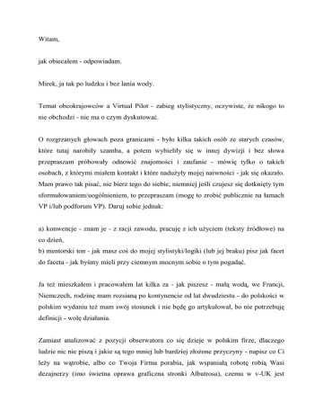 Witam, jak obiecałem - odpowiadam. Mirek, ja tak po ludzku i bez lania wody. Temat obcokrajowców a Virtual Pilot - zabieg stylistyczny, oczywiste, że nikogo to nie obchodzi - nie ma o czym dyskutować. O rozgrzanych głowach poza granicami - było kilka takich osób ze starych czasów, które tutaj narobiły szamba, a potem wybieliły się w innej dywizji i bez słowa przepraszam próbowały odnowić znajomości i zaufanie - mówię tylko o takich osobach, z którymi miałem kontakt i które nadużyły mojej naiwności - jak się okazało. Mam prawo tak pisać, nie bierz tego do siebie, niemniej jeśli czujesz się dotknięty tym sformułowaniem/uogólnieniem, to przepraszam (mogę to zrobić publicznie na łamach VP i/lub podforum VP). Daruj sobie jednak: a) konwencje - znam je - z racji zawodu, pracuję z ich użyciem (teksty źródłowe) na co dzień, b) mentorski ton - jak masz coś do mojej stylistyki/logiki (lub jej braku) pisz jak facet do faceta - jak byśmy mieli przy ciemnym mocnym sobie o tym pogadać. Ja też mieszkałem i pracowałem lat kilka za - jak piszesz - małą wodą, we Francji, Niemczech, rodzinę mam rozsianą po kontynencie od lat dwudziestu - do polskości w polskim wydaniu też mam swój stosunek i nie będę go artykułował, bo nie potrzebuję definicji - wolę działania. Zamiast analizować z pozycji obserwatora co się dzieje w polskim firze, dlaczego ludzie nic nie piszą i jakie są tego mniej lub bardziej złożone przyczyny - napisz co Ci leży na wątrobie, albo co Twoja Firma porabia, jak wspaniałą robotę robią Wasi dezajnerzy (imo świetna oprawa graficzna stronki Albatrosa), czemu w v-UK jest lepiej niż w v-PL (a może nie tylko v?) i prześlij do publikacji - jednym słowem zrób cokolwiek, żeby sytuacja zaczęła się zmieniać, a nie prostuj mojego skrzywionego pojęcia o szefostwie (tym oficjalnym) i szarych eminencjach PL-VACC. Jeśli sądzisz,/sądzicie że Cassubian VA albo Virtual Pilot jest agendą PL-VACC to ZARĘCZAM CI - nie jest tak. Nikomu nie liżemy d..., nie wdajemy się w dyskusje, nie uczestniczymy w przepychankach, nie pełnimy funkcji - Tomek Sokołowski jest ACCPL2 bo dobrze szkoli (i tyle) - chłopie! - robimy swoje, szósty rok leci. Taki mieliśmy pomysł, taką mamy wizję, a czy się to iksińskiemu czy Smithowi podoba czy nie - ich sprawa, niezależnie od ratingu, pozycji czy "poważania". Cassubian zaczęła jak każda nowa VA - zgnoili nas, a ja się wdałem w pyskówki z ludźmi, których nie znałem, poczytując to wszystko jako atak na siebie, na młodych, chętnych i tak dalej. Ale jak zacząłem po kilku tygodniach, może miesiącach analizować, to sobie uzmysłowiłem: a) latałem (lataliśmy) na zachód na nieparzystych, b) TDR 1450ft/min podane do publicznej informacji, c) chu... strona, co wyglądała jak z d..., d) na ILSa naprowadzało mnie albo samowektorowanie albo te różowe kółka z FSa, e) do planowania lotu używałem... niczego nie używałem, bo nie planowałem, f) wymieniać dalej? I z tym wyszedłem do ludzi (sam, przez nikogo nieproszony), mając nadzieję, że mnie poklepią po ramieniu i powiedzą "Ale zaje... robotę robisz"... To zacząłem od zera - to znaczy od przeprosin za pyskówki i nauki podstaw, których słusznie brak mi/nam wytknięto. Tak działam do dziś, taką filozofię przyjąłem dla Cassubian VA, Koła Symulacji Lotniczych, Kaszubskiej Szkoły Pilotażu i wreszcie Virtual Pilota. Co nie znaczy, że liżę komuś....... sam sobie resztę dopowiedz. Najbardziej mi jednak nie pasuje fragment Twojego maila o mojej (zamierzonej czy nie) desperacji. Mirek - na litość boską - nie muszę nikomu udowadniać, że wierzę w to co robię. Nie bój się - pisaliśmy, pisać będziemy, czy PL-VACC nas wesprze czy nie, czy VA się zmobilizują czy nie, czy wolni strzelcy opublikują coś czy nie - czy będzie 350 czytelników czy 3... Powód? Chcesz znać moje powody? Podam przykładowo: 1. Lubię pisać (nie wiem czy robię to dobrze, ale lubię). 2. Chciałem zrobić coś oddolnie, może nie profesjonalnie, ale szczerze (i wierzę, że tak jest). 3. Uznałem w porozumieniu z kumplami z Cassubiana, że to dobra metoda promocji własnej VA (bo logo, bo historia, bo nazwa itp.) 4. Istnieje opcja, że ludzie się otworzą z czasem (jak sam o tym piszesz) i powstanie coś fajnego, bo wspólnego. I tak dalej. I Mirek na koniec powód mojego "desperackiego" gorącego apelu. Jak ogłosiliśmy zmiane z Cassubian Newsletter na Virtual Pilot otrzymałem co najmniej 3 poważne (od poważnych osób, nie wymienię nazwisk przez grzeczność) zapewnienia/propozycje/sugestie, że coś napiszą. Nie wiem czego oczekiwały - że je poprosimy, albo, że zaoferujemy stołki (śmieszne!) czy co tam jeszcze... Typowo polskie podejście - obiecać i... nie zrobić. Tylko i aż tyle. Od nic nie robienia, jeszcze się nic nie zmieniło na lepsze Mirek, o czym sam doskonale wiesz. Chcesz/chcecie pisać, nadsyłać, redagować własną część - piszcie/redagujcie. Czy to będzie zgodne/niezgodne z "oficjalną linią" - dla mnie/nas nie ma czegoś takiego. Nikomu i niczemu nie podlegamy oprócz CoC, literki nie zmienimy w nadesłanym materiale, bo i z jakiej racji? W stopce będzie tylko adnotacja, że Cassubian VA będąca wydawcą VP nie bierze odpowiedzialności za teksty i tak dalej. Mirek, wybacz styl tego maila, ale właśnie tak chciałem to napisać. Napiszecie - super. Nie napiszecie - drugie super. Uznasz mnie za kretyna - proszę uprzejmie. Zaprosisz kiedyś na browara - chętnie skorzystam. Naprawdę szczerze pozdrawiam i jeszcze raz gratuluję stronki, a o działalności Albatrosa bym chętnie poczytał więcej. A, zapomniałbym o najważniejszym - dzięki tak w ogóle za maila - fajnie, że jest odzew. Krytykę znoszę ciężko, ale wierz mi - każdą przyjmę i przemyślę. Do przeczytania (mam nadzieję). Regards..