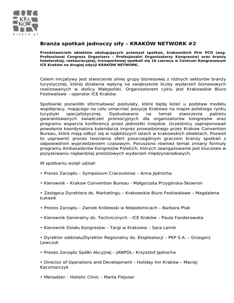 Branża spotkań jednoczy siły – KRAKÓW NETWORK #2 Przedstawiciele obiektów obsługujących przemysł spotkań, krakowskich firm PCO (ang. Professional Congress Organizers – Profesjonalni Organizatorzy Kongresów) oraz branży hotelarskiej, restauracyjnej, transportowej spotkali się 16 czerwca w Centrum Kongresowym ICE Kraków na drugiej edycji KRAKÓW NETWORK. Celem inicjatywy jest stworzenie silnej grupy biznesowej z różnych sektorów branży turystycznej, której działania wpłyną na zwiększenie liczby wydarzeń biznesowych realizowanych w stolicy Małopolski. Organizatorem cyklu jest Krakowskie Biuro Festiwalowe – operator ICE Kraków. Spotkanie pozwoliło sformułować postulaty, które będą leżeć u podstaw modelu współpracy, mającego na celu umacniać pozycję Krakowa na mapie polskiego rynku turystyki specjalistycznej. Dyskutowano na temat stworzenia pakietu gwarantowanych świadczeń promocyjnych dla organizatorów kongresów oraz programu wsparcia konferencji przez jednostki miejskie. Uczestnicy zaproponowali powołanie koordynatora kalendarza imprez prowadzonego przez Krakow Convention Bureau, które mają odbyć się w najbliższych latach w krakowskich obiektach. Pozwoli to usprawnić proces tworzenia ofert poszczególnym graczom branży spotkań z odpowiednim wyprzedzeniem czasowym. Poruszono również temat zmiany formuły programu Ambasadorów Kongresów Polskich, których zaangażowanie jest kluczowe w pozyskiwaniu najbardziej prestiżowych wydarzeń międzynarodowych. W spotkaniu wzięli udział: • Prezes Zarządu – Symposium Cracoviense – Anna Jędrocha • Kierownik – Krakow Convention Bureau - Małgorzata Przygórska-Skowron • Zastępca Dyrektora ds. Marketingu – Krakowskie Biuro Festiwalowe – Magdalena Łukasik • Prezes Zarządu – Zamek Królewski w Niepołomicach – Barbara Ptak • Kierownik Generalny ds. Technicznych – ICE Kraków – Paula Fanderowska • Kierownik Działu Kongresów – Targi w Krakowie – Sara Lamik • Dyrektor oddziału/Dyrektor Regionalny ds. Eksploatacji – PKP S.A. – Grzegorz Lewczuk • Prezes Zarządu Spółki Akcyjnej – JANPOL– Krzysztof Jędrocha • Director of Operations and Development – Holiday Inn Kraków – Maciej Kaczmarczyk • Menadżer – Holistic Clinic – Marta Flejszar • Radny Miasta Kraków – Aleksander Miszalski • Współwłaściciel – SeeKraków – Mieszko Laskowski • Współwłaściciel – See Kraków – Piotr Pryszcz • Prezes Zarządu i CEO – Grupa A-05 – Piotr Wilczek • Menadżer Generalny – Accor - Novotel Kraków Centrum – Renata Komarzinska • Menadżer Generalny – Accor - Novotel Kraków City West – Sabina Bartyzel • Prezes Zarządu – Target Service sp.j – Radosław Fronc • Członek Zarządu – Kopalni Soli w Wieliczce Trasa Turystyczna Sp. o.o – Marcin Andrukowicz • Dyrektor Generalny – Park Inn by Radisson – Urszula Krańska • Właściciel – MANIFOLD business cab&transport Kraków– Maciej Socha • Redaktor Naczelny – Miesięcznik Karnet – Grzegorz Słącz • Właściciel – Stalowe Magnolie i The Piano Rouge – Max Dudhia Kolejne spotkanie KRAKÓW NETWORK odbędzie się jesienią. Powered by TCPDF (www.tcpdf.org)