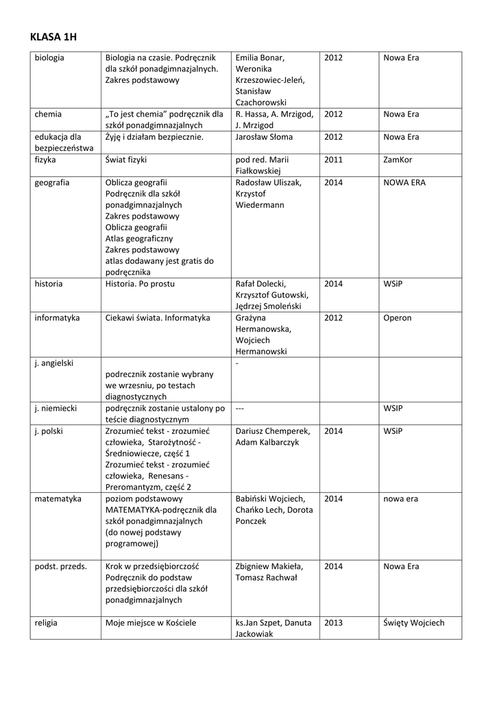 KLASA 1H biologia Biologia na czasie. Podręcznik dla szkół ponadgimnazjalnych. Zakres podstawowy chemia „To jest chemia” podręcznik dla szkół ponadgimnazjalnych Żyję i działam bezpiecznie. edukacja dla bezpieczeństwa fizyka geografia Świat fizyki historia Oblicza geografii Podręcznik dla szkół ponadgimnazjalnych Zakres podstawowy Oblicza geografii Atlas geograficzny Zakres podstawowy atlas dodawany jest gratis do podręcznika Historia. Po prostu informatyka Ciekawi świata. Informatyka j. angielski j. niemiecki j. polski matematyka podrecznik zostanie wybrany we wrzesniu, po testach diagnostycznych podręcznik zostanie ustalony po teście diagnostycznym Zrozumieć tekst - zrozumieć człowieka, Starożytność Średniowiecze, część 1 Zrozumieć tekst - zrozumieć człowieka, Renesans Preromantyzm, część 2 poziom podstawowy MATEMATYKA-podręcznik dla szkół ponadgimnazjalnych (do nowej podstawy programowej) Emilia Bonar, Weronika Krzeszowiec-Jeleń, Stanisław Czachorowski R. Hassa, A. Mrzigod, J. Mrzigod Jarosław Słoma 2012 Nowa Era 2012 Nowa Era 2012 Nowa Era pod red. Marii Fiałkowskiej Radosław Uliszak, Krzystof Wiedermann 2011 ZamKor 2014 NOWA ERA Rafał Dolecki, Krzysztof Gutowski, Jędrzej Smoleński Grażyna Hermanowska, Wojciech Hermanowski - 2014 WSiP 2012 Operon --- WSIP Dariusz Chemperek, Adam Kalbarczyk 2014 WSiP Babiński Wojciech, Chańko Lech, Dorota Ponczek 2014 nowa era podst. przeds. Krok w przedsiębiorczość Podręcznik do podstaw przedsiębiorczości dla szkół ponadgimnazjalnych Zbigniew Makieła, Tomasz Rachwał 2014 Nowa Era religia Moje miejsce w Kościele ks.Jan Szpet, Danuta Jackowiak 2013 Święty Wojciech KLASA 1H wiedza o kulturze Spotkania z kulturą. Podręcznik do wiedzy o kulturze (z dołączoną płytą) WOS W centrum uwagi. Podręcznik do wiedzy o społeczeństwie dla szkół ponadgimnazjalnych Monika Bokiniec, Barbara Forysiewicz, Jacek Michałowski, Natalia Mrozkowiak Nastrożna, Grzegorz Nazaruk, Magdalena Sacha, Grazyna Świętochowska A. Janicki 2014 Nowa Era 2012 lub nowszy Nowa Era