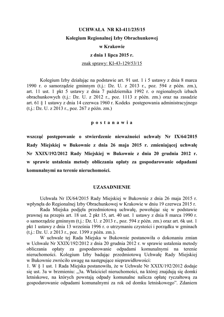 UCHWAŁA NR KI-411/235/15 Kolegium Regionalnej Izby Obrachunkowej w Krakowie z dnia 1 lipca 2015 r. znak sprawy: KI-43-129/53/15 Kolegium Izby działając na podstawie art. 91 ust. 1 i 5 ustawy z dnia 8 marca 1990 r. o samorządzie gminnym (t.j.: Dz. U. z 2013 r., poz. 594 z późn. zm.), art. 11 ust. 1 pkt 5 ustawy z dnia 7 października 1992 r. o regionalnych izbach obrachunkowych (t.j.: Dz. U. z 2012 r., poz. 1113 z późn. zm.) oraz na zasadzie art. 61 § 1 ustawy z dnia 14 czerwca 1960 r. Kodeks postępowania administracyjnego (t.j.: Dz. U. z 2013 r., poz. 267 z późn. zm.) p os t a n a w ia wszcząć postępowanie o stwierdzenie nieważności uchwały Nr IX/64/2015 Rady Miejskiej w Bukownie z dnia 26 maja 2015 r. zmieniającej uchwałę Nr XXIX/192/2012 Rady Miejskiej w Bukownie z dnia 20 grudnia 2012 r. w sprawie ustalenia metody obliczania opłaty za gospodarowanie odpadami komunalnymi na terenie nieruchomości. UZASADNIENIE Uchwała Nr IX/64/2015 Rady Miejskiej w Bukownie z dnia 26 maja 2015 r. wpłynęła do Regionalnej Izby Obrachunkowej w Krakowie w dniu 19 czerwca 2015 r. Rada Miejska podjęła przedmiotową uchwałę, powołując się w podstawie prawnej na przepis art. 18 ust. 2 pkt 15, art. 40 ust. 1 ustawy z dnia 8 marca 1990 r. o samorządzie gminnym (t.j.: Dz. U. z 2013 r., poz. 594 z późn. zm.) oraz art. 6k ust. 1 pkt 1 ustawy z dnia 13 września 1996 r. o utrzymaniu czystości i porządku w gminach (t.j.: Dz. U. z 2013 r., poz. 1399 z późn. zm.). W uchwale tej Rada Miejska w Bukownie postanowiła o dokonaniu zmian w Uchwale Nr XXIX/192/2012 z dnia 20 grudnia 2012 r. w sprawie ustalenia metody obliczania opłaty za gospodarowanie odpadami komunalnymi na terenie nieruchomości. Kolegium Izby badając przedmiotową Uchwałę Rady Miejskiej w Bukownie zwróciło uwagę na następujące nieprawidłowości: 1. W § 1 ust. 1 Rada Miejska postanowiła, że w Uchwale Nr XXIX/192/2012 dodaje się ust. 3a w brzmieniu: „3a. Właściciel nieruchomości, na której znajdują się domki letniskowe, na których powstają odpady komunalne nalicza opłatę ryczałtową za gospodarowanie odpadami komunalnymi za rok od domku letniskowego”. Zdaniem Kolegium Izby zapis ten wykracza poza delegację ustawową wynikającą z art. 6k ust. 1 pkt 1 ustawy o utrzymaniu czystości i porządku w gminach. Zgodnie bowiem z tym przepisem rada gminy w drodze uchwały dokona wyboru metody ustalenia opłaty za gospodarowanie odpadami komunalnymi, spośród metod określonych w art. 6j ust. 1 i 2. W art. 6j. ust. 1 i 2 ustawodawca postanowił, iż w przypadku nieruchomości, o której mowa w art. 6c ust. 1 (nieruchomości zamieszkałe), opłata za gospodarowanie odpadami komunalnymi stanowi iloczyn: 1) liczby mieszkańców zamieszkujących daną nieruchomość, lub 2) ilości zużytej wody z danej nieruchomości, lub 3) powierzchni lokalu mieszkalnego oraz stawki opłaty ustalonej na podstawie art. 6k ust. 1. W przypadku nieruchomości zamieszkałych rada gminy może również uchwalić jedną stawkę opłaty za gospodarowanie odpadami komunalnymi od gospodarstwa domowego. W związku z powyższym wybór metody ustalenia opłaty za gospodarowanie odpadami komunalnymi dotyczy tylko i wyłącznie nieruchomości zamieszkałych. Natomiast w przypadku nieruchomości, na których znajdują się domki letniskowe lub innych nieruchomości wykorzystywanych na cele rekreacyjno-wypoczynkowe, wykorzystywanych jedynie przez część roku, rada gminy, zgodnie z art. 6j ust. 3b ustawy o utrzymaniu czystości i porządku w gminach, uchwala ryczałtową stawkę opłaty za gospodarowanie odpadami komunalnymi za rok od domku letniskowego lub od innej nieruchomości wykorzystywanej na cele rekreacyjno-wypoczynkowe. Zatem w przypadku domków letniskowych nie można mówić o wyborze metody obliczania opłaty za gospodarowanie odpadami komunalnymi. 2. W § 1 ust. 2 badanej uchwały Rada Miejska w Bukownie postanowiła: „W przypadku nieruchomości, która w części stanowi nieruchomość, na której zamieszkują mieszkańcy, a w części nieruchomość wymienioną w ust. 3 i 3a, opłata za gospodarowanie odpadami komunalnymi stanowi sumę opłat obliczonych zgodnie z ustępem 1, 3 i 3a”. Zdaniem Kolegium Izby zapis ten również wykracza poza delegację ustawową wynikającą z art. 6k ust. 1 pkt 1 ustawy o utrzymaniu czystości i porządku w gminach. Ponadto zgodnie z art. 6j ust. 4 ustawy o utrzymaniu czystości i porządku w gminach w przypadku nieruchomości, która w części stanowi nieruchomość, o której mowa w art. 6c ust. 1, a w części nieruchomość, o której mowa w art. 6c ust. 2, opłata za gospodarowanie odpadami komunalnymi stanowi sumę opłat obliczonych zgodnie z ust. 1-3. Zatem kwestionowane postanowienie badanej uchwały pozostaje w sprzeczności również z art. 6j ust. 4 ustawy o utrzymaniu czystości i porządku w gminach, gdyż ustawodawca nie objął tym przepisem opłaty ryczałtowej za domki letniskowe, która wynika z art. 6j ust. 3b. 3. Zdaniem Kolegium Izby wykraczające poza delegację ustawową, wynikającą z art. 6k ust. 1 pkt 1 ustawy o utrzymaniu czystości i porządku w gminach są również zapisy § 1 ust. 3 badanej uchwały, które regulują sposób naliczania opłaty oraz sposób uiszczania opłaty w przypadku zmiany jej wysokości. Dodatkowo Kolegium Izby zauważa, iż zapis z § 1 ust. 3 o treści: „W przypadku zmiany jej wysokości, zmienioną opłatę uiszcza się za miesiąc, w którym nastąpiła zmiana lub w przypadku nieruchomości na której znajdują się domki letniskowe, za cały rok, w którym nastąpiła zmiana”, pozostaje w sprzeczności z zapisem ustawowym, wynikającym z art. 6m ust. 2 ustawy o utrzymaniu czystości i porządku w gminach, z którego wynika, iż opłatę za gospodarowanie odpadami komunalnymi w zmienionej wysokości uiszcza się za miesiąc, w którym nastąpiła zmiana. Zatem ustawodawca nie przewidział w tej regulacji, możliwoś
