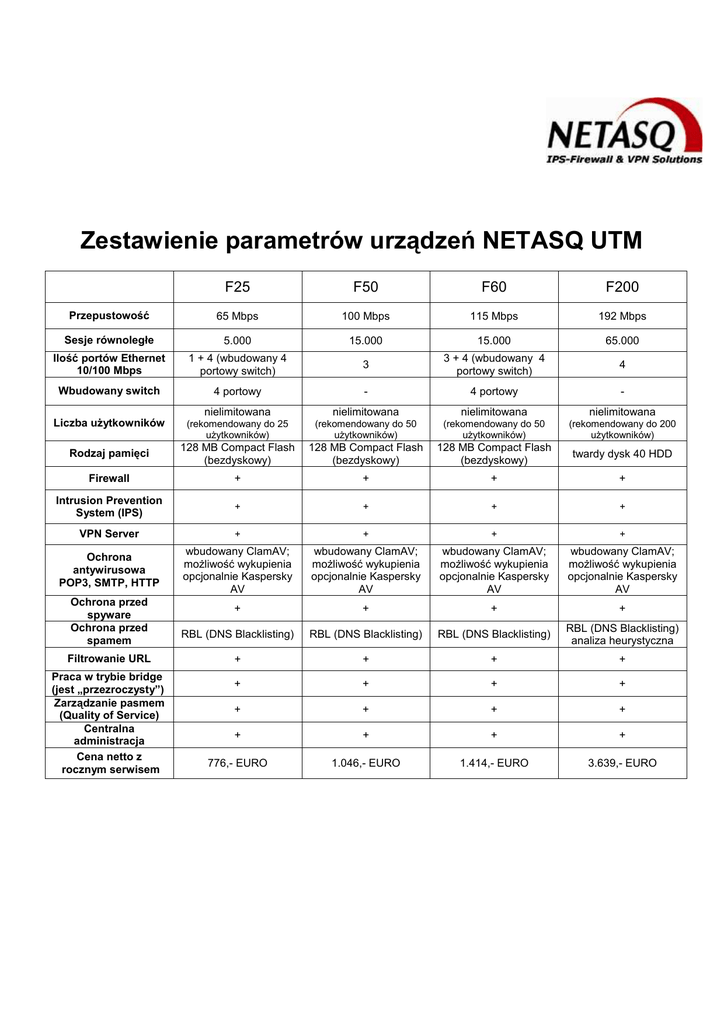 Zestawienie parametrów urządzeń NETASQ UTM F25 F50 F60 F200 Przepustowość 65 Mbps 100 Mbps 115 Mbps 192 Mbps Sesje równoległe 5.000 15.000 15.000 65.000 Ilość portów Ethernet 10/100 Mbps 1 + 4 (wbudowany 4 portowy switch) 3 3 + 4 (wbudowany 4 portowy switch) 4 Wbudowany switch 4 portowy - 4 portowy - nielimitowana nielimitowana nielimitowana nielimitowana Liczba uŜytkowników (rekomendowany do 25 uŜytkowników) (rekomendowany do 50 uŜytkowników) (rekomendowany do 50 uŜytkowników) (rekomendowany do 200 uŜytkowników) Rodzaj pamięci 128 MB Compact Flash (bezdyskowy) 128 MB Compact Flash (bezdyskowy) 128 MB Compact Flash (bezdyskowy) twardy dysk 40 HDD Firewall + + + + Intrusion Prevention System (IPS) + + + + VPN Server + + + + Ochrona antywirusowa POP3, SMTP, HTTP wbudowany ClamAV; moŜliwość wykupienia opcjonalnie Kaspersky AV wbudowany ClamAV; moŜliwość wykupienia opcjonalnie Kaspersky AV wbudowany ClamAV; moŜliwość wykupienia opcjonalnie Kaspersky AV wbudowany ClamAV; moŜliwość wykupienia opcjonalnie Kaspersky AV + + + + RBL (DNS Blacklisting) RBL (DNS Blacklisting) RBL (DNS Blacklisting) RBL (DNS Blacklisting) analiza heurystyczna + + + + + + + + + + + + + + + + 776,- EURO 1.046,- EURO 1.414,- EURO 3.639,- EURO Ochrona przed spyware Ochrona przed spamem Filtrowanie URL Praca w trybie bridge (jest „przezroczysty”) Zarządzanie pasmem (Quality of Service) Centralna administracja Cena netto z rocznym serwisem