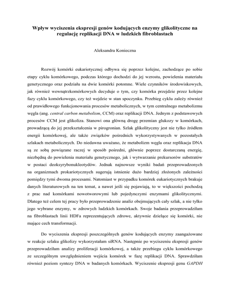 Wpływ wyciszenia ekspresji genów kodujących enzymy glikolityczne na regulację replikacji DNA w ludzkich fibroblastach Aleksandra Konieczna Rozwój komórki eukariotycznej odbywa się poprzez kolejne, zachodzące po sobie etapy cyklu komórkowego, podczas którego dochodzi do jej wzrostu, powielenia materiału genetycznego oraz podziału na dwie komórki potomne. Wiele czynników środowiskowych, jak również wewnątrzkomórkowych decyduje o tym, czy komórka przejdzie przez kolejne fazy cyklu komórkowego, czy też wejdzie w stan spoczynku. Przebieg cyklu zależy również od prawidłowego funkcjonowania procesów metabolicznych, w tym centralnego metabolizmu węgla (ang. central carbon metabolism, CCM) oraz replikacji DNA. Jednym z podstawowych procesów CCM jest glikoliza. Stanowi ona główną drogę przemian glukozy w komórkach, prowadzącą do jej przekształcenia w pirogronian. Szlak glikolityczny jest nie tylko źródłem energii komórkowej, ale także związków pośrednich wykorzystywanych w pozostałych szlakach metabolicznych. Do niedawna uważano, że metabolizm węgla oraz replikacja DNA są ze sobą powiązane raczej w sposób pośredni, głównie poprzez dostarczaną energię, niezbędną do powielenia materiału genetycznego, jak i wytwarzanie prekursorów substratów w postaci deoksyrybonukleotydów. Jednak najnowsze wyniki badań przeprowadzonych na organizmach prokariotycznych sugerują istnienie dużo bardziej złożonych zależności pomiędzy tymi dwoma procesami. Natomiast w przypadku komórek eukariotycznych brakuje danych literaturowych na ten temat, a nawet jeśli się pojawiają, to w większości pochodzą z prac nad komórkami nowotworowymi lub pojedynczymi enzymami glikolitycznymi. Dlatego też celem tej pracy było przeprowadzenie analiz obejmujących cały szlak, a nie tylko jego wybrane enzymy, w zdrowych ludzkich komórkach. Swoje badania przeprowadziłam na fibroblastach linii HDFa reprezentujących zdrowe, aktywnie dzielące się komórki, nie mające cech transformacji. Do wyciszenia ekspresji poszczególnych genów kodujących enzymy zaangażowane w reakcje szlaku glikolizy wykorzystałam siRNA. Następnie po wyciszeniu ekspresji genów przeprowadziłam analizy proliferacji komórkowej, a także przebiegu cyklu komórkowego ze szczególnym uwzględnieniem wejścia komórek w fazę replikacji DNA. Sprawdziłam również poziom syntezy DNA w badanych komórkach. Wyciszenie ekspresji genu GAPDH kodującego dehydrogenazę aldehydu 3-fosfoglicerynowego skutkowało obniżeniem o około połowę liczby komórek. Poza tym powodowało znaczny spadek poziomu syntezy DNA oraz ilości komórek w fazie S. Podobny efekt uzyskałam po wyciszeniu ekspresji genu HK2 kodującego heksokinazę 2. Analiza cyklu komórkowego wykazała także około 20-30% obniżenie ilości komórek w fazie replikacji DNA po wyciszeniu ekspresji genów PFKM, TPI, oraz LDHA, przy czym liczba komórek oraz poziom syntezy DNA spadał tylko o około 15%. Z kolei wyciszenie ENO1 kodującego α-enolazę opóźniało wejście komórek w fazę S o około 2 h w stosunku do komórek kontrolnych. Wpływało również negatywnie na liczbę fibroblastów oraz poziom syntezy DNA. Pomimo istnienia danych literaturowych o negatywnym wpływie obniżenia aktywności niemal każdego enzymu szlaku glikolizy na proliferację oraz żywotność komórek nowotworowych, w przypadku zdrowych komórek fibroblastów nie zaobserwowałam znacznego efektu wyciszenia ekspresji genów ALDOA, PGK1, PGAM1 oraz PKM na przebieg cyklu komórkowego oraz syntezy DNA. Pośród proponowanych mechanizmów powiązania centralnego metabolizmu węgla z replikacją DNA wskazuje się także na możliwą rolę metabolitów, których zaburzony poziom spowodowany zmianami w aktywności enzymów metabolizmu węgla mógłby prowadzić do zmian w przebiegu syntezy DNA. Uzyskane przeze mnie wyniki wskazują, że w przypadku suplementacji pożywki fosfoenolopirogoronianem w komórkach z wyciszoną ekspresją ENO1 dochodziło do nieznacznego zwiększenia wydajności syntezy DNA w stosunku do komórek kontrolnych, nietraktowanych siRNA. Natomiast dodanie pirogronianu w nieco wyższych stężeniach powodowało efekt odwrotny, niezależnie od rodzaju wyciszanego genu. Podsumowując, wyniki mojej pracy sugerują istnienie bardziej skomplikowanych zależności pomiędzy podstawowymi procesami zachodzącymi we wszystkich komórkach, jakimi są glikoliza i replikacja DNA, niż do tej pory zakładano. Ponadto jest to pierwsza tak kompleksowa analiza skutków wyciszenia genów glikolitycznych i ich ewentualnego wpływu na cykl komórkowy, w tym replikację DNA, w zdrowych komórkach ludzkich. Dane te pozwalają nie tylko poszerzyć naszą wiedzę na temat funkcjonalnego powiązania obu tych procesów w komórce eukariotycznej, ale także mogą w przyszłości umożliwić modelowanie mechanizmów regulacyjnych, czy przewidywać ewentualne skutki działania różnych czynników wpływających na funkcjonowanie danego organizmu. Ponadto mogą one być istotne przy planowaniu potencjalnych terapii antynowotworowych, ukierunkowanych na zahamowanie procesu glikolizy.