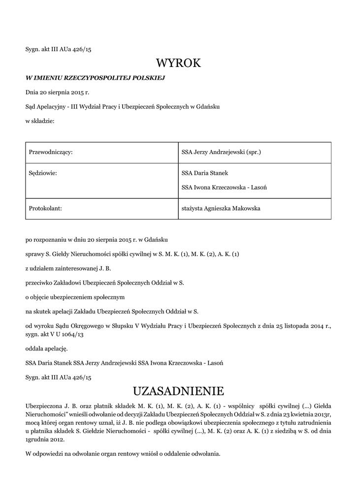 Sygn. akt III AUa 426/15 WYROK W IMIENIU RZECZYPOSPOLITEJ POLSKIEJ Dnia 20 sierpnia 2015 r. Sąd Apelacyjny - III Wydział Pracy i Ubezpieczeń Społecznych w Gdańsku w składzie: Przewodniczący: SSA Jerzy Andrzejewski (spr.) Sędziowie: SSA Daria Stanek SSA Iwona Krzeczowska - Lasoń Protokolant: stażysta Agnieszka Makowska po rozpoznaniu w dniu 20 sierpnia 2015 r. w Gdańsku sprawy S. Giełdy Nieruchomości spółki cywilnej w S. M. K. (1), M. K. (2), A. K. (1) z udziałem zainteresowanej J. B. przeciwko Zakładowi Ubezpieczeń Społecznych Oddział w S. o objęcie ubezpieczeniem społecznym na skutek apelacji Zakładu Ubezpieczeń Społecznych Oddział w S. od wyroku Sądu Okręgowego w Słupsku V Wydziału Pracy i Ubezpieczeń Społecznych z dnia 25 listopada 2014 r., sygn. akt V U 1064/13 oddala apelację. SSA Daria Stanek SSA Jerzy Andrzejewski SSA Iwona Krzeczowska - Lasoń Sygn. akt III AUa 426/15 UZASADNIENIE Ubezpieczona J. B. oraz płatnik składek M. K. (1), M. K. (2), A. K. (1) - wspólnicy spółki cywilnej (...) Giełda Nieruchomości” wnieśli odwołanie od decyzji Zakładu Ubezpieczeń Społecznych Oddział w S. z dnia 23 kwietnia 2013r, mocą której organ rentowy uznał, iż J. B. nie podlega obowiązkowi ubezpieczenia społecznego z tytułu zatrudnienia u płatnika składek S. Giełdzie Nieruchomości - spółki cywilnej (...), M. K. (2) oraz A. K. (1) z siedzibą w S. od dnia 1grudnia 2012. W odpowiedzi na odwołanie organ rentowy wniósł o oddalenie odwołania. Wyrokiem z dnia 25 listopada 2014 roku Sąd Okręgowy w Słupsku V Wydział Pracy i Ubezpieczeń Społecznych zmienił zaskarżoną decyzję Zakładu Ubezpieczeń Społecznych Oddział w S. w ten sposób, że stwierdził, iż ubezpieczona J. B. podlega ubezpieczeniom społecznym z tytułu zatrudnienia u płatnika składek S. Giełdy Nieruchomości spółki cywilnej w S., począwszy od 1 grudnia 2012 r. Powyższe rozstrzygnięcie Sąd Okręgowy oparł na następujących ustaleniach i rozważaniach: S. Giełda Nieruchomości, spółka cywilna, której wspólnikami są M. K. (1), M. K. (2) oraz A. K. (1) ma za przedmiot swojej działalności obrót, pośrednictwo oraz najem nieruchomości . Przychody z działalności pochodzą z różnych źródeł; najmu lokali handlowo- usługowych, usług pośrednictwa sprzedaży nieruchomości, sprzedaży nieruchomości, przychody z zarządu nieruchomościami. Zatrudnia pracowników biurowych za wynagrodzeniem 1600złotych brutto, jedna z pracownic – korzystająca z urlopu wychowawczego zatrudniona jest za wynagrodzeniem 7650 złotych. J. B. urodzona (...) legitymuje się wyższym wykształceniem - ukończyła Politechnikę (...) w zakresie ekonomii, organizacji i przetwarzania danych. W 2002 roku uzyskała licencję zarządcy nieruchomości, w 1996 licencję (...) . W okresie od 1992 do 2003 r. prowadziła działalność gospodarczą w zakresie zarządzania nieruchomościami. W 2011 roku zatrudniona była w Gminnym Towarzystwie Budownictwa (...) w J. jako specjalista ds. zamówień publicznych i administrowania budynkami mieszkalnymi. W okresie od VII 2007 do VIII 2009 miała prawo do renty z tytułu częściowej niezdolności do pracy. Wyrokiem z dnia 15 czerwca 2012 r., wydanym w sprawie VU 834/10 Sąd Okręgowy w Słupsku oddalił odwołanie J. B. od decyzji organu rentowego z 2009 r. odmawiającej prawa do renty, wobec stwierdzenia, iż ubezpieczona jest zdolna do pracy. Wyrokiem wydanym w dniu 21 czerwca 2013 r. w sprawie III AUa 2039/12 Sąd Apelacyjny w Gdańsku oddalił apelację od tego wyroku wywiedzioną przez J. B.. Ubezpieczona była znajomą M. K. (2), który zaproponował jej prace w (...) jako zarządcy nieruchomościami. Wcześniej tj. w 2005 roku J. B. zarządzała nieruchomościami należącymi do S. Giełdy Nieruchomości położonymi w U.. W dniu 1 grudnia 2012 r. spółka – reprezentowana przez M. K. (2) zawarła umowę o pracę z J. B., na czas określony – do 30 listopada 2013 r. w pełnym wymiarze czasu pracy, na stanowisku specjalisty do spraw sprzedaży nieruchomości, zarządcy nieruchomości, za wynagrodzeniem 8000 złotych. Wysokość wynagrodzenia J. B. jako zarządcy nieruchomości mieściło się w górnej granicy, średniego poziomu wynagrodzeń osiąganych przez tę grupę zawodową. Dochody uzyskiwane tylko z najmu przez płatnika składek w 2012 roku – średniomiesięcznie 10.464,49 złotych pozwalały na sfinansowanie miesięcznego kosztu zatrudnienia pracownika - J. B.. Planowana przez płatnika składek dywersyfikacja działalności polegająca na podjęciu, w przyszłości, profesjonalnego zarządu nieruchomościami miała uzasadnienie ekonomiczne. Przejęcie 6 wspólnot w zarząd, za wynagrodzeniem 2000 złotych - jedna, gwarantowało płatnikowi zysk z pracy J. B.. W okresie od 11 stycznia do 24 stycznia 2013 r. J. B. była niezdolna do pracy z powodu choroby, następnie od 29 stycznia do 5 kwietnia 2013 r. J. B. posiadała zaświadczenie wydane przez lekarza, specjalistę medycyny pracy w dniu 3 stycznia 2013 r. odnośnie braku przeciwwskazań zdrowotnych do wykonywania czynności zarządcy nieruchomości i prowadzenia pojazdu służbowego. Organ rentowy, na podstawie przeprowadzonej kontroli u płatnika składek zaskarżoną decyzją orzekł, iż J. B. nie podlega od 1 XII 2012 ubezpieczeniom społecznym z tytułu zatrudnienia. Wskazał, iż w toku kontroli uzyskano wyjaśnienia od M. K. (2) oraz J. B., nie przedłożono, z uwagi na tajemnicę handlową dokumentacji sporządzonej przez pracownika. Nie przedstawiono dowodów na to, że stosunek pracy realizował się poprzez wykonywanie zatrudnienia. Wobec czego organu uznał, iż pracodawca utworzył stanowisko na potrzeby znajomej osoby, zgłosił ją do ubezpieczeń społecznych w celu stworzenia podstaw do uzyskania przez nią świadczeń z pracowniczego ubezpieczenia społecznego. Zdaniem organu rentowego, takie działanie miało na celu uzyskanie nienależnie w