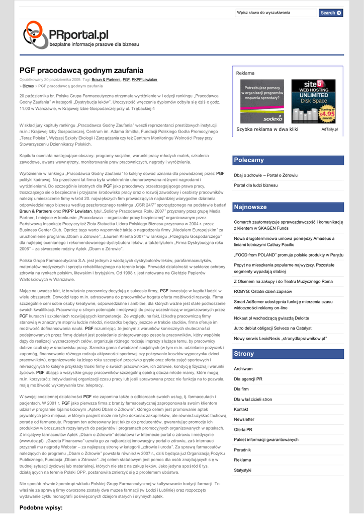 Wpisz słowo do wyszukiwania PGF pracodawcą godnym zaufania Reklama Opublikowany 20 października 2009. Tagi: Braun & Partners, PGF, PKPP Lewiatan » Biznes » PGF pracodawcą godnym zaufania 20 października br. Polska Grupa Farmaceutyczna otrzymała wyróżnienie w I edycji rankingu „Pracodawca Godny Zaufania” w kategorii „Dystrybucja leków”. Uroczystość wręczenia dyplomów odbyła się dziś o godz. 11.00 w Warszawie, w Krajowej Izbie Gospodarczej przy ul. Trębackiej 4 W skład jury kapituły rankingu „Pracodawca Godny Zaufania” weszli reprezentanci prestiżowych instytucji m.in.: Krajowej Izby Gospodarczej, Centrum im. Adama Smitha, Fundacji Polskiego Godła Promocyjnego „Teraz Polska”, Wyższej Szkoły Ekologii i Zarządzania czy też Centrum Monitoringu Wolności Prasy przy Szybka reklama w dwa kliki AdTaily.pl Stowarzyszeniu Dziennikarzy Polskich. Kapituła oceniała następujące obszary: programy socjalne, warunki pracy młodych matek, szkolenia zawodowe, awans wewnętrzny, monitorowanie praw pracowniczych, nagrody i wyróżnienia. Wyróżnienie w rankingu „Pracodawca Godny Zaufania” to kolejny dowód uznania dla prowadzonej przez PGF polityki kadrowej. Na przestrzeni lat firma była wielokrotnie uhonorowywana różnymi nagrodami i wyróżnieniami. Do szczególnie istotnych dla PGF jako pracodawcy przestrzegającego prawa pracy, troszczącego sie o bezpieczne i przyjazne środowisko pracy oraz o rozwój zawodowy i osobisty pracowników należą: umieszczenie firmy wśród 20. największych firm prowadzących najbardziej wiarygodne działania odpowiedzialnego biznesu według zeszłorocznego rankingu „CSR 24/7” sporządzonego na podstawie badań Braun & Partners oraz PKPP Lewiatan, tytuł „Solidny Pracodawca Roku 2007 ” przyznany przez grupę Media Partner, I miejsce w konkursie „Pracodawca – organizator pracy bezpiecznej” organizowanym przez Państwową Inspekcję Pracy czy też Złota Statuetka Lidera Polskiego Biznesu przyznana w 2004 r. przez Business Center Club. Oprócz tego warto wspomnieć także o nagrodzeniu firmy „Medalem Europejskim” za uruchomienie programu „Dbam o Zdrowie”, „Laurem Klienta 2007 ” w rankingu „Przeglądu Gospodarczego” dla najlepiej ocenianego i rekomendowanego dystrybutora leków, a także tytułem „Firma Dystrybucyjna roku 2006” – za stworzenie rodziny Aptek „Dbam o Zdrowie”. Polecamy Dbaj o zdrowie – Portal o Zdrowiu Portal dla ludzi biznesu Najnowsze Comarch zautomatyzuje sprawozdawczość i komunikację z klientem w SKAGEN Funds Nowa długoterminowa umowa pomi ędzy Amadeus a liniami lotniczymi Cathay Pacific „FOOD from POLAND” promuje polskie produkty w Pary żu Polska Grupa Farmaceutyczna S.A. jest jednym z wiodących dystrybutorów leków, parafarmaceutyków, materiałów medycznych i sprzętu rehabilitacyjnego na terenie kraju. Prowadzi działalność w sektorze ochrony zdrowia na rynkach polskim, litewskim i brytyjskim. Od 1998 r. jest notowana na Giełdzie Papierów Wartościowych w Warszawie. Mając na uwadze fakt, iż to właśnie pracownicy decydują o sukcesie firmy, PGF inwestuje w kapitał ludzki w wielu obszarach. Dowodzi tego m.in. adresowana do pracowników bogata oferta możliwości rozwoju. Firma szczególnie ceni sobie osoby kreatywne, odpowiedzialne i ambitne, dla których ważne jest stałe podnoszenie swoich kwalifikacji. Pracownicy o silnym potencjale i motywacji do pracy uczestniczą w organizowanych przez PGF kursach i szkoleniach rozwijających kompetencje. Ze względu na fakt, iż kadrę pracowniczą firmy stanowią w znacznym stopniu ludzie młodzi, nierzadko będący jeszcze w trakcie studiów, firma oferuje im możliwość dofinansowania nauki. PGF rozumiejąc, że jednym z warunków koniecznych skuteczności podejmowanych przez firmę działań jest posiadanie zintegrowanego zespo łu pracowników, który wspólnie dąży do realizacji wyznaczonych celów, organizuje różnego rodzaju imprezy służące temu, by pracownicy dobrze czuli się w środowisku pracy. Szeroka gama świadczeń socjalnych (w tym m.in. udzielanie pożyczek i zapomóg, finansowanie różnego rodzaju aktywności sportowej czy pokrywanie kosztów wypoczynku dzieci pracowników), organizowanie każdego roku szczepień przeciwko grypie oraz oferta zajęć sportowych i rekreacyjnych to kolejne przykłady troski firmy o swoich pracowników, ich zdrowie, kondycj ę fizyczną i warunki życiowe. PGF dbając o wszystkie grupy pracowników szczególną opieką otacza młode mamy, które mogą m.in. korzystać z indywidualnej organizacji czasu pracy lub jeśli sprawowana przez nie funkcja na to pozwala, maj ą możliwość wykonywania tzw. telepracy. W swojej codziennej działalności PGF nie zapomina także o odbiorcach swoich usług, tj. farmaceutach i pacjentach. W 2001 r. PGF jako pierwsza firma z branży farmaceutycznej zaproponowała swoim klientom udział w programie lojalnościowym „Apteki Dbam o Zdrowie”, którego celem jest promowanie aptek prywatnych jako miejsca, w którym pacjent może nie tylko dokonać zakup leków, ale również uzyskać fachową poradę od farmaceuty. Program ten adresowany jest tak że do producentów, gwarantując promocje ich produktów w broszurach rozsyłanych do pacjentów i programach promocyjnych organizowanych w aptekach. Z inicjatywy farmaceutów Aptek „Dbam o Zdrowie” debiutował w Internecie portal o zdrowiu i medycynie (www.doz.pl). „Gazeta Finansowa” uznała go za najbardziej innowacyjny portal o zdrowiu, za ś internauci przyznali mu nagrodę Webstar – za najlepszą stronę w kategorii „zdrowie i uroda”. Za sprawą farmaceutów należących do programu „Dbam o Zdrowie” powstała również w 2007 r., dziś będąca już Organizacją Pożytku Publicznego, Fundacja „Dbam o Zdrowie”. Jej celem statutowym jest pomoc dla osób znajdujących się w trudnej sytuacji życiowej lub materialnej, których nie sta ć na zaku