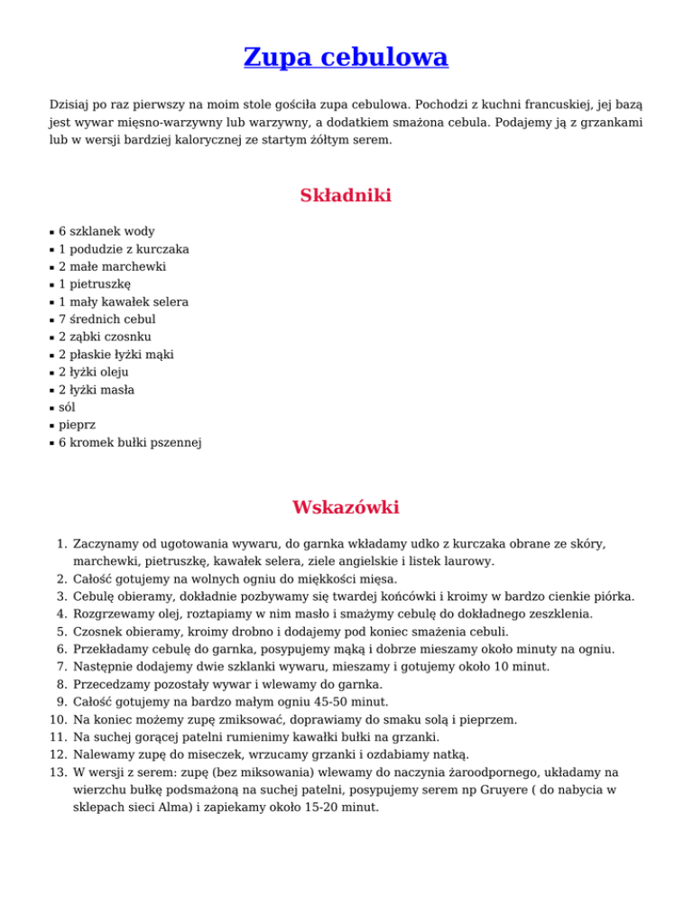 Zupa cebulowa Dzisiaj po raz pierwszy na moim stole gościła zupa cebulowa. Pochodzi z kuchni francuskiej, jej bazą jest wywar mięsno-warzywny lub warzywny, a dodatkiem smażona cebula. Podajemy ją z grzankami lub w wersji bardziej kalorycznej ze startym żółtym serem. Składniki ■ ■ ■ ■ ■ ■ ■ ■ ■ ■ ■ ■ ■ 6 szklanek wody 1 podudzie z kurczaka 2 małe marchewki 1 pietruszkę 1 mały kawałek selera 7 średnich cebul 2 ząbki czosnku 2 płaskie łyżki mąki 2 łyżki oleju 2 łyżki masła sól pieprz 6 kromek bułki pszennej Wskazówki 1. Zaczynamy od ugotowania wywaru, do garnka wkładamy udko z kurczaka obrane ze skóry, marchewki, pietruszkę, kawałek selera, ziele angielskie i listek laurowy. 2. Całość gotujemy na wolnych ogniu do miękkości mięsa. 3. Cebulę obieramy, dokładnie pozbywamy się twardej końcówki i kroimy w bardzo cienkie piórka. 4. Rozgrzewamy olej, roztapiamy w nim masło i smażymy cebulę do dokładnego zeszklenia. 5. Czosnek obieramy, kroimy drobno i dodajemy pod koniec smażenia cebuli. 6. Przekładamy cebulę do garnka, posypujemy mąką i dobrze mieszamy około minuty na ogniu. 7. Następnie dodajemy dwie szklanki wywaru, mieszamy i gotujemy około 10 minut. 8. Przecedzamy pozostały wywar i wlewamy do garnka. 9. Całość gotujemy na bardzo małym ogniu 45-50 minut. 10. Na koniec możemy zupę zmiksować, doprawiamy do smaku solą i pieprzem. 11. Na suchej gorącej patelni rumienimy kawałki bułki na grzanki. 12. Nalewamy zupę do miseczek, wrzucamy grzanki i ozdabiamy natką. 13. W wersji z serem: zupę (bez miksowania) wlewamy do naczynia żaroodpornego, układamy na wierzchu bułkę podsmażoną na suchej patelni, posypujemy serem np Gruyere ( do nabycia w sklepach sieci Alma) i zapiekamy około 15-20 minut.