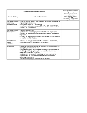 Wymagania minimalne Zamawiającego Element składowy Ilość i cechy techniczne Oprogramowanie - analiza arytmii, analiza wielodobowa, automatyczna detekcja do analizy migotania przedsionków, wyników badań - możliwość pracy na 2 monitorach, - możliwość rozbudowy o opcje ST, HRV, QT, OBS-APNEA, - licencja na 1 stanowisko. Oprogramowanie - system bazodanowy, bazodanowe - podłączenie badań z programów Pathfinder i Impresario, - licencja na podłączenie istniejącego stanowiska opisowego Impresario, - licencja na podłączenie nowego stanowiska oprogramowania do analizy wyników badań. Odczytywanie badań z urządzeń - licencja na wczytywanie danych z holterów z 2 stanowisk, - kompatybilność z holterami firmy Reynolds. Wdrożenie Instalacja i konfiguracja powyżej wymienionych elementów ze szczególnym wskazaniem na: - instalacja systemu bazodanowego na wskazanym serwerze, - instalacja aplikacji opisowych i do odczytu holterów na wskazanych stacjach roboczych, - podłączenie istniejących badań z programu Impresario, - podłączenie do bazy danych istniejącego stanowiska opisowego Impresario. - szkolenia dla grupy 8 osób minimum 4h/grupa Parametry oferowane przez Wykonawcę W każdej pozycji wpisać oświadczenie dot. zaoferowanego sprzętu: TAK / NIE Jeśli dotyczy - należy wpisać nazwę producenta i model.
