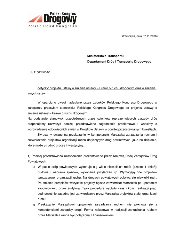 Warszawa, dnia 07.11.2006 r. Ministerstwo Transportu Departament Dróg i Transportu Drogowego L dz.1100/PKD/06 dotyczy: projektu ustawy o zmianie ustawy – Prawo o ruchu drogowym oraz o zmianie innych ustaw W oparciu o uwagi nadesłane przez członków Polskiego Kongresu Drogowego w załączeniu przesyłam stanowisko Polskiego Kongresu Drogowego do projektu ustawy o zmianie ustawy – Prawo o ruchu drogowym. Na podstawie stanowisk przedłożonych przez członków reprezentujących zarządy dróg proponujemy rozważyć poniżej przedstawione zagadnienia problemowe i wnosimy o wprowadzenie odpowiednich zmian w Projekcie Ustawy w poniżej przedstawianych kwestiach. Zwracamy uwagę na przekazanie w kompetencje Marszałka zarządzania ruchem i zatwierdzania projektów organizacji ruchu dotyczących dróg powiatowych, jako na działanie, które może utrudnić proces inwestycyjny. 1) Poniżej przedstawiono uzasadnienie prezentowane przez Krajową Radę Zarządców Dróg Powiatowych. W pasie dróg powiatowych wykonuje się wiele niewielkich robót (często 1 dzień): budowa i naprawa zjazdów, wykonanie przyłączeń itp. Wymagają one projektów tymczasowej organizacji ruchu. Na drogach powiatowych odbywa się niewielki ruch. Po zmianie przepisów wszystkie projekty będzie zatwierdzał Marszałek po uprzednim zaopiniowaniu przez audytora. Taka procedura wydłuży czas i koszt realizacji prac. Jednocześnie zasadne jest zatwierdzanie przez Marszałka projektów stałej organizacji ruchu. Przekazanie Marszałkowi uprawnień zarządzania ruchem nie pokrywa się z kompetencjami zarządcy drogi. Forma nakazowa w realizacji zarządzania ruchem przez Marszałka winna być połączona z finansowaniem. Na wprowadzenie tych przepisów winny być wydzielone środki finansowe potrzebne np.: na przeszkolenie odpowiedniej ilości audytorów. Likwidacja stanowisk finansowych. w powiecie nie przyniesie znaczących oszczędności Dotychczas sprawami zajmuje się Zarząd Dróg albo Wydział Komunikacji, gdzie zwykle nie jest wydzielone odrębne do tych zadań stanowisko, natomiast przesunięcie do Urzędu Marszałka spraw związanych z zarządzaniem ruchem spowoduje konieczność stworzenia odpowiedniej ilości nowych stanowisk. Jednocześnie Krajowa Rada Zarządców Dróg Powiatowych pozytywnie ocenia zmianę w zakresie wprowadzenia standardów utrzymania dróg powiązanego z systemem finansowania dróg powiatowych. 2) Stanowisko Pana Grzegorza Stacha, Wiceprezesa Zarządu PKD, które zostało przyjęte przez Przewodniczącego Komitetu IV PKD w całości do przedłożenia Prezesowi PKD w brzmieniu niezmienionym: Wbrew twierdzeniom z uzasadnienia do projektu, zmiana kompetencji w zakresie zarządzania drogami publicznymi nie przyniesie oszczędności poprzez likwidację dotychczasowych etatów (Art 1 przedstawionego projektu, Rozdział 1 a w sprawie Zarządzania ruchem na drogach). Istniejące jednostki w urzędach marszałkowskich są nieprzygotowane do tego, by przejąć zarządzanie nad drogami powiatowymi i gminnymi. Związane jest to przede wszystkim z niedostateczną liczbą pracowników wobec planowanych zmian. Ponad to scentralizowanie zarządzania drogami spowoduje zwiększenie kosztów funkcjonowania jednostek zarządzających z powodu wzrostu wydatków na podróże służbowe związane z zarządzaniem drogą. Uzasadnienie do projektu wskazuje na konieczność doprecyzowania luk w prawie. Tymczasem, w ocenie PKD projekt tworzy nowe luki poprzez niedookreślenie nowych pojęć, którymi się posługuje. Dotyczy to między innymi nieprecyzyjnych terminów z art. 1 ustawy o zmianie ustawy - Prawo o ruchu drogowym oraz o zmianie innych ustaw, tj. „wyższe wykształcenie w dziedzinie drogownictwa”, (art. 10 d planowanych zmian w prawie o ruchu drogowym) „praktyka zawodowa w zakresie zarządzania ruchem na drogach” (art. 10 e planowanych zmian w prawie o ruchu drogowym). Wątpliwości budzi weryfikacja projektantów na podstawie dyplomu ukończenia studiów, a jeśli tak, to czy będą to tylko inżynierowie wykształceni w zakresie budowy dróg. Dodatkowo należy zastanowić się, na podstawie jakich dokumentów będzie weryfikowana praktyka zawodowa. Szereg niejasności wprowadza równoległe obowiązywanie nowelizacji Prawa o ruchu drogowym oraz dotychczasowego Rozporządzenie Ministra Infrastruktury z dnia 23 września 2003 r. w sprawie szczegółowych warunków zarządzania oraz wykonywania nadzoru nad tym zarządzaniem (Dz U z 2003 r. Nr 177, poz. 1729). W sytuacji takiego dualizmu należy rozważyć kilka kwestii: Czy będą wymagane opinie zarządzających ruchem na drogach krzyżujących się z drogą, dla której sporządzany jest projekt? Czy będą wymagane opinie zarządu drogi, jeżeli nie jest on jednostką składającą projekt? Czy będzie wymagana opinia właściwego komendanta Policji? Co oznacza sformułowanie „pozytywna opinia” i czy projektant będzie musiał uwzględnić wszystkie uwagi audytora? Nowa funkcja audytora i jego miejsce w procesie inwestycyjnym wydaje się być nie do końca sprecyzowana. Należy w taki sposób określić rolę i miejsce audytora w procesie inwestycyjnym, by stanowił on istotną pomoc dla inwestora. Zasadne jest określanie założenia do projektu organizacji ruchu już na etapie koncepcji tak, by audytor mógł ingerować w rozwiązania geometryczne na początku procesu projektowego. Zachodzi bowiem obawa, że jego uwagi do projektu organizacji ruchu mogą powodować zmiany geometrii, które w końcowej fazie projektowania są niemożliwe do wprowadzenia, bądź w znaczący sposób mogą wydłużyć czas realizacji zadania. Należy rozważyć, czy będzie wymagana opinia audytora w przypadku, gdy osoba zatwierdzająca projekt będzie posiadała uprawnienia audytora bezpieczeństwa ruchu drogowego. W celu uproszczenia procedur administracyjnych w sprawach związanych z zarządzaniem ruchem na drogach należy rozważyć powrót do „typowyc