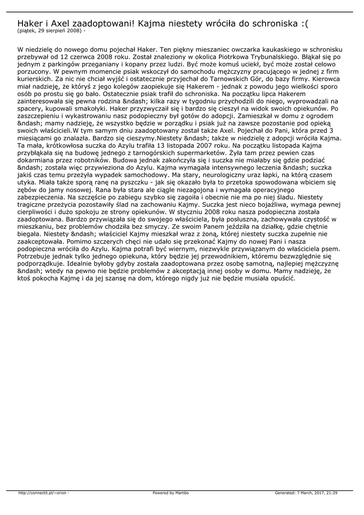 Haker i Axel zaadoptowani! Kajma niestety wróciła do schroniska :( (piątek, 29 sierpień 2008) - W niedzielę do nowego domu pojechał Haker. Ten piękny mieszaniec owczarka kaukaskiego w schronisku przebywał od 12 czerwca 2008 roku. Został znaleziony w okolica Piotrkowa Trybunalskiego. Błąkał się po jednym z parkingów przeganiany i kopany przez ludzi. Być może komuś uciekł, być może został celowo porzucony. W pewnym momencie psiak wskoczył do samochodu mężczyzny pracującego w jednej z firm kurierskich. Za nic nie chciał wyjść i ostatecznie przyjechał do Tarnowskich Gór, do bazy firmy. Kierowca miał nadzieję, że któryś z jego kolegów zaopiekuje się Hakerem - jednak z powodu jego wielkości sporo osób po prostu się go bało. Ostatecznie psiak trafił do schroniska. Na początku lipca Hakerem zainteresowała się pewna rodzina – kilka razy w tygodniu przychodzili do niego, wyprowadzali na spacery, kupowali smakołyki. Haker przyzwyczaił się i bardzo się cieszył na widok swoich opiekunów. Po zaszczepieniu i wykastrowaniu nasz podopieczny był gotów do adopcji. Zamieszkał w domu z ogrodem – mamy nadzieję, że wszystko będzie w porządku i psiak już na zawsze pozostanie pod opieką swoich właścicieli.W tym samym dniu zaadoptowany został także Axel. Pojechał do Pani, która przed 3 miesiącami go znalazła. Bardzo się cieszymy.Niestety – także w niedzielę z adopcji wróciła Kajma. Ta mała, krótkowłosa suczka do Azylu trafiła 13 listopada 2007 roku. Na początku listopada Kajma przybłąkała się na budowę jednego z tarnogórskich supermarketów. Żyła tam przez pewien czas dokarmiana przez robotników. Budowa jednak zakończyła się i suczka nie miałaby się gdzie podziać – została więc przywieziona do Azylu. Kajma wymagała intensywnego leczenia – suczka jakiś czas temu przeżyła wypadek samochodowy. Ma stary, neurologiczny uraz łapki, na którą czasem utyka. Miała także sporą ranę na pyszczku - jak się okazało była to przetoka spowodowana wbiciem się zębów do jamy nosowej. Rana była stara ale ciągle niezagojona i wymagała operacyjnego zabezpieczenia. Na szczęście po zabiegu szybko się zagoiła i obecnie nie ma po niej śladu. Niestety tragiczne przeżycia pozostawiły ślad na zachowaniu Kajmy. Suczka jest nieco bojaźliwa, wymaga pewnej cierpliwości i dużo spokoju ze strony opiekunów. W styczniu 2008 roku nasza podopieczna została zaadoptowana. Bardzo przywiązała się do swojego właściciela, była posłuszna, zachowywała czystość w mieszkaniu, bez problemów chodziła bez smyczy. Ze swoim Panem jeździła na działkę, gdzie chętnie biegała. Niestety – właściciel Kajmy mieszkał wraz z żoną, której niestety suczka zupełnie nie zaakceptowała. Pomimo szczerych chęci nie udało się przekonać Kajmy do nowej Pani i nasza podopieczna wróciła do Azylu. Kajma potrafi być wiernym, niezwykle przywiązanym do właściciela psem. Potrzebuje jednak tylko jednego opiekuna, który będzie jej przewodnikiem, któremu bezwzględnie się podporządkuje. Idealnie byłoby gdyby została zaadoptowana przez osobę samotną, najlepiej mężczyznę – wtedy na pewno nie będzie problemów z akceptacją innej osoby w domu. Mamy nadzieję, że ktoś pokocha Kajmę i da jej szansę na dom, którego nigdy już nie będzie musiała opuścić. http://connectit.pl/~orion - Powered by Mambo Generated: 7 March, 2017, 21:29