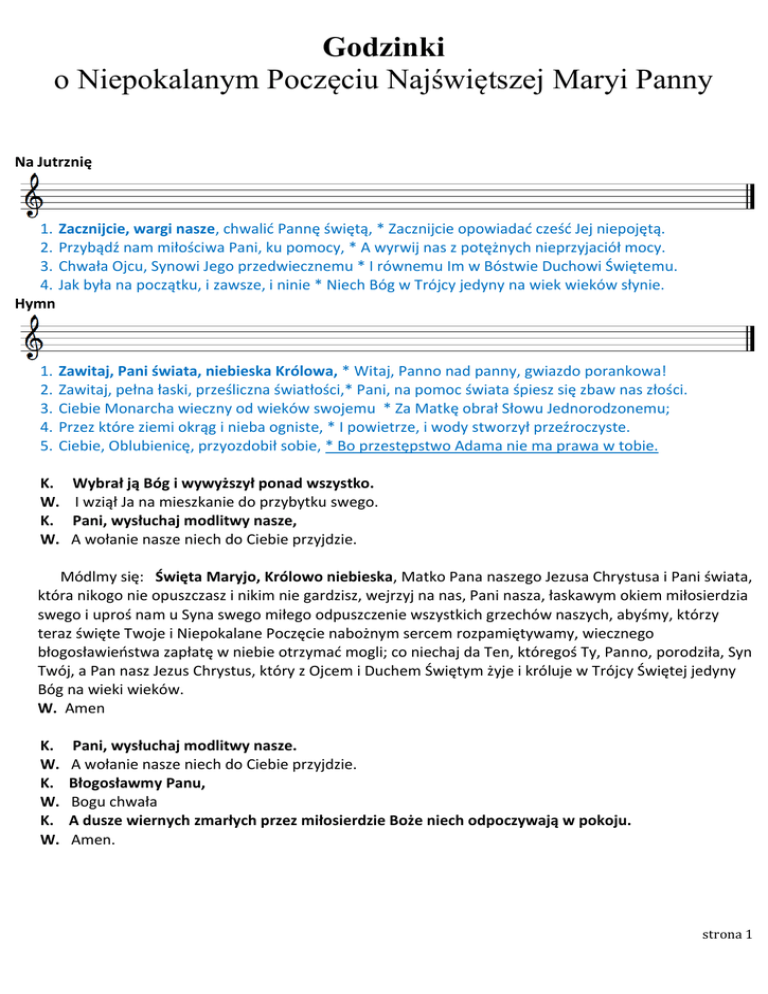 Godzinki o Niepokalanym Poczęciu Najświętszej Maryi Panny Na Jutrznię 1. Zacznijcie, wargi nasze, chwalić Pannę świętą, * Zacznijcie opowiadać cześć Jej niepojętą. 2. Przybądź nam miłościwa Pani, ku pomocy, * A wyrwij nas z potężnych nieprzyjaciół mocy. 3. Chwała Ojcu, Synowi Jego przedwiecznemu * I równemu Im w Bóstwie Duchowi Świętemu. 4. Jak była na początku, i zawsze, i ninie * Niech Bóg w Trójcy jedyny na wiek wieków słynie. Hymn 1. 2. 3. 4. 5. Zawitaj, Pani świata, niebieska Królowa, * Witaj, Panno nad panny, gwiazdo porankowa! Zawitaj, pełna łaski, prześliczna światłości,* Pani, na pomoc świata śpiesz się zbaw nas złości. Ciebie Monarcha wieczny od wieków swojemu * Za Matkę obrał Słowu Jednorodzonemu; Przez które ziemi okrąg i nieba ogniste, * I powietrze, i wody stworzył przeźroczyste. Ciebie, Oblubienicę, przyozdobił sobie, * Bo przestępstwo Adama nie ma prawa w tobie. K. W. K. W. Wybrał ją Bóg i wywyższył ponad wszystko. I wziął Ja na mieszkanie do przybytku swego. Pani, wysłuchaj modlitwy nasze, A wołanie nasze niech do Ciebie przyjdzie. Módlmy się: Święta Maryjo, Królowo niebieska, Matko Pana naszego Jezusa Chrystusa i Pani świata, która nikogo nie opuszczasz i nikim nie gardzisz, wejrzyj na nas, Pani nasza, łaskawym okiem miłosierdzia swego i uproś nam u Syna swego miłego odpuszczenie wszystkich grzechów naszych, abyśmy, którzy teraz święte Twoje i Niepokalane Poczęcie nabożnym sercem rozpamiętywamy, wiecznego błogosławieństwa zapłatę w niebie otrzymać mogli; co niechaj da Ten, któregoś Ty, Panno, porodziła, Syn Twój, a Pan nasz Jezus Chrystus, który z Ojcem i Duchem Świętym żyje i króluje w Trójcy Świętej jedyny Bóg na wieki wieków. W. Amen K. W. K. W. K. W. Pani, wysłuchaj modlitwy nasze. A wołanie nasze niech do Ciebie przyjdzie. Błogosławmy Panu, Bogu chwała A dusze wiernych zmarłych przez miłosierdzie Boże niech odpoczywają w pokoju. Amen. strona 1 Na Prymę 1. Przybądź nam miłościwa Pani, ku pomocy, * A wyrwij nas z potężnych nieprzyjaciół mocy. 2. Chwała Ojcu, Synowi Jego przedwiecznemu * I równemu Im w Bóstwie Duchowi Świętemu. 3. Jak była na początku, i zawsze, i ninie * Niech Bóg w Trójcy jedyny na wiek wieków słynie. Hymn 1. 2. 3. 4. K. W. K. W. K. W. K. W. Zawitaj, Panno mądra, domie poświęcony, * Siedmioma kolumnami pięknie ozdobiony. Od wszelakiej zarazy świata ochroniona, * Pierwej święta w żywocie matki, niż zrodzona. Tyś matką wszech żyjących, Tyś jest świętych drzwiami, * Nowa gwiazdo z Jakuba, Tyś nad aniołami. Ogromna czartu jesteś, w szyku obóz silny, * Bądź chrześcijan ucieczką i port nieomylny. Sam Ją stworzył w Duchu Świętym, I wyniósł Ją nad wszystkie dzieła rąk swoich. Pani, wysłuchaj modlitwy nasze, A wołanie nasze niech do Ciebie przyjdzie. Błogosławmy Panu, Bogu chwała A dusze wiernych zmarłych przez miłosierdzie Boże niech odpoczywają w pokoju. Amen. Módlmy się: Święta Maryjo, Królowo niebieska… Na Tercję 1. Przybądź nam miłościwa Pani, ku pomocy, * A wyrwij nas z potężnych nieprzyjaciół mocy. 2. Chwała Ojcu, Synowi Jego przedwiecznemu * I równemu Im w Bóstwie Duchowi Świętemu. 3. Jak była na początku, i zawsze, i ninie * Niech Bóg w Trójcy jedyny na wiek wieków słynie. Hymn 1. 2. 3. 4. 5. Witaj, Arko przymierza, tronie Salomona, * Tęczo, wszechmocną ręką z pięknych farb złożona. Tyś krzak Mojżeszów, boskim ogniem gorejąca, * Tyś różdżka Aronowa, śliczny kwiat rodząca. Bramo rajska zamkniona, runo Gedeona, * Tyś niezwyciężonego, plastr miodu, Samsona. Przystało, aby Cię Syn tak zacny od winy * Pierworodnej zachował i zmazy Ewinej. Który Ciebie za Matkę obierając sobie, * Chciał, by przywara grzechu nie powstała w Tobie. strona 2 K. W. K. W. K. W. K. W. Ja mieszkam na wysokościach, I tron mój w słupie obłoku. Pani, wysłuchaj modlitwy nasze, A wołanie nasze niech do Ciebie przyjdzie. Błogosławmy Panu, Bogu chwała A dusze wiernych zmarłych przez miłosierdzie Boże niech odpoczywają w pokoju. Amen. Módlmy się: Święta Maryjo… Na Sekstę 1. Przybądź nam miłościwa Pani, ku pomocy, * A wyrwij nas z potężnych nieprzyjaciół mocy. 2. Chwała Ojcu, Synowi Jego przedwiecznemu * I równemu Im w Bóstwie Duchowi Świętemu. 3. Jak była na początku, i zawsze, i ninie * Niech Bóg w Trójcy jedyny na wiek wieków słynie. Hymn 1. 2. 3. 4. Witaj, świątynio Boga w Trójcy Jedynego, * Tyś raj aniołów, pałac wstydu panieńskiego! Pociecho utrapionych, ogrodzie wdzięczności, * O palmo cierpliwości, o cedrze czystości! Ziemia jesteś kapłańska i błogosławiona, * Święta i pierworodną zmazą niedotkniona. Miasto Pańskie i brama na wschód wystawiona, * Wszelkąś łaską, jedyna Panno, wypełniona. K. W. K. W. K. W. K. W. Jak lilia między cierniem Tak przyjaciółka moja między córkami Adamowymi. Pani, wysłuchaj modlitwy nasze, A wołanie nasze niech do Ciebie przyjdzie. Błogosławmy Panu, Bogu chwała A dusze wiernych zmarłych przez miłosierdzie Boże niech odpoczywają w pokoju. Amen. Módlmy się: Święta Maryjo… strona 3 Na Nonę 1. Przybądź nam miłościwa Pani, ku pomocy, * A wyrwij nas z potężnych nieprzyjaciół mocy. 2. Chwała Ojcu, Synowi Jego przedwiecznemu * I równemu Im w Bóstwie Duchowi Świętemu. 3. Jak była na początku, i zawsze, i ninie * Niech Bóg w Trójcy jedyny na wiek wieków słynie. Hymn 1. 2. 3. 4. K. W. K. W. K. W. K. W. Witaj, miasto ucieczki, wieżo utwierdzona * Dawidowa, basztami i bronią wzmocniona. Tyś przy poczęciu ogniem miłości pałała, * Przez Cię władza piekielnych mocarzów stajała. O mężna białogłowo, Jutyt wojująca, * Od niewoli okrutnej lud swój ratująca. Rachel Ożywiciela Egiptu nosiła , * Nam Zbawiciela świata Maryja powiła. Jak lilia między cierniem Tak przyjaciółka moja między córkami Adamowymi. Pani, wysłuch