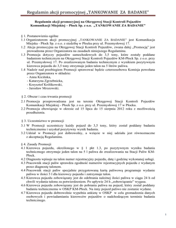 Regulaminakcjipromocyjnej„TANKOWANIEZABADANIE” Regulamin akcji promocyjnej na Okręgowej Stacji Kontroli Pojazdów Komunikacji Miejskiej – Płock Sp. z o.o. „TANKOWANIE ZA BADANIE” § 1. Postanowienia ogólne 1.1 Organizatorem akcji promocyjnej „TANKOWANIE ZA BADANIE” jest Komunikacja Miejska - Płock Sp. z o.o. z siedzibą w Płocku przy ul. Przemysłowej 17. 1.2 Akcja promocyjna na Okręgowej Stacji Kontroli Pojazdów, zwana dalej „Promocją” jest prowadzona przez Organizatora na zasadach niniejszego Regulaminu. 1.3 Promocja dotyczy pojazdów samochodowych do 3,5 tony, które zostały poddane badaniom technicznym na Okręgowej Stacji Kontroli Pojazdów KM-Płock Sp. z o.o. przy ul. Przemysłowej 17. Po zrealizowanym badaniu technicznym z wynikiem pozytywnym kierowca pojazdu do 3,5 tony otrzymuje jeden talon na 5 litrów paliwa. 1.4 Nadzór nad przebiegiem Promocji sprawować będzie czteroosobowa Komisja powołana przez Organizatora w składzie: - Anna Kicińska, - Katarzyna Zgrzebnicka, - Krzysztof Królikowski, - Jarosław Mrozowski. § 2. Obszar i czas trwania promocji 2.1 Promocja przeprowadzana jest na terenie Okręgowej Stacji Kontroli Pojazdów Komunikacji Miejskiej - Płock Sp. z o.o. przy ul. Przemysłowej 17 w Płocku. 2.2 Promocja obowiązuje w okresie od 15 lipca do 15 sierpnia 2012 roku z możliwością przedłużenia. § 3. Uczestnictwo w promocji 3.1 W Promocji uczestniczy każdy pojazd do 3,5 tony, który został poddany badaniu technicznemu i uzyskał pozytywny wynik badania. 3.2 Udział w Promocji jest dobrowolny, a wzięcie w niej udziału jest równoznaczne z akceptacją Regulaminu. § 4. Zasady Promocji 4.1 Kierowca pojazdu, określonego w § 1 pkt 1.3, po pozytywnym wyniku badania technicznego otrzymuje jeden talon na 5 l paliwa do zrealizowania na Stacji Paliw KMPłock. 4.2 Diagnosta wpisuje na talon numer rejestracyjny pojazdu, datę i godzinę wykonanej usługi. 4.3 Pracownik stacji paliw sprawdza zgodność numerów rejestracyjnych pojazdu z wydanym przez diagnostę talonem. 4.4 Pracownik stacji paliw specjalnie przygotowaną kartą paliwową programuje wydanie paliwa w ilości 5 l dla kierowcy pojazdu i zatrzymuje talon. 4.5 Kierowca pojazdu zobowiązany jest do odebrania należnej ilości paliwa w ciągu 24 h od chwili wydania talonu za potwierdzeniem. Po upływie 24 h „zobowiązanie” wygasa. 4.6 Kierowca pojazdu zobowiązany jest do pobrania paliwa na pojazd, który został poddany badaniu technicznemu w OSKP KM-Płock. Na inny pojazd paliwo nie zostanie wydane. 4.7 Kierowca pojazdu dobrowolnie wypełnia ankietę w OSKP w celu gromadzenia danych osobowych i powiadamianiu kierowców pojazdów o nadchodzącym terminie badania technicznego. 1 Regulaminakcjipromocyjnej„TANKOWANIEZABADANIE” § 5. Reklamacje 5.1. Ewentualne reklamacje związane z Promocją powinny być składane przez kierowców pojazdów w formie pisemnej listem poleconym pod adres siedziby Organizatora przez cały czas trwania promocji, jednakże nie później niż w terminie 30 dni od zakończenia Promocji. 5.2. O zachowaniu terminu określonego w punkcie 5.1 Regulaminu decyduje data wpływu reklamacji do Organizatora. 5.3. Reklamacje wpływające po zatwierdzonym powyżej terminie, nie będą respektowane. 5.4. Reklamacja powinna wskazywać dane wnoszącego reklamacje w szczególności umożliwiające udzielenie odpowiedzi na reklamacje, zgodnie z postanowieniami punktu 5.5 oraz zwięzły opis przedmiotu reklamacji. 5.5. Skutecznie złożone reklamacje będą rozpatrywane niezwłocznie, jednakże nie później niż w terminie 21 dni od daty otrzymania reklamacji. Zgłaszający reklamacje zostanie powiadomiony o sposobie rozpatrzenia reklamacji listem poleconym wysłanym najpóźniej w ciągu 14 dni od daty rozpatrzenia reklamacji. 5.6. Decyzje Organizatora w postępowaniu reklamacyjnym są ostateczne. § 6. Postanowienia końcowe 6.1. Organizator nie ponosi odpowiedzialności za niewykonanie zobowiązań wynikających z niniejszego Regulaminu, o ile niewykonanie zobowiązań jest spowodowane okolicznościami, na które Organizator nie miał wpływu mimo zachowania należytej staranności (siła wyższa), zdarzenia pozostające poza kontrolą Organizatora. 6.2. Organizator zastrzega sobie prawo zmiany Regulaminu w czasie trwania Promocji, jeżeli nie wpłynie to na pogorszenie warunków uczestnictwa w Promocji, zobowiązując się do ich niezwłocznego opublikowania. 6.3. Regulamin wchodzi w życie z dniem ogłoszenia Promocji. Załączniki do regulaminu: 1. Talon na 5 litrów paliwa – wzór 2. Ankieta dla kierowcy pojazdu - wzór 2