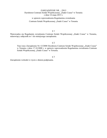 ZARZĄDZENIE NR .../2015 Dyrektora Centrum Sztuki Współczesnej „Znaki Czasu" w Toruniu z dnia 14 maja 2015 r. w sprawie wprowadzenia Regulaminu zwiedzania Centrum Sztuki Współczesnej „Znaki Czasu” w Toruniu §1 Wprowadza się Regulamin zwiedzania Centrum Sztuki Współczesnej „Znaki Czasu” w Toruniu, stanowiący załącznik nr 1 do niniejszego zarządzenia. §2 Traci moc Zarządzenie Nr 12/2008 Dyrektora Centrum Sztuki Współczesnej „Znaki Czasu" w Toruniu z dnia 17.10.2008 r. w sprawie wprowadzenia Regulaminu zwiedzania Centrum Sztuki Współczesnej „Znaki Czasu” w Toruniu. §3 Zarządzenie wchodzi w życie z dniem podpisania. REGULAMIN ZWIEDZANIA CENTRUM SZTUKI WSPÓŁCZESNEJ ZNAKI CZASU W TORUNIU 1. Centrum Sztuki Współczesnej Znaki Czasu w Toruniu, zwane dalej „Centrum” otwarte jest dla zwiedzających we wszystkie dni tygodnia za wyjątkiem poniedziałków. 2. Szczegółowe informacje dotyczące godzin otwarcia wystaw oraz cen biletów zamieszczane są w gablotach informacyjnych znajdujących się przed wejściem, w kasie, w folderze informacyjnym oraz na stronie internetowej (www.csw.torun.pl). 3. Dokumentem uprawniającym do wstępu na wystawy prezentowane w Centrum jest bilet lub zaproszenie. 4. Kasa Centrum zamykana jest pół godziny przed zamknięciem wystaw. 5. Taras udostępniany jest zwiedzającym bezpłatnie w godzinach otwarcia Centrum. 6. Bulwar Sztuki jest przestrzenią o otwartej formule położoną pomiędzy budynkiem Centrum i zjazdem na parking podziemny Centrum. 7. Osobami uprawnionymi do nabycia biletu ulgowego, za okazaniem stosownych dokumentów, są: 1) uczniowie szkół podstawowych i ponadpodstawowych, studenci oraz osoby odbywające studia doktoranckie 2) emeryci i renciści 3) osoby niepełnosprawne 4) nauczyciele szkół podstawowych i ponadpodstawowych, wychowawcy placówek opiekuńczo wychowawczych, oświatowo-wychowawczych i resocjalizujących działających w Polsce 5) przewodnicy PTTK 6) członkowie związków twórczych 8. Osobami uprawnionymi do otrzymania biletu bezpłatnego, za okazaniem stosownych dokumentów, są: 1) dzieci do lat 7 2) uczniowie liceów plastycznych 3) studenci wyższych szkół plastycznych 4) studenci historii sztuki 5) opiekunowie osób niepełnosprawnych 6) nauczyciele szkół podstawowych i ponadpodstawowych, wychowawcy placówek opiekuńczo wychowawczych, oświatowo-wychowawczych i resocjalizujących działających w Polsce sprawujący opiekę nad grupą (1 bilet bezpłatny dla opiekuna 10 podopiecznych) 7) przychodzący wraz z grupą przewodnicy PTTK 8) dziennikarze 9) członkowie Stowarzyszenia Historyków Sztuki 10) członkowie organizacji ICAM, ICOMOS i AICA 11) członkowie Stowarzyszenia Przyjaciół Sztuk Pięknych „Znaki Czasu” 12) pracownicy muzeów wpisanych do Państwowego Rejestru Muzeów 13) osoby odznaczone Orderem Orła Białego, Orderem Wojennym Virtuti Militari, Orderem Zasługi Rzeczypospolitej Polskiej, medalem „Zasłużony Kulturze Gloria Artis” 14) emeryci i renciści Centrum 9. Nabycie biletu nie upoważnia do korzystania z parkingu Centrum. 10. Osoby przebywające w Centrum oraz na terenie Bulwaru Sztuki zobowiązane są do przestrzegania ogólnie przyjętych norm zachowania w miejscach publicznych oraz stosowania się do uwag i zaleceń opiekunów wystaw oraz służb ochrony Centrum. 11. Plecaki, torby, walizki, parasole oraz okrycia wierzchnie zaleca się pozostawić w szatni. 12. Korzystanie z szatni jest bezpłatne. 13. Za rzeczy wartościowe i delikatne pozostawione w szatni Centrum nie ponosi odpowiedzialności. W okresie, w którym korzystanie z szatni nie jest obowiązkowe Centrum nie bierze na siebie obowiązku przechowania rzeczy w szatni i w przypadku pozostawienia tam rzeczy nie ponosi z tego tytułu odpowiedzialności. Centrum nie ponosi odpowiedzialności za rzeczy pozostawione na terenie Centrum poza szatnią. 14. Korzystanie z telefonów komórkowych nie może zakłócać zwiedzania wystaw. 15. Zabrania się wstępu do Centrum oraz na teren Bulwaru Sztuki osobom nietrzeźwym, pozostającym pod wpływem środków odurzających oraz osobom zachowującym się w sposób zagrażający bezpieczeństwu bądź zakłócającym porządek. 16. Na terenie Centrum oraz Bulwaru Sztuki obowiązują następujące zakazy: 1) palenia papierosów poza miejscami wyznaczonymi, 2) zażywania środków odurzających, 3) spożywania jedzenia i napojów w przestrzeni wystawienniczej, 4) wprowadzania i wnoszenia zwierząt (z wyłączeniem psa przewodnika), 5) dotykania eksponatów, jeśli nie jest to wyraźnie dozwolone, 6) fotografowania z użyciem lampy błyskowej, statywu, 17. Na terenie Bulwaru Sztuki obowiązuje ruch pieszy. 18. Do parkowania rowerów przeznaczone są znajdujące się na Bulwarze Sztuki stojaki rowerowe. Centrum nie ponosi odpowiedzialności za pozostawione rowery. 19. Pisemnej zgody Dyrektora Centrum wymaga: 1) prowadzenie na terenie Centrum działalności artystycznej i gospodarczej oraz akcji reklamowych, 2) fotografowanie i filmowanie wystaw Centrum w zakresie wykraczającym poza dozwolony użytek osobisty, 3) wjazd pojazdów na teren Bulwaru Sztuki. 20. W przypadku otrzymania pisemnej zgody Dyrektora Centrum na fotografowanie lub filmowanie, Centrum zastrzega sobie możliwość kontroli warunków fotografowania lub filmowania, zwłaszcza charakteru użytego oświetlenia, a w razie zagrożenia dla eksponatów - cofnięcia zgody lub modyfikację sposobu dokumentacji i oświetlenia na bezpieczny dla eksponatów. 21. Skargi i wnioski zwiedzających przyjmuje Dyrektor Centrum we wtorki w godz. 9.00-10.00. 22. Funkcjonowanie Kina Centrum, biblioteki Centrum oraz parkingu Centrum regulują odrębne regulaminy.