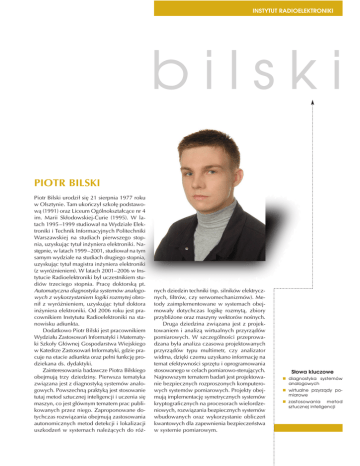 INSTYTUT RADIOELEKTRONIKI bilski PIOTR BILSKI Piotr Bilski urodzi³ siê 21 sierpnia 1977 roku w Olsztynie. Tam ukoñczy³ szko³ê podstawow¹ (1991) oraz Liceum Ogólnokszta³c¹ce nr 4 im. Marii Sk³odowskiej-Curie (1995). W latach 1995 –1999 studiowa³ na Wydziale Elektroniki i Technik Informacyjnych Politechniki Warszawskiej na studiach pierwszego stopnia, uzyskuj¹c tytu³ in¿yniera elektroniki. Nastêpnie, w latach 1999–2001, studiowa³ na tym samym wydziale na studiach drugiego stopnia, uzyskuj¹c tytu³ magistra in¿yniera elektroniki (z wyró¿nieniem). W latach 2001–2006 w Instytucie Radioelektroniki by³ uczestnikiem studiów trzeciego stopnia. Pracê doktorsk¹ pt. Automatyczna diagnostyka systemów analogowych z wykorzystaniem logiki rozmytej obroni³ z wyró¿nieniem, uzyskuj¹c tytu³ doktora in¿yniera elektroniki. Od 2006 roku jest pracownikiem Instytutu Radioelektroniki na stanowisku adiunkta. Dodatkowo Piotr Bilski jest pracownikiem Wydzia³u Zastosowañ Informatyki i Matematyki Szko³y G³ównej Gospodarstwa Wiejskiego w Katedrze Zastosowañ Informatyki, gdzie pracuje na etacie adiunkta oraz pe³ni funkcjê prodziekana ds. dydaktyki. Zainteresowania badawcze Piotra Bilskiego obejmuj¹ trzy dziedziny. Pierwsza tematyka zwi¹zana jest z diagnostyk¹ systemów analogowych. Powszechn¹ praktyk¹ jest stosowanie tutaj metod sztucznej inteligencji i uczenia siê maszyn, co jest g³ównym tematem prac publikowanych przez niego. Zaproponowane dotychczas rozwi¹zania obejmuj¹ zastosowania autonomicznych metod detekcji i lokalizacji uszkodzeñ w systemach nale¿¹cych do ró¿- nych dziedzin techniki (np. silników elektrycznych, filtrów, czy serwomechanizmów). Metody zaimplementowane w systemach obejmowa³y dotychczas logikê rozmyt¹, zbiory przybli¿one oraz maszyny wektorów noœnych. Druga dziedzina zwi¹zana jest z projektowaniem i analiz¹ wirtualnych przyrz¹dów pomiarowych. W szczególnoœci przeprowadzana by³a analiza czasowa projektowanych przyrz¹dów typu multimetr, czy analizator widma, dziêki czemu uzyskano informacjê na temat efektywnoœci sprzêtu i oprogramowania stosowanego w celach pomiarowo-steruj¹cych. Najnowszym tematem badañ jest projektowanie bezpiecznych rozproszonych komputerowych systemów pomiarowych. Projekty obejmuj¹ implementacjê symetrycznych systemów kryptograficznych na procesorach wielordzeniowych, rozwi¹zania bezpiecznych systemów wbudowanych oraz wykorzystanie obliczeñ kwantowych dla zapewnienia bezpieczeñstwa w systemie pomiarowym. Słowa kluczowe n diagnostyka systemów analogowych n wirtualne przyrządy pomiarowe n zastosowania metod sztucznej inteligencji INSTYTUT RADIOELEKTRONIKI B Trzecia tematyka obejmuje wspó³pracê z Wydzia³em In¿ynierii i Kszta³towania Œrodowiska Szko³y G³ównej Gospodarstwa Wiejskiego. Polega na opracowywaniu automatycznych algorytmów generowania profili geotechnicznych z wykorzystaniem metod sztucznej inteligencji. Wykorzystano w tym celu metody grupowania pojêciowego (clusteringu) oraz algorytmów indukcji regu³. Przygotowywana jest równie¿ aplikacja przechowuj¹ca i przetwarzaj¹ca dane pomiarowe z sond geotechnicznych stosowanych w badaniach na potrzeby budownictwa. Piotr Bilski jest stypendyst¹ Fundacji na Rzecz Rozwoju Radiokomunikacji i Technik Multimedialnych (2001) oraz cz³onkiem organizacji IEEE (od 2005 roku). Jest autorem lub wspó³autorem 32 publikacji konferencyjnych, 22 artyku³ów w czasopismach (w tym 8 w periodykach z listy filadelfijskiej) oraz 5 rozdzia³ów w monografiach. Piotr Bilski jest równie¿ laureatem Nagrody Rektora Szko³y G³ównej Gospodarstwa Wiejskiego I stopnia za dzia³alnoœæ naukow¹. W 2010 roku uzyska³ grant habilitacyjny. Piotr Bilski prowadzi na Politechnice Warszawskiej wyk³ad „Wspó³czesne metody heurystyczne” oraz jego anglojêzyczn¹ wersjê „Contemporary Heuristic Techniques”, ponadto jest lub by³ zaanga¿owany w prowadzenie zajêæ z przedmiotów: „Digital Circuits”, „Systemy pomiarowe”, „Programowanie obiektowe”, „Akwizycja i przetwarzanie danych z wykorzystaniem LabVIEW” oraz „Grafy i sieci”. W Szkole G³ównej Gospodarstwa Wiejskiego jest autorem i prowadz¹cym zajęcia z przedmiotów: „Architektura komputerów” (oraz jego anglojêzycznej wersji „Computer Architecture”), „Systemy operacyjne”, „Uczenie siê maszyn” (oraz jego anglojêzycznej wersji „Machine Learning”), „Systemy rozproszone” (oraz jego anglojêzycznej wersji „Distributed Computer Systems”), „Wspó³czesne obliczenia heurystyczne”. Prowadzi³ równie¿ zajêcia z przedmiotów „Technologie informacyjne”, „Sieci komputerowe”, „Teleinformatyka” oraz „Podstawy elektroniki”. Wypromowa³ 3 licencjatów i 27 magistrów na kierunku Informatyka i Ekonometria w Szkole G³ównej Gospodarstwa Wiejskiego. Obecnie prowadzi 8 dyplomantów na tym kierunku, a tak¿e 8 dyplomantów na kierunku Informatyka. W ¿yciu prywatnym interesuje siê kinematografi¹ (w szczególnoœci kinem SF), muzyk¹ metalow¹ (by³ redaktorem czasopisma poœwiêconego tej tematyce), grami komputerowymi (przez 10 lat pracowa³ jako redaktor czasopisma „Œwiat Gier Komputerowych”) oraz literatur¹ wspó³czesn¹. JeŸdzi na rowerze i nartach. Biegle w³ada jêzykiem angielskim, zaœ niemieckim i rosyjskim w stopniu podstawowym.