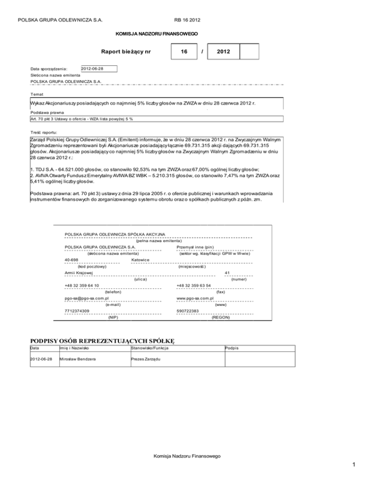 POLSKA GRUPA ODLEWNICZA S.A. RB 16 2012 KOMISJA NADZORU FINANSOWEGO Raport bie żący nr 16 / 2012 2012-06-28 Data sporządzenia: Skrócona nazwa emitenta POLSKA GRUPA ODLEWNICZA S.A. Temat Wykaz Akcjonariuszy posiadających co najmniej 5% liczby głosów na ZWZA w dniu 28 czerwca 2012 r. Podstawa prawna Art. 70 pkt 3 Ustawy o ofercie - WZA l ista powyżej 5 % Treść raportu: Zarząd Polskiej Grupy Odlewniczej S.A. (Emitent) informuje, że w dniu 28 czerwca 2012 r. na Zwyczajnym Walnym Zgromadzeniu reprezentowani byli Akcjonariusze posiadający łącznie 69.731.315 akcji dających 69.731.315 głosów. Akcjonariusze posiadający co najmniej 5% liczby głosów na Zwyczajnym Walnym Zgromadzeniu w dniu 28 czerwca 2012 r.: 1. TDJ S.A. - 64.521.000 głosów, co stanowiło 92,53% na tym ZWZA oraz 67,00% ogólnej liczby głosów; 2. AVIVA Otwarty Fundusz Emerytalny AVIWA BZ WBK – 5.210.315 głosów, co stanowiło 7,47% na tym ZWZA oraz 5,41% ogólnej liczby głosów. Podstawa prawna: art. 70 pkt 3) ustawy z dnia 29 lipca 2005 r. o ofercie publicznej i warunkach wprowadzania instrumentów finansowych do zorganizowanego systemu obrotu oraz o spółkach publicznych z późn. zm. POLSKA GRUPA ODLEWNICZA SPÓŁKA AKCYJNA (pełna nazwa emi tenta) POLSKA GRUPA ODLEWNICZA S.A. Przemysł inne (pin) (skrócona nazwa emitenta) 40-698 (sektor wg. klasyfikacji GPW w W-wie) Katowic e (kod pocztowy) (miejscowość ) Armi i Krajowej 41 (ulic a) (numer) +48 32 359 64 10 +48 32 359 63 54 (tel efon) (fax) [email protected] www.pgo-sa.com.pl (e-mail) (www) 7712374309 590722383 (NIP) (REGON) PODPISY OSÓB REPREZENTUJĄCYCH SPÓŁKĘ Data Imię i Nazwisko Stanowisko/Funkcja 2012-06-28 Mi rosław Bendzera Prezes Zarządu Podpis Komisja Nadzoru Finansowego 1