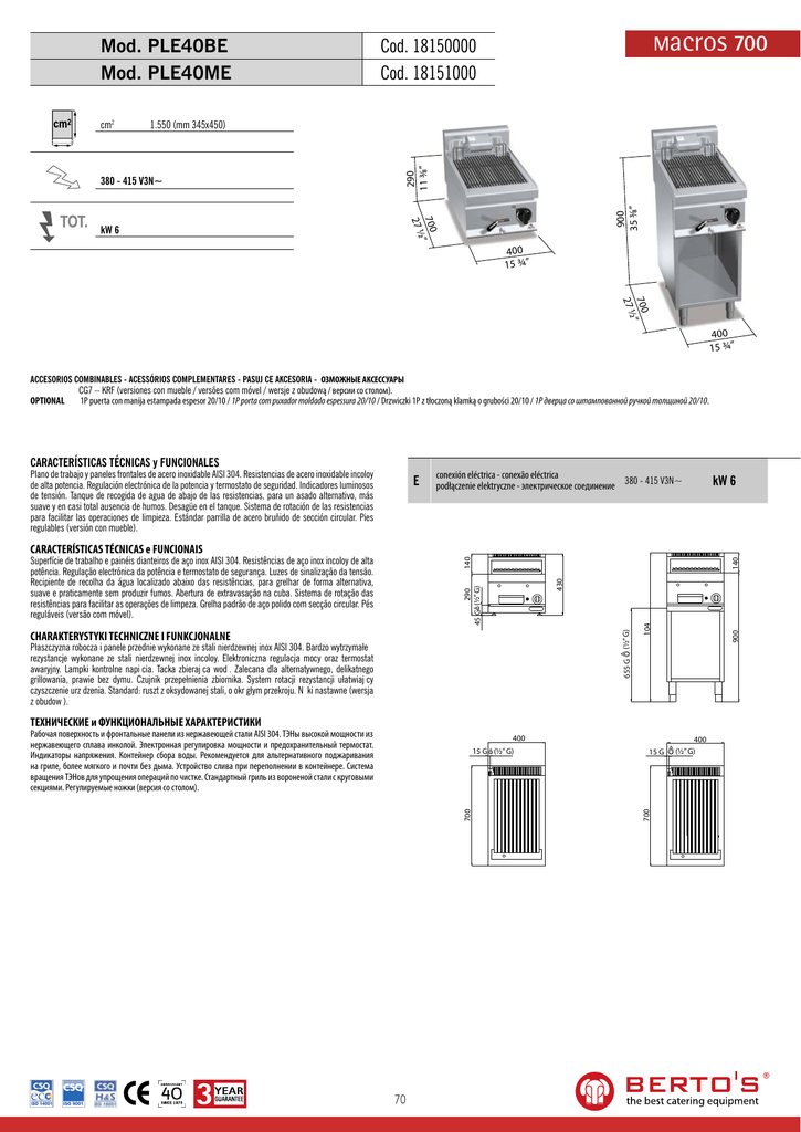 Mod. PLE40BE Mod. PLE40ME 1.550 (mm 345x450) 700 ” 27 ½ 900 35 3⁄8” 380 - 415 V3N~ 290 11 3⁄8” cm2 Macros 700 Cod. 18150000 Cod. 18151000 kW 6 400 15 ¾” 700 ” 27 ½ 400 15 ¾” ACCESORIOS COMBINABLES - ACESSÓRIOS COMPLEMENTARES - PASUJ CE AKCESORIA - ОЗМОЖНЫЕ АКСЕССУАРЫ OPTIONAL CG7 – KRF (versiones con mueble / versões com móvel / wersje z obudową / версии со столом). 1P puerta con manija estampada espesor 20/10 / 1P porta com puxador moldado espessura 20/10 / Drzwiczki 1P z tłoczoną klamką o grubości 20/10 / 1Р дверца со штампованной ручкой толщиной 20/10. CARACTERÍSTICAS TÉCNICAS y FUNCIONALES Plano de trabajo y paneles frontales de acero inoxidable AISI 304. Resistencias de acero inoxidable incoloy de alta potencia. Regulación electrónica de la potencia y termostato de seguridad. Indicadores luminosos de tensión. Tanque de recogida de agua de abajo de las resistencias, para un asado alternativo, más suave y en casi total ausencia de humos. Desagüe en el tanque. Sistema de rotación de las resistencias para facilitar las operaciones de limpieza. Estándar parrilla de acero bruñido de sección circular. Pies regulables (versión con mueble). E conexión eléctrica - conexão eléctrica 380 - 415 V3N~ podłączenie elektryczne - электрическое соединение kW 6 CARACTERÍSTICAS TÉCNICAS e FUNCIONAIS 655 G Płaszczyzna robocza i panele przednie wykonane ze stali nierdzewnej inox AISI 304. Bardzo wytrzymałe rezystancje wykonane ze stali nierdzewnej inox incoloy. Elektroniczna regulacja mocy oraz termostat awaryjny. Lampki kontrolne napi cia. Tacka zbieraj ca wod . Zalecana dla alternatywnego, delikatnego grillowania, prawie bez dymu. Czujnik przepełnienia zbiornika. System rotacji rezystancji ułatwiaj cy czyszczenie urz dzenia. Standard: ruszt z oksydowanej stali, o okr głym przekroju. N ki nastawne (wersja z obudow ). 900 CHARAKTERYSTYKI TECHNICZNE I FUNKCJONALNE 104 (½” G) 290 45 G (½” G) 430 140 140 Superfície de trabalho e painéis dianteiros de aço inox AISI 304. Resistências de aço inox incoloy de alta potência. Regulação electrónica da potência e termostato de segurança. Luzes de sinalização da tensão. Recipiente de recolha da água localizado abaixo das resistências, para grelhar de forma alternativa, suave e praticamente sem produzir fumos. Abertura de extravasação na cuba. Sistema de rotação das resistências para facilitar as operações de limpeza. Grelha padrão de aço polido com secção circular. Pés reguláveis (versão com móvel). ТЕХНИЧЕСКИЕ и ФУНКЦИОНАЛЬНЫЕ ХАРАКТЕРИСТИКИ Рабочая поверхность и фронтальные панели из нержавеющей стали AISI 304. ТЭНы высокой мощности из нержавеющего сплава инколой. Электронная регулировка мощности и предохранительный термостат. Индикаторы напряжения. Контейнер сбора воды. Рекомендуется для альтернативного поджаривания на гриле, более мягкого и почти без дыма. Устройство слива при переполнении в контейнере. Система вращения ТЭНов для упрощения операций по чистке. Стандартный гриль из вороненой стали с круговыми секциями. Регулируемые ножки (версия со столом). 400 70 15 G 700 700 15 G (½” G) 400 (½” G)