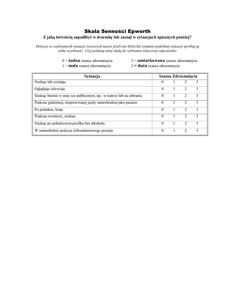 Skala Senności Epworth Z jaką łatwością zapadłbyś w drzemkę lub zasnął w sytuacjach opisanych poniżej? Dotyczy to codziennych sytuacji życiowych nawet jeżeli nie byłeś/łaś ostatnio podobnej sytuacji spróbuj ją sobie wyobrazić. Użyj podaną niżej skalę do wybrania własciwej odpowiedzi. 0 = żadna szansa zdrzemnięcia 1 = mała szansa zdrzemnięcia 2 = umiarkowana szansa zdrzemnięcia 3 = duża szansa zdrzemnięcia Sytuacja Szansa Zdrzemnięcia Siedząc lub czytając 0 1 2 3 Oglądając telewizję 0 1 2 3 Siedząc biernie w miej scu publicznym, np.: w teatrze lub na zebraniu 0 1 2 3 Podczas godzinnej, nieprzerwanej jazdy samochodem jako pasażer 0 1 2 3 Po południu, leżąc 0 1 2 3 Podczas rozmowy, siedząc 0 1 2 3 Siedząc po połuniowym posiłku bez alkoholu 0 1 2 3 W samochódzie podczas kilkuminutowego postoju 0 1 2 3