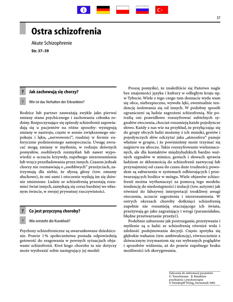37 Ostra schizofrenia Akute Schizophrenie Str. 37–39 ? Jak zachowują się chorzy? ? Wie ist das Verhalten der Erkrankten? Rodzice lub partner zauważają zwykle jako pierwsi zmiany stanu psychicznego i zachowania członka rodziny. Rozpoczynające się epizody schizofrenii zapowiadają się u pacjentów na różne sposoby: występują zmiany w nastroju, często w sensie zwiększonego niepokoju i lęku, „nerwowości“, rzadziej w formie euforycznie podniesionego samopoczucia. Uwagę zwracać mogą zmiany w myśleniu, w rodzaju dziwnych pomysłów, osobliwych rozmyślań lub nawet wypowiedzi o uczuciu krzywdy, zupełnego niezrozumienia lub wręcz prześladowania przez innych. Czasem jednak chorzy nie rozmawiają o „osobliwych“ przeżyciach, zatrzymują dla siebie, że słyszą głosy (tzw. omamy słuchowe), że oni sami i otoczenie wydają im się dziwnie zmienione. Ludzie ze schizofrenią przestają rozumieć świat innych, zamykają się coraz bardziej we własnym świecie, w swojej prywatnej rzeczywistości. ? Co jest przyczyną choroby? ? Wie entsteht die Krankheit? Psychozy schizofreniczne są uwarunkowane dziedzicznie. Prawie 1 % społeczeństwa posiada odpowiednią gotowość do reagowania w pewnych sytuacjach objawami schizofrenii. Ktoś kogo choroba ta nie dotyczy może wyobrazić sobie następujący jej model: Proszę pomyśleć, że znaleźliście się Państwo nagle bez znajomości języka i kultury w odległym kraju np. w Tybecie. Wiele z tego czego tam doznacie wyda wam się obce, niebezpieczne, wywoła lęki, ewentualnie tendencję izolowania się od innych. W podobny sposób ograniczeni są ludzie zagrożeni schizofrenią. Nie potrafią oni prawidłowo rozszyfrować subtelnych sygnałów otoczenia, chociaż rozumieją każde pojedyncze słowo. Każdy z nas wie na przykład, że przyłączając się do grupy obcych ludzi możemy z ich mimiki, gestów i pojedynczych słów odczytać jaka „atmosfera“ panuje właśnie w grupie, i że powinniśmy może trzymać się najpierw na uboczu. Takie rozszyfrowanie wieloznacznych, ale dla kontaktów międzyludzkich bardzo ważnych sygnałów w mimice, gestach i słowach sprawia ludziom ze skłonnością do schizofrenii zazwyczaj lub przynajmniej od czasu do czasu duże trudności; powodem są zaburzenia w systemach odbierających i przetwarzających bodźce w mózgu. Wiele objawów schizofrenii można wytłumaczyć za pomocą tego modelu: tendencję do niedostępności i izolacji (tzw. autyzm) jak również do fałszywej interpretacji troskliwej uwagi otoczenia, uczucie zagrożenia i niezrozumienia. W ostrych okresach choroby dotknięci schizofrenią zupełnie nie rozumieją otaczającego ich świata, przeżywają go jako zagrażający i wrogi (paranoidalne, błędne przetwarzanie przeżyć). Podobnie zaburzone jak postrzeganie, przeżywanie i myślenie są u ludzi ze schizofrenią również wola i zdolność podejmowania decyzji. Często spotyka się głębokie wahania (tzw. ambiwalencję), równocześnie z dziwacznym trzymaniem się raz wybranych poglądów i sposobów widzenia, aż do prawie zupełnego braku możliwości ich skorygowania. Zalecenia do informacji pacjentów U. Trenckmann B. Bandelow psychiatria i psychoterapia © Steinkopff Verlag, Darmstadt 2002 38 Ostra schizofrenia ? Jakie kroki należy podjąć? ? Jak przebiega leczenie? ? Welche Maßnahmen müssen ergriffen werden? ? Wie verläuft die Behandlung? W ostrej fazie choroby członkowie rodziny są często równie bezsilni jak sami chorzy. Chorzy najczęściej nie wiedzą, że ich zaburzenie jest chorobą i odrzucają początkowo pomoc. Czasem udaje się nawet ciężko wzburzonych chorych na schizofrenię, poprzez ostrożnie (ale zdecydowanie) prowadzoną rozmowę pozyskać dla sojuszu terapeutycznego. Czasami pozostaje jedynie, jako środek ostateczny, leczenie chorego wbrew jego woli np. na podstawie ustawy o pomocy psychicznie chorym (zobacz str. 101). Nie należy zwlekać zbyt długo z podjęciem tego bolesnego kroku. Po skutecznym leczeniu chorzy są z reguły wdzięczni lekarzowi i rodzinie, że zadecydowali za nich. Schizofrenia jest chorobą ostrego lęku i niepewności, utratą dla nas oczywistej jednolitości odczuwania, myślenia i czynów (z greckiego: schizo – rozszczepiam, phren – rozum, serce), dlatego od rodziny i lekarza wymagana jest wysoka doza jednolitości i jednoznaczności. W związku z tym niektóre reguły postępowania: Obchodzenie się z chorym powinno być tak normalne jak tylko możliwe. Nie należy brać udziału w „obłąkaniu“! Weźcie pod uwagę szczególną wrażliwość chorych na schizofrenię. Dlatego najlepiej żadnych kroków „za plecami“, lecz jak największa otwartość, zrozumiałość i jednoznaczność. Na przykład krewni nie powinni okłamywać chorego, jeżeli nie widząc innego wyjścia wezwali lekarza lub służby medyczne. Nie dajcie zarazić się pośpiechem, jeżeli chory jest niespokojny zachowajcie spokój. Bądźcie otwarci gdzie choroba dyktuje nieufność. Spróbujcie również bardzo obłąkanym chorym dać poczucie podstawowego bezpieczeństwa, że jesteście z nim i będziecie go wspierać. Jeżeli pacjent nie dostrzega konieczności leczenia i w wyjątkowych wypadkach niezbędne jest leczenie przymusowe, lekarz i rodzina powinni również i to, jasno i spokojnie mu oznajmić. Zalecenia do informacji pacjentów U. Trenckmann B. Bandelow psychiatria i psychoterapia © Steinkopff Verlag, Darmstadt 2002 Początkowo, w ostrej fazie choroby punkt ciężkości stanowi terapia lekami. Neuroleptyki, tak nazywają się odpowiednie leki (zobacz str. 67) są więcej niż tylko środkami uspokajającymi. Działają one w miejscu zaburzonych procesów chemicznych w mózgu i normalizują stan (zbytniego) pobudzenia mózgu, tak że w najlepszym przypadku ciężko chorzy odnajdują stan równowagi psychicznej. Ta regulacja zaburzeń schizofrenicznych wymaga czasu. Niezbędne jest więc regularne zażyw