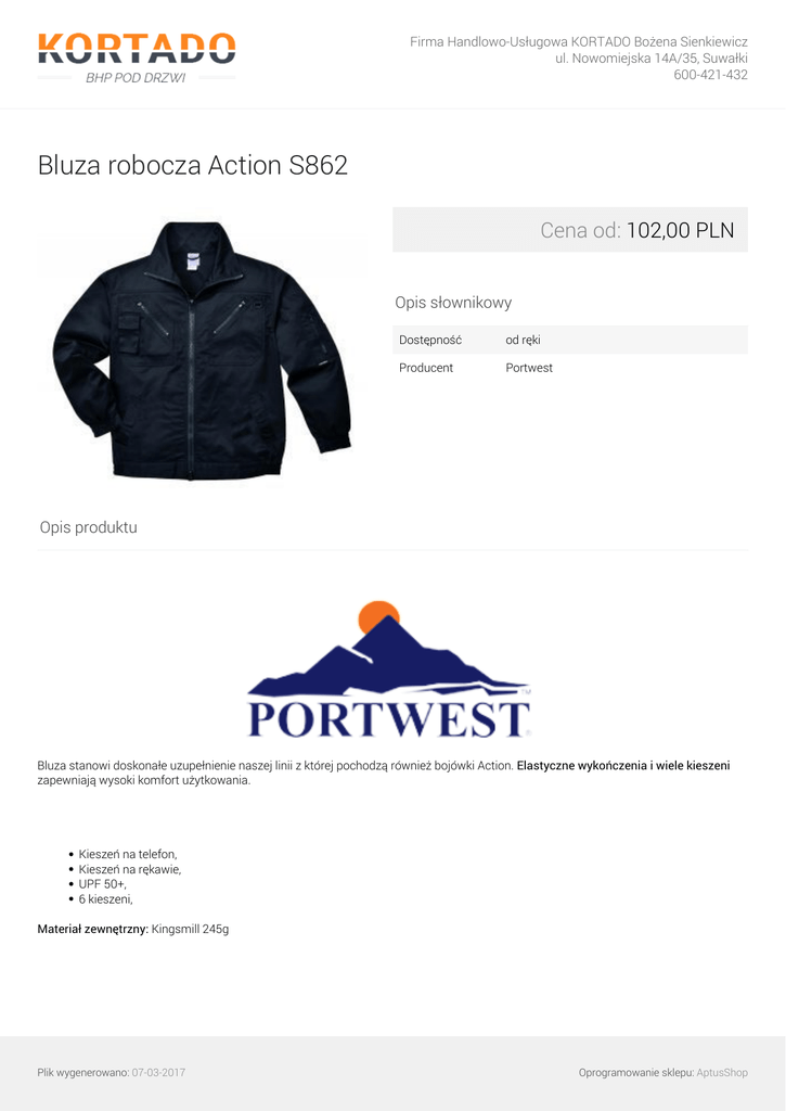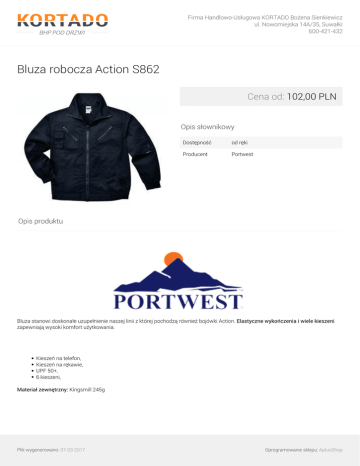 Firma Handlowo-Usługowa KORTADO Bożena Sienkiewicz ul. Nowomiejska 14A/35, Suwałki 600-421-432 Bluza robocza Action S862 Cena od: 102,00 PLN Opis słownikowy Dostępność od ręki Producent Portwest Opis produktu Bluza stanowi doskonałe uzupełnienie naszej linii z której pochodzą również bojówki Action. Elastyczne wykończenia i wiele kieszeni zapewniają wysoki komfort użytkowania. Kieszeń na telefon, Kieszeń na rękawie, UPF 50+, 6 kieszeni, Materiał zewnętrzny: Kingsmill 245g Plik wygenerowano: 07-03-2017 Oprogramowanie sklepu: AptusShop Firma Handlowo-Usługowa KORTADO Bożena Sienkiewicz ul. Nowomiejska 14A/35, Suwałki 600-421-432 Parametry Rozmiar S, M, L, XL, XXL, 3XL Warianty produktu Kolor czarny 102,00 PLN Action S862 Kolor granatowy 102,00 PLN Action S862 Galeria Plik wygenerowano: 07-03-2017 Powered by TCPDF (www.tcpdf.org) Oprogramowanie sklepu: AptusShop