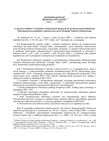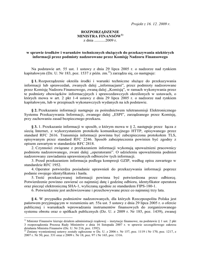 Projekt z 16. 12. 2009 r. ROZPORZĄDZENIE MINISTRA FINANSÓW1) z dnia ...........2009 r. w sprawie środków i warunków technicznych słuŜących do przekazywania niektórych informacji przez podmioty nadzorowane przez Komisję Nadzoru Finansowego Na podstawie art. 55 ust. 1 ustawy z dnia 29 lipca 2005 r. o nadzorze nad rynkiem kapitałowym (Dz. U. Nr 183, poz. 1537 z późn. zm.2)) zarządza się, co następuje: § 1. Rozporządzenie określa środki i warunki techniczne słuŜące do przekazywania informacji lub sprawozdań, zwanych dalej „informacjami”, przez podmioty nadzorowane przez Komisję Nadzoru Finansowego, zwaną dalej „Komisją”, w ramach wykonywania przez te podmioty obowiązków informacyjnych i sprawozdawczych określonych w ustawach, o których mowa w art. 2 pkt 1-4 ustawy z dnia 29 lipca 2005 r. o nadzorze nad rynkiem kapitałowym, lub w przepisach wykonawczych wydanych na ich podstawie. § 2. Przekazanie informacji następuje za pośrednictwem teletransmisji Elektronicznego Systemu Przekazywania Informacji, zwanego dalej „ESPI”, zarządzanego przez Komisję, przy zachowaniu zasad bezpiecznego przekazu. § 3. 1. Przekazanie informacji w sposób, o którym mowa w § 2, następuje przez łącza z siecią Internet, z wykorzystaniem protokołu komunikacyjnego HTTP, opisywanego przez standard RFC 2616. Transmisja informacji powinna być zabezpieczona protokołem TLS, opisywanym przez standard RFC 2246. Sposób zabezpieczenia powinien być zgodny z opisem zawartym w standardzie RFC 2818. 2. Czynności związane z przekazaniem informacji wykonują upowaŜnieni pracownicy podmiotu nadzorowanego, zwani dalej „operatorami”. O udzieleniu upowaŜnienia podmiot nadzorowany zawiadamia uprawnionych odbiorców tych informacji. 3. Przed przekazaniem informacja podlega kompresji GZIP, według opisu zawartego w standardzie RFC 1952. 4. Operator potwierdza posiadanie uprawnień do przekazywania informacji poprzez podanie swojego identyfikatora i hasła. 5. Treść przekazywanej informacji powinna być potwierdzona przez odbiorcę. Potwierdzenie powinno zawierać co najmniej datę i godzinę odbioru, identyfikator operatora oraz pieczęć elektroniczną SHA-1, wyliczaną zgodnie ze standardem FIPS-180-1. 6. Potwierdzenie jest archiwizowane i przechowywane przez co najmniej trzy lata. § 4. W przypadku podmiotów nadzorowanych, dla których Rzeczpospolita Polska jest państwem przyjmującym w rozumieniu art. 55a ust. 5 ustawy z dnia 29 lipca 2005 r. o ofercie publicznej i warunkach wprowadzania instrumentów finansowych do zorganizowanego systemu obrotu oraz o spółkach publicznych (Dz. U. z 2009 r. Nr 185, poz. 1439), zwanej 1) Minister Finansów kieruje działem administracji rządowej – instytucje finansowe, na podstawie § 1 ust. 2 pkt 3 rozporządzenia Prezesa Rady Ministrów z dnia 16 listopada 2007 r. w sprawie szczegółowego zakresu działania Ministra Finansów (Dz. U. Nr 216, poz. 1592). 2) Zmiany wymienionej ustawy zostały ogłoszone w Dz. U. z 2006 r. Nr 157, poz. 1119 i Nr 170, poz. 1217, z 2007 r. Nr 50, poz. 331 oraz z 2009 r. Nr 18, poz. 97 i Nr 165, poz. 1316. dalej „ustawą o ofercie publicznej”, operatorem, o którym mowa w § 3 ust. 2, moŜe być podmiot, któremu podmiot nadzorowany powierzył wykonywanie takich czynności na rynku zagranicznym. § 5. 1. Przekazanie informacji następuje na formularzach elektronicznych ESPI, poprzez wpisanie treści w odpowiednie pola. 2. Dopuszcza się wstawianie, w polach do tego przeznaczonych, plików o następujących standardach informatycznych: 1) plik w formacie Rich Text Format (RTF); 2) plik w formacie Adobe Portable Document Format (PDF), z wyłączeniem plików szyfrowanych; 3) plik w formacie Comma Separated Value (CSV), sporządzony według następujących zasad: a) zgodny ze stroną kodową CP-1250, b) rekord stanowi jeden wiersz, c) pola są rozdzielone znakiem średnika, d) data zapisana jest w formacie „RRRR-MM-DD”, e) separatorem dziesiętnym dla liczb zmiennoprzecinkowych jest przecinek, 4) plik w formacie Microsoft Excel (XLS). § 6. 1. Z zastrzeŜeniem § 9, w przypadku awarii ESPI lub zaistnienia zdarzeń uniemoŜliwiających przekazanie informacji za pośrednictwem ESPI, informacje przekazuje się przy uŜyciu łącz z siecią Internet na adresy wskazane przez spółkę prowadzącą rynek regulowany, agencję informacyjną w rozumieniu art. 58 ust. 1 ustawy o ofercie publicznej oraz Komisję. 2. Informacje przekazywane przy pomocy łącza z siecią Internet przekazuje się ponownie za pośrednictwem ESPI niezwłocznie po ustąpieniu okoliczności, o których mowa w ust. 1. § 7. 1. Jedna wiadomość przekazana za pośrednictwem łącza z siecią Internet moŜe zawierać tylko jedną informację. 2. Do informacji przekazanej za pośrednictwem łącza z siecią Internet załącza się: 1) pełną nazwę podmiotu nadzorowanego zgodną z identyfikacją w ESPI; 2) określenie rodzaju przekazywanej informacji oraz nazw plików wchodzących w jej skład; 3) nazwę (symbol, typ) formularza; 4) nazwę kancelarii systemu, do której powinna zostać przekazana informacja; 5) imię i nazwisko lub nazwę operatora. § 8. 1. Przekazana informacja powinna zostać utrwalona w formie dokumentu podpisanego przez osoby upowaŜnione do reprezentowania podmiotu nadzorowanego, a w odniesieniu do opinii z badania sprawozdania finansowego i raportu z przeglądu sprawozdania finansowego – przez podmiot uprawniony oraz przez biegłego rewidenta. 2. Dokumenty, o których mowa w ust. 1, są archiwizowane i przechowywane przez co najmniej trzy lata. § 9. 1. W przypadku awarii ESPI lub zaistnienia zdarzeń uniemoŜliwiających przekazanie za pośrednictwem ESPI informacji przez podmioty, o których mowa w art. 225 ustawy z dnia 27 maja 2004 r. o funduszach inwestycyjnych (Dz. U. Nr 146, poz. 1546 z późn. zm.3)), informacje przekazuje się na nośniku CD-ROM w standardzie ISO 9660, zwanym dalej "CD-ROM", z zac