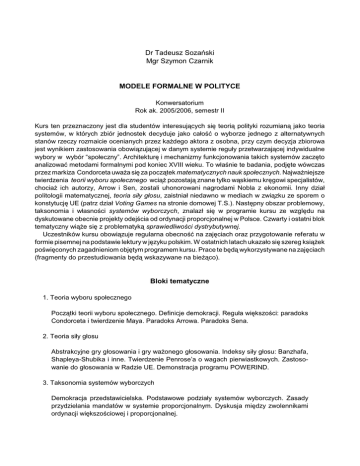 Dr Tadeusz Sozañski Mgr Szymon Czarnik MODELE FORMALNE W POLITYCE Konwersatorium Rok ak. 2005/2006, semestr II Kurs ten przeznaczony jest dla studentów interesuj¹cych siê teori¹ polityki rozumian¹ jako teoria systemów, w których zbiór jednostek decyduje jako ca³oœæ o wyborze jednego z alternatywnych stanów rzeczy rozmaicie ocenianych przez ka¿dego aktora z osobna, przy czym decyzja zbiorowa jest wynikiem zastosowania obowi¹zuj¹cej w danym systemie regu³y przetwarzaj¹cej indywidualne wybory w wybór “spo³eczny”. Architekturê i mechanizmy funkcjonowania takich systemów zaczêto analizowaæ metodami formalnymi pod koniec XVIII wieku. To w³aœnie te badania, podjête wówczas przez markiza Condorceta uwa¿a siê za pocz¹tek matematycznych nauk spo³ecznych. Najwa¿niejsze twierdzenia teorii wyboru spo³ecznego wci¹¿ pozostaj¹ znane tylko w¹skiemu krêgowi specjalistów, chocia¿ ich autorzy, Arrow i Sen, zostali uhonorowani nagrodami Nobla z ekonomii. Inny dzia³ politologii matematycznej, teoria si³y g³osu, zaistnia³ niedawno w mediach w zwi¹zku ze sporem o konstytucjê UE (patrz dzia³ Voting Games na stronie domowej T.S.). Nastêpny obszar problemowy, taksonomia i w³asnoœci systemów wyborczych, znalaz³ siê w programie kursu ze wzglêdu na dyskutowane obecnie projekty odejœcia od ordynacji proporcjonalnej w Polsce. Czwarty i ostatni blok tematyczny wi¹¿e siê z problematyk¹ sprawiedliwoœci dystrybutywnej. Uczestników kursu obowi¹zuje regularna obecnoœæ na zajêciach oraz przygotowanie referatu w formie pisemnej na podstawie lektury w jêzyku polskim. W ostatnich latach ukaza³o siê szereg ksi¹¿ek poœwiêconych zagadnieniom objêtym programem kursu. Prace te bêd¹ wykorzystywane na zajêciach (fragmenty do przestudiowania bêd¹ wskazywane na bie¿¹co). Bloki tematyczne 1. Teoria wyboru spo³ecznego Pocz¹tki teorii wyboru spo³ecznego. Definicje demokracji. Regu³a wiêkszoœci: paradoks Condorceta i twierdzenie Maya. Paradoks Arrowa. Paradoks Sena. 2. Teoria si³y g³osu Abstrakcyjne gry g³osowania i gry wa¿onego g³osowania. Indeksy si³y g³osu: Banzhafa, Shapleya-Shubika i inne. Twierdzenie Penrose’a o wagach pierwiastkowych. Zastosowanie do g³osowania w Radzie UE. Demonstracja programu POWERIND. 3. Taksonomia systemów wyborczych Demokracja przedstawicielska. Podstawowe podzia³y systemów wyborczych. Zasady przydzielania mandatów w systemie proporcjonalnym. Dyskusja miêdzy zwolennikami ordynacji wiêkszoœciowej i proporcjonalnej. 4. Sprawiedliwoœæ dystrybutywna (opracowanie tego bloku tematycznego – S. Czarnik). Podzia³ stawki w niedokoñczonej grze. Regu³y podzia³u dobra doskonale podzielnego w sytuacji gdy roszczenia przekraczaj¹ ca³oœæ puli. Zasady sprawiedliwoœci dystrybutywnej. Ró¿ne koncepcje redystrybucji dochodów (badania w³asne autora). Literatura Elementy teorii wyboru spo³ecznego. Wprowadzenie i wybór tekstów: G. Lissowski. Warszawa 2001: Wydawnictwo. Naukowe Scholar. HAMAN Jacek. Demokracja, decyzje, wybory. Warszawa 2003: Scholar. STRAFFIN Phillip D. Teoria gier. Warszawa 2001: Scholar. Studia Socjologiczne 2000 nr 1–2. Numer monograficzny poœwiêcony “Teorii wyboru spo³ecznego” pod red. G. Lissowskiego. YOUNG H. Peyton. Sprawiedliwy podzia³. Warszawa 2003: Scholar. http://www.cyf-kr.edu.pl/~ussozans/