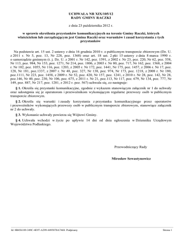 UCHWAŁA NR XIX/105/12 RADY GMINY RACZKI z dnia 23 października 2012 r. w sprawie określenia przystanków komunikacyjnych na terenie Gminy Raczki, których właścicielem lub zarządzającym jest Gmina Raczki oraz warunków i zasad korzystania z tych przystanków Na podstawie art. 15 ust. 2 ustawy z dnia 16 grudnia 2010 r. o publicznym transporcie zbiorowym (Dz. U. z 2011 r. Nr 5, poz. 13, Nr 228, poz. 1368) oraz art. 18 ust. 2 pkt 15 ustawy z dnia 8 marca 1990 r. o samorządzie gminnym (t. j. Dz. U. z 2001 r. Nr 142, poz. 1591, z 2002 r. Nr 23, poz. 220, Nr 62, poz. 558, Nr 113, poz. 984, Nr 153, poz. 1271, Nr 214, poz. 1806, z 2003 r. Nr 80, poz. 717, Nr 162, poz. 1568, z 2004 r. Nr 102, poz. 1055, Nr 116, poz. 1203, z 2005 r. Nr 172, poz. 1441, Nr 175, poz. 1457, z 2006 r. Nr 17, poz. 128, Nr 181, poz.1337, z 2007 r. Nr 48, poz. 327, Nr 138, poz. 974, Nr 173, poz. 1218, z 2008 r. Nr 180, poz.1111, Nr 223, poz. 1458, z 2009 r. Nr 52, poz. 420, Nr 157, poz. 1241, z 2010 r. Nr 28, poz. 142, Nr 28, poz.146, Nr 40, poz. 230, Nr 106, poz. 675, z 2011 r. Nr 21, poz.113, Nr 117, poz. 679, Nr 134, poz. 777, Nr 149, poz. 887, Nr 217, poz. 1281, z 2012 r. poz. 567) uchwala się, co następuje: § 1. Określa się przystanki komunikacyjne, zgodnie z wykazem stanowiącym załącznik nr 1 do uchwały oraz udostępnia się je operatorom i przewoźnikom wykonującym regularne przewozy osób w publicznym transporcie zbiorowym. § 2. Określa się warunki i zasady korzystania z przystanku komunikacyjnego przez operatorów i przewoźników wykonujących przewozy osób w publicznym transporcie zbiorowym, stanowiące załącznik nr 2 do uchwały. § 3. Wykonanie uchwały powierza się Wójtowi Gminy. § 4. Uchwała wchodzi w życie po upływie 14 dni od dnia ogłoszenia w Dzienniku Urzędowym Województwa Podlaskiego. Przewodniczący Rady Mirosław Sewastynowicz ——————————————————————————————————————————————————————————— Id: 8B456189-349C-4E97-A299-4495870A7468. Podpisany Strona 1 Załącznik Nr 1 do Uchwały Nr XIX/105/12 Rady Gminy Raczki z dnia 23 października 2012 r. Wykaz przystanków komunikacyjnych zlokalizowanych w ciągu dróg gminnych L.p. 1. 2. Droga Plac Kościuszki ul. Sportowa Lokalizacja przystanku 0+100 strona prawa 0+180 strona prawa Nazwa miejscowości Raczki Raczki Nr przystanku III IV ——————————————————————————————————————————————————————————— Id: 8B456189-349C-4E97-A299-4495870A7468. Podpisany Strona 2 Załącznik Nr 2 do Uchwały Nr XIX/105/12 Rady Gminy Raczki z dnia 23 października 2012 r. WARUNKI I ZASADY KORZYSTANIA Z PRZYSTANKÓW KOMUNIKACYJNYCH DLA OPERATORÓW I PRZEWOŹNIKÓW WYKONUJĄCYCH REGULARNE PRZEWOZY OSÓB W PUBLICZNYM TRANSPORCIE ZBIOROWYM 1. Z przystanków komunikacyjnych zlokalizowanych przy drogach których zarządcą jest Wójt Gminy Raczki, mogą korzystać operatorzy i przewoźnicy wykonujący regularne przewozy osób w ramach publicznego transportu zbiorowego. 2. Warunkiem niezbędnym do korzystania z przystanków komunikacyjnych jest posiadanie zgody. 3. W celu uzyskania zgody na korzystanie z przystanków, należy złożyć stosowny wniosek do Wójta Gminy Raczki, do którego należy załączyć: 1) Projekt proponowanego rozkładu jazdy uwzględniający minimalnie 10 min. odstępy czasowe pomiędzy poszczególnymi zatrzymaniami pojazdów, w ramach realizowanych przez różnych przewoźników przewozów w publicznym transporcie zbiorowym, 2) Mapę przebiegu linii komunikacyjnej wraz z zaznaczonymi przystankami określonymi w załączonym projekcie rozkładu jazdy. 4. Przedsiębiorca korzystający z przystanku zobowiązuje się do: 1) każdorazowego powiadamiania o zamiarze zmiany rozkładu jazdy w szczególności w przypadkach dotyczących zmiany godzin i dni kursowania oraz zmiany ilości przystanków w ramach posiadanego uzgodnienia, 2) wprowadzenie powyższych zmian do rozkładu jazdy uzależnione jest od uzyskania na nie zgody. 5. Odmowa wydania zgody lub uzgodnienia wprowadzenia proponowanych przez przedsiębiorcę (operatora, przewoźnika) zmian do rozkładu jazdy na korzystanie z przystanków komunikacyjnych, może nastąpić w przypadku wystąpienia jednej z poniższych okoliczności: 1) wydanie zgody lub uzgodnienia wprowadzenia proponowanych przez przedsiębiorcę (operatora, przewoźnika) zmian do rozkładu jazdy ograniczy przepustowość przystanków komunikacyjnych (uniemożliwi lub w znaczny sposób utrudni korzystanie z przystanków przez uprawnionych operatorów i przewoźników), 2) wydanie zgody lub uzgodnienia wprowadzenia proponowanych przez przedsiębiorcę (operatora, przewoźnika) zmian do rozkładu jazdy spowoduje zagrożenie dla organizacji lub bezpieczeństwa ruchu drogowego. 6. Operator lub przewoźnik winien uzgodnić sposób prezentacji na przystankach rozkładu jazdy oraz ogłoszeń związanych z wykonywanymi przewozami. 7. Utrzymanie tablicy z rozkładem jazdy w należytym stanie technicznym należy do przedsiębiorcy (operatora, przewoźnika). 8. Zabrania się umieszczania na przystankach komunikacyjnych innych informacji niż te, które dotyczą rozkłady jazdy, oraz reklam w rozumieniu art. 4 pkt 23 ustawy z dnia 21 marca 1985 roku o drogach publicznych (Dz. U. z 2007r. Nr 19, poz. 115 z późn. zm.). 9. Korzystanie z przystanków może odbywać się wyłącznie w celu realizacji regularnych przewozów osób (wsiadanie i wysiadanie pasażerów). ——————————————————————————————————————————————————————————— Id: 8B456189-349C-4E97-A299-4495870A7468. Podpisany Strona 3 10. Pojazdy winny zatrzymywać się w odległości nie większej niż 15 m od słupka ze znakiem D 15 lub tablicy